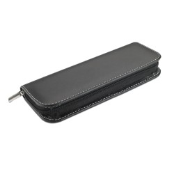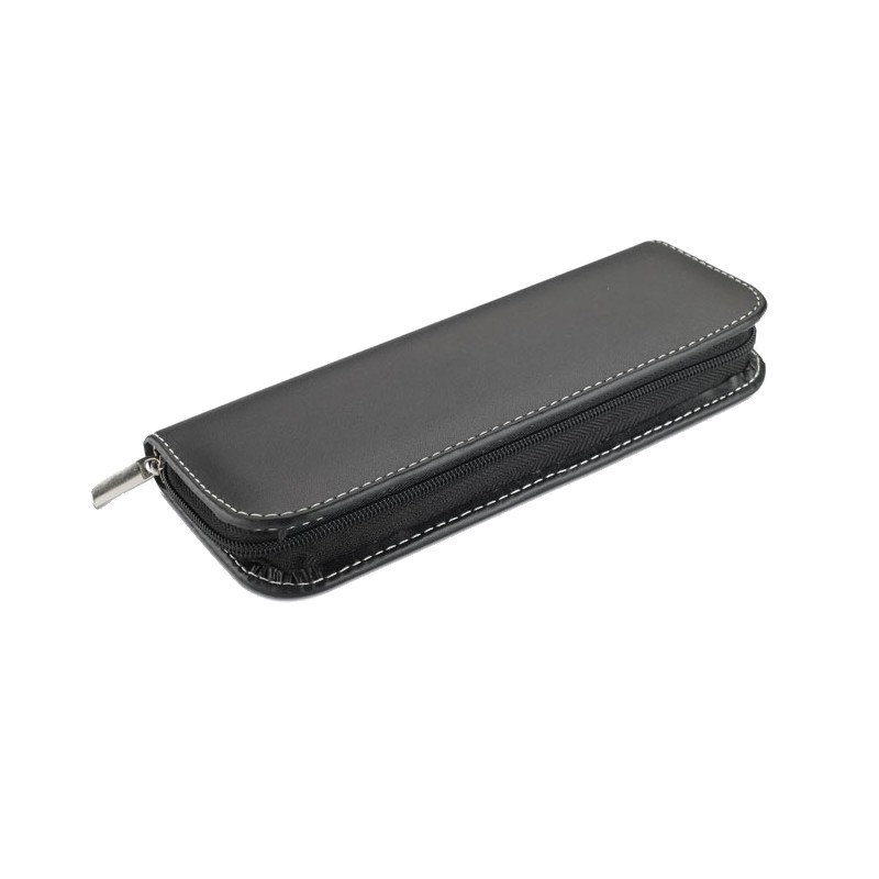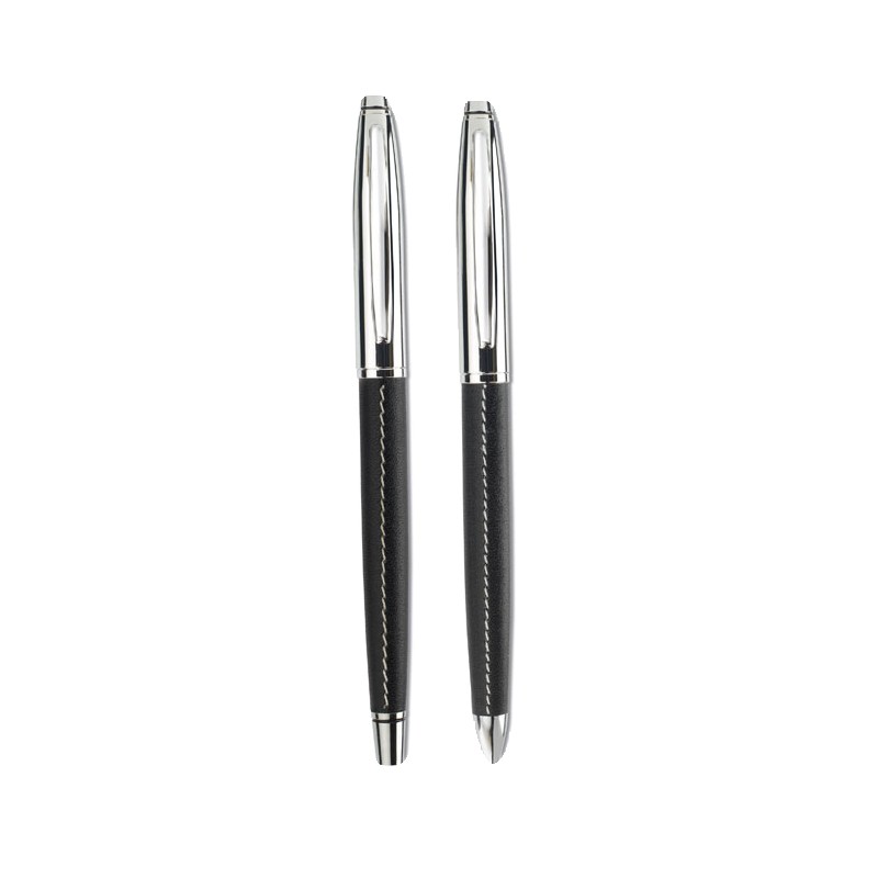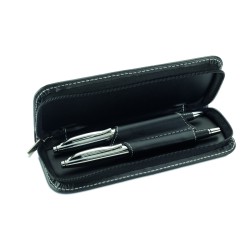 Parure stylos bille/roller. Présentation pochette PU à fermeture éclair, couleur assortie et couture contrastée. Encre bleue et noire respectivement..