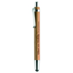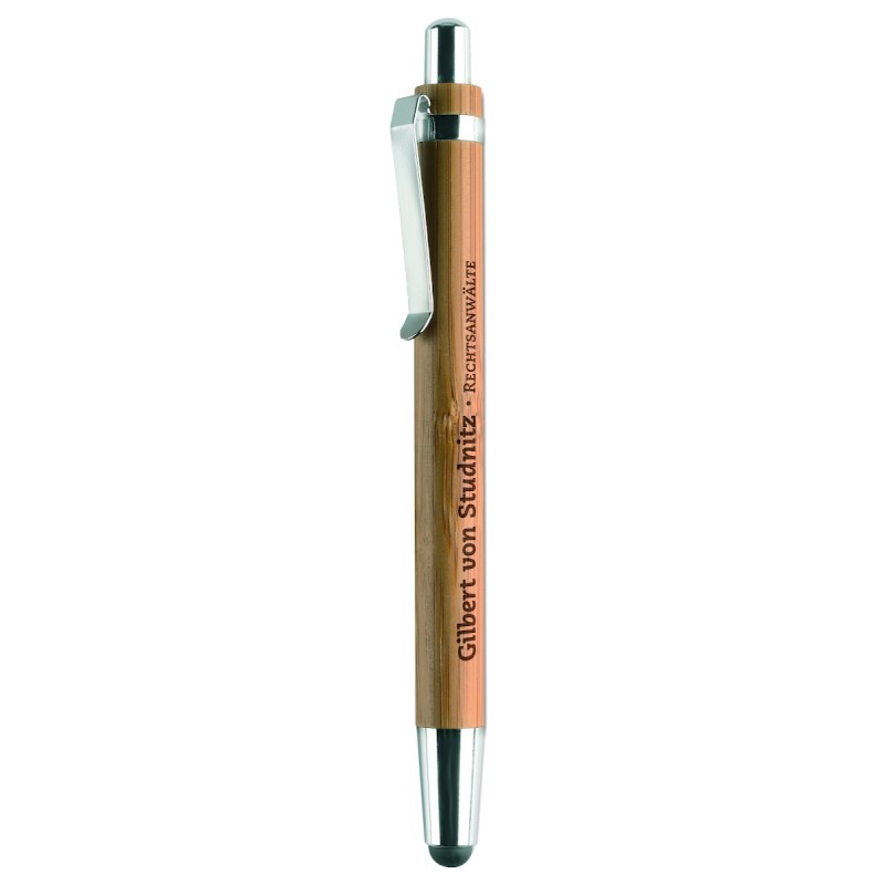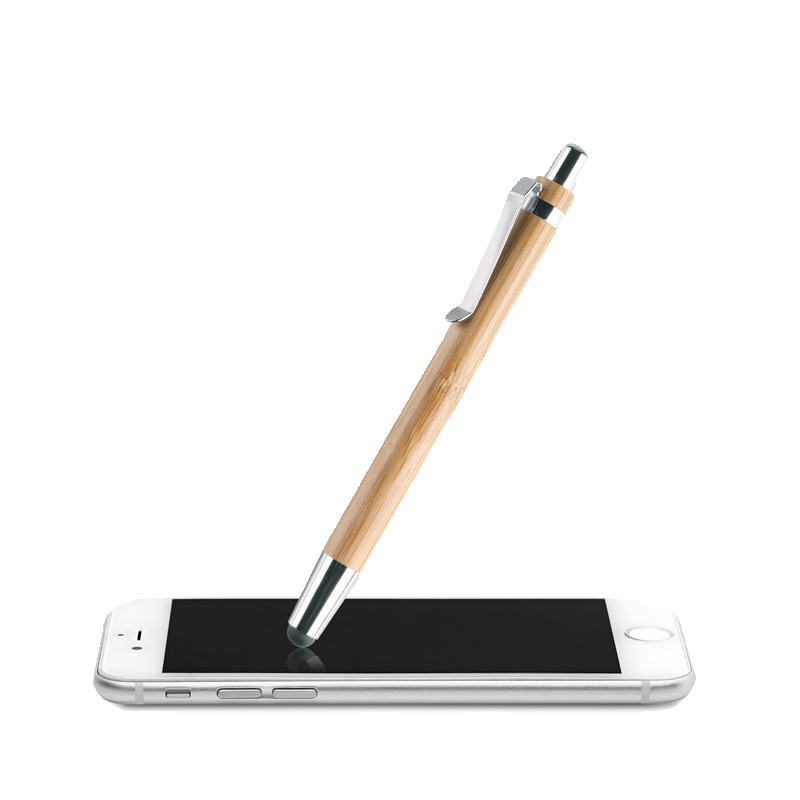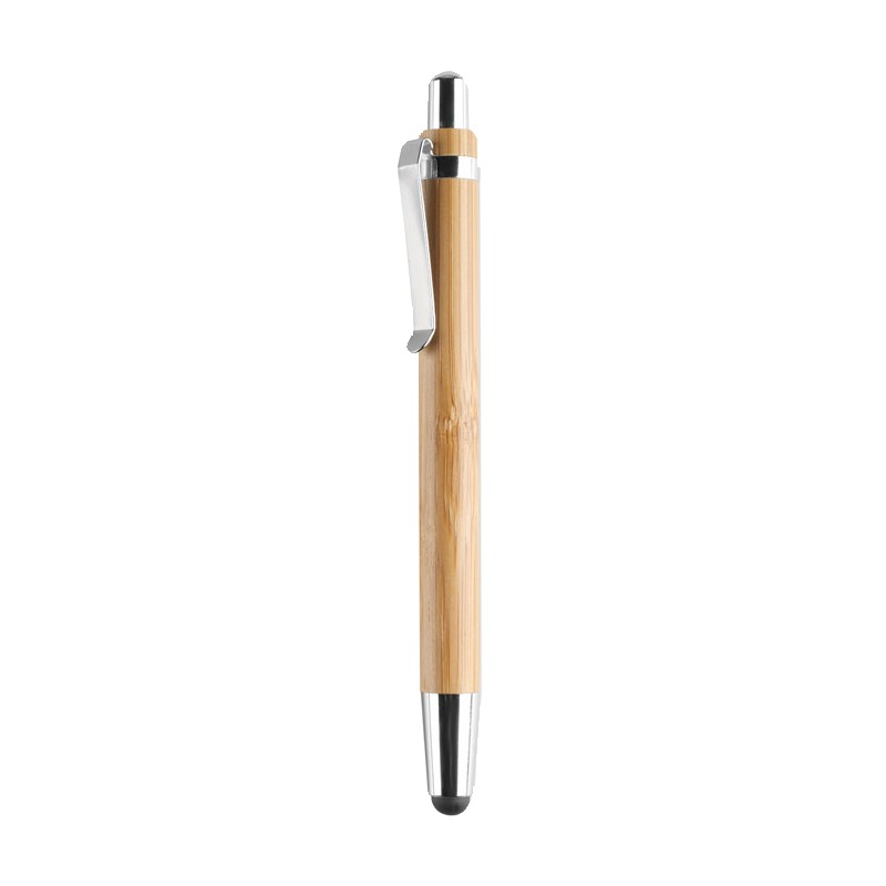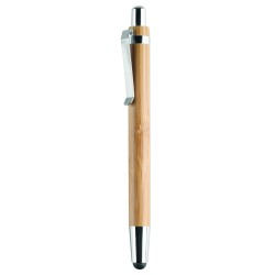 Stylo à bille en ABS et bambou avec clip métal. Extrémité souple. Encre bleue. Le bambou est un produit naturel, et présente de légères variations de couleur, de décoration et de tailles.