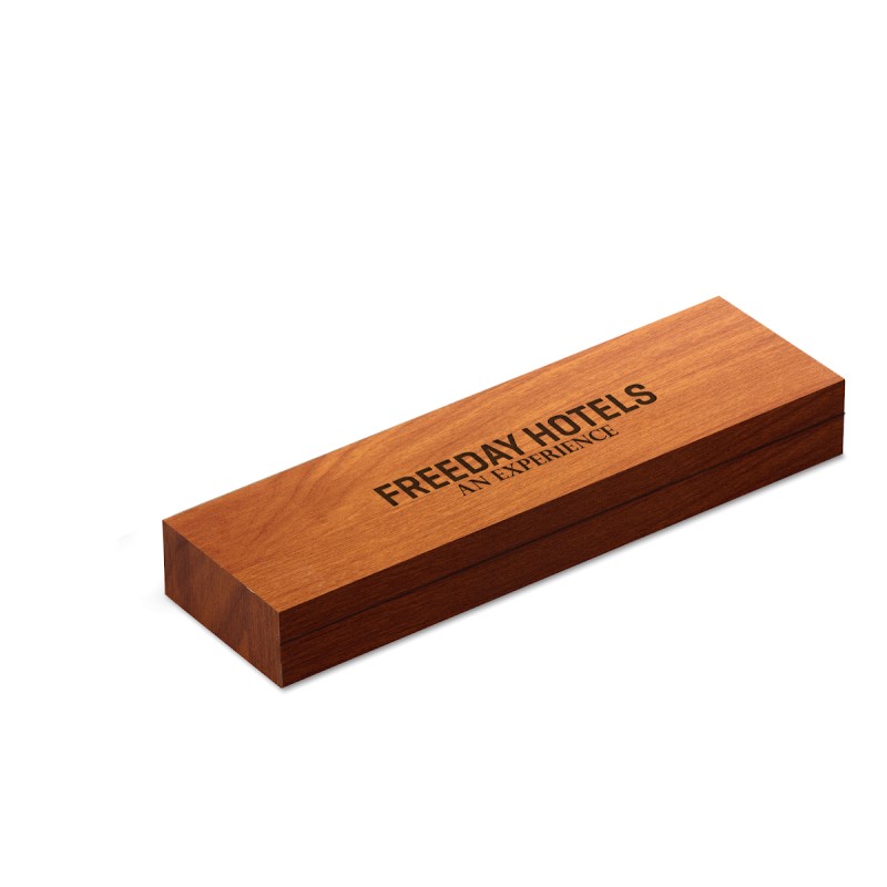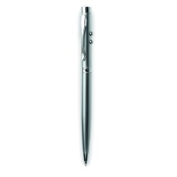 Stylo argenté multifonctions. Encre bleue, LED blanche, pointeur laser rouge. Inclut 3 piles boutons . Présenté dans un coffret bois. Safety class II.