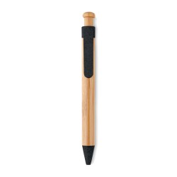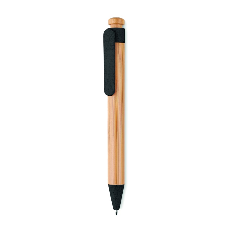 Stylo bille poussoir avec corps en bambou et paille de blé et détails en ABS. Encre bleue. Le bambou est un produit naturel, et présente de légères variations de couleur, de décoration et de tailles.