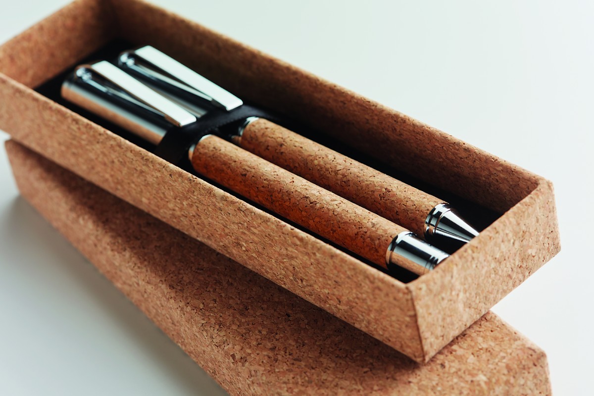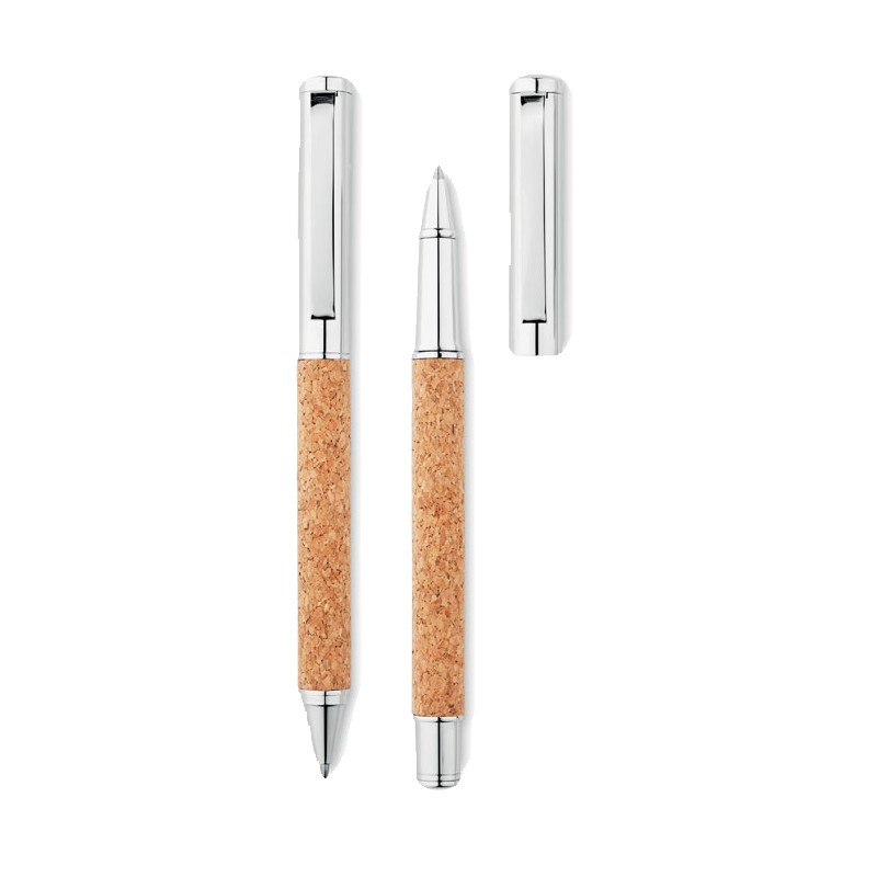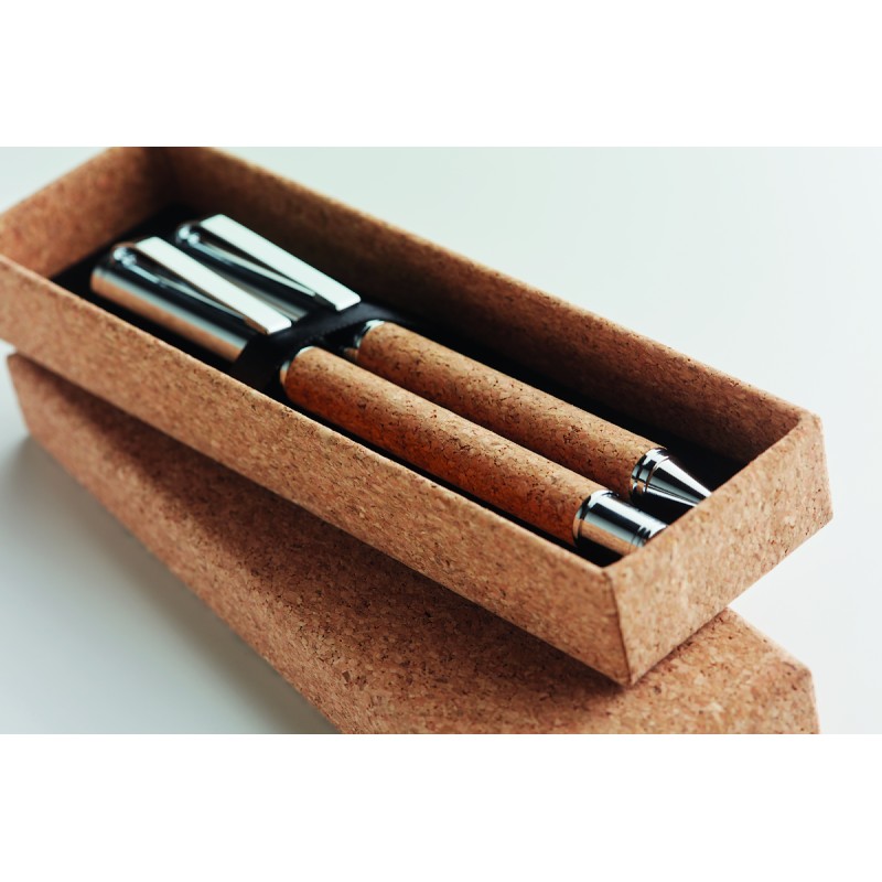 Ensemble de stylos en métal avec stylo à bille et roller (mécanisme à rotation) avec corps en liège. Présenté dans une boîte en liège assortie. Encre bleue et noire respectivement. Le liège est un matériau naturel, en raison de sa nature structurelle et de sa porosité de surface, le résultat d'impression final par article peut présenter des écarts.