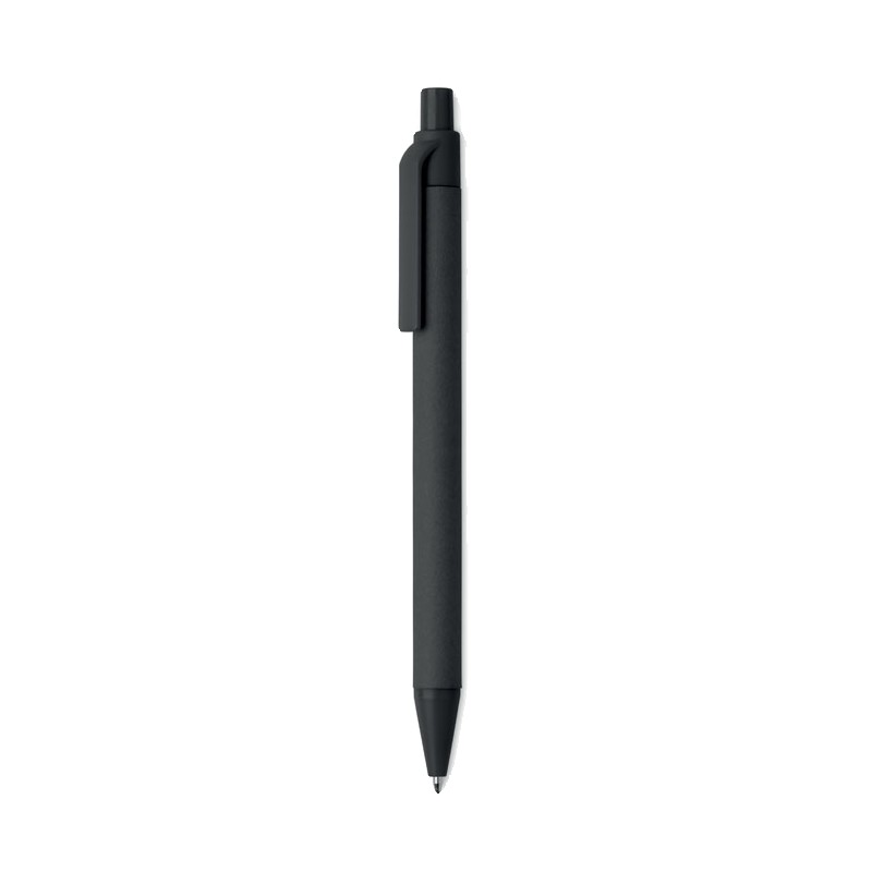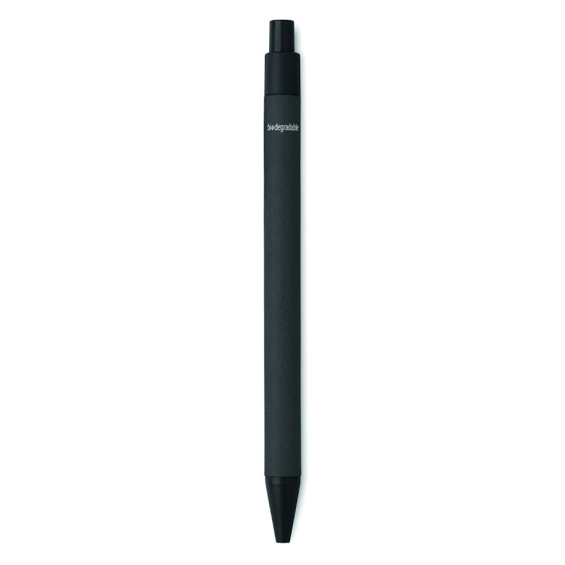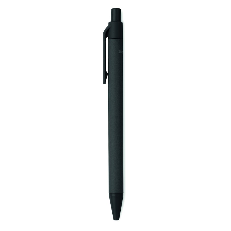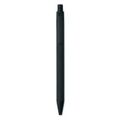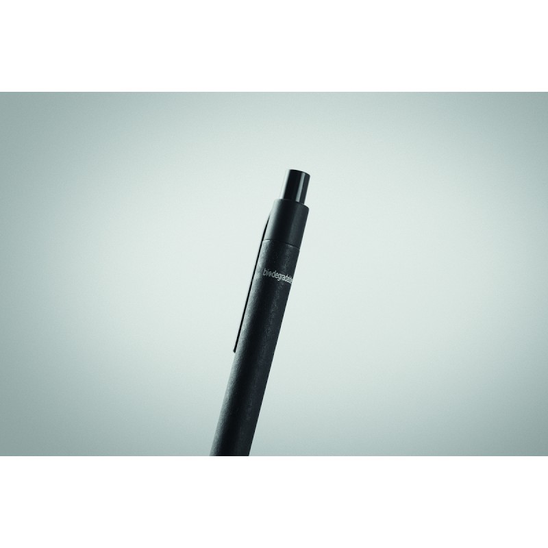 Stylo-bille à bouton-poussoir avec le corps en papier recyclé et attributs composés à 100% en PLA maïs. Encre bleue.