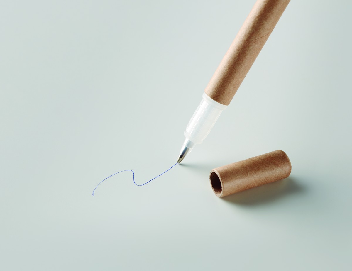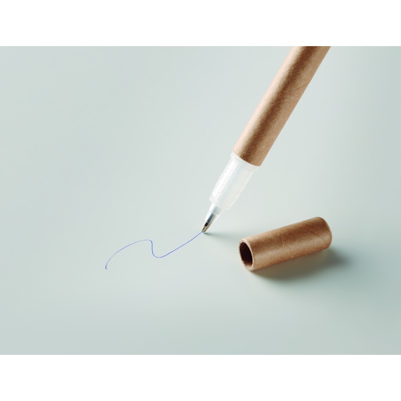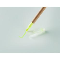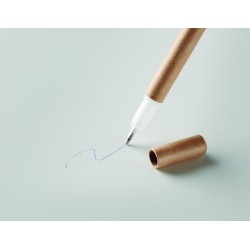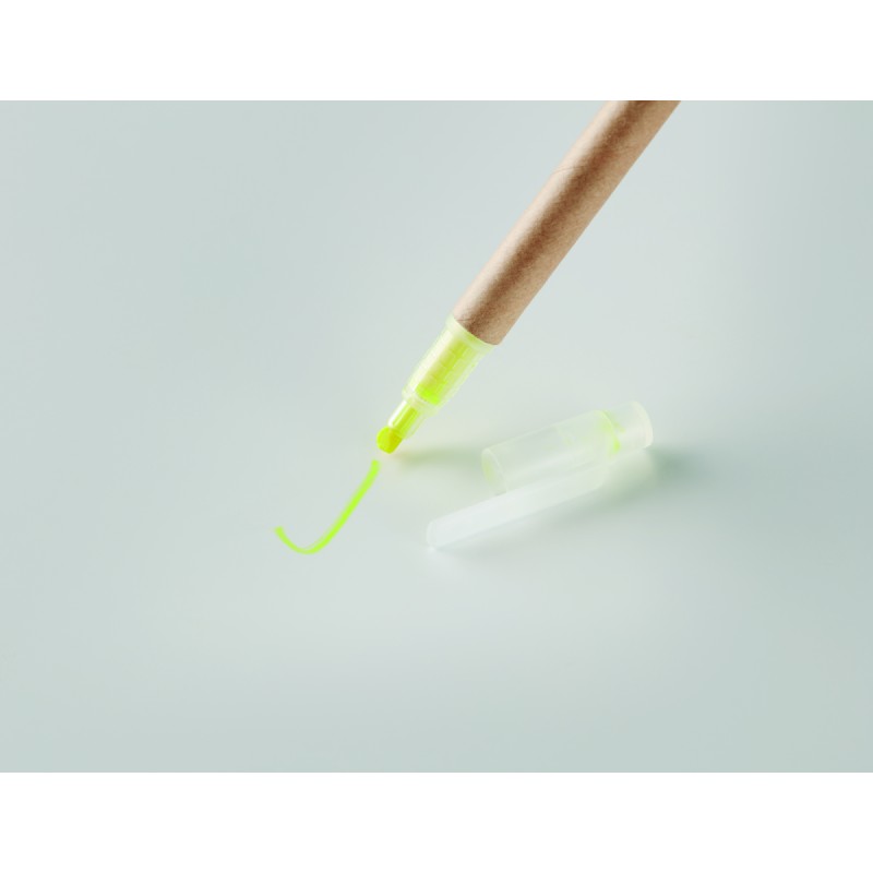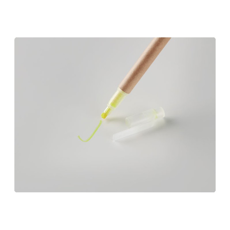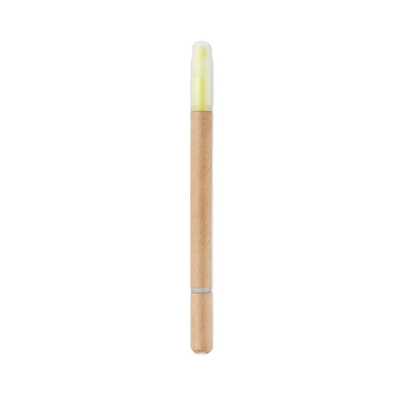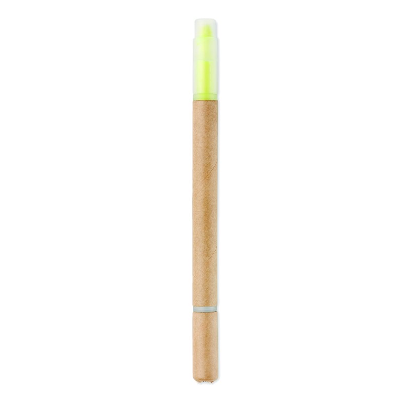 Stylo à bille en carton et surligneur jaune 2 en 1. Encre bleue.