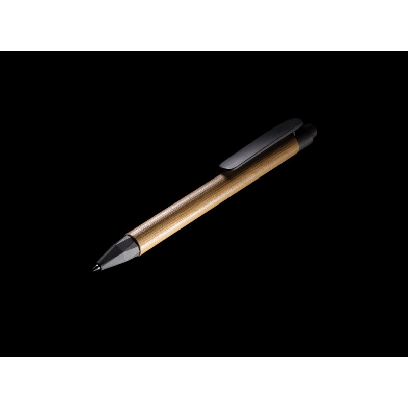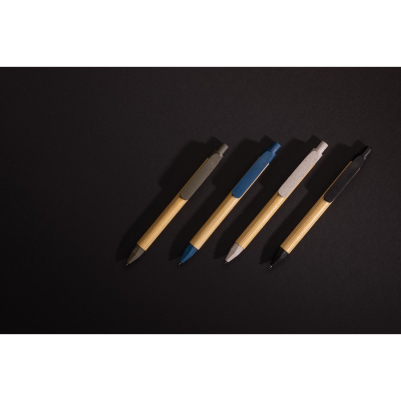 Stylo-bille au baril en papier recyclé avec un effet bambou et clip en fibre de paille de blé. Encre bleue Dokumental® de fabrication allemande pour +/- 1000m d’écriture et bille en carbure de tungstène assurant une écriture régulière.