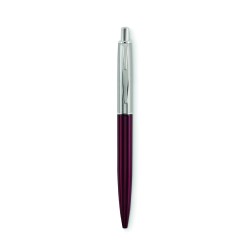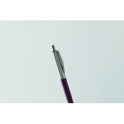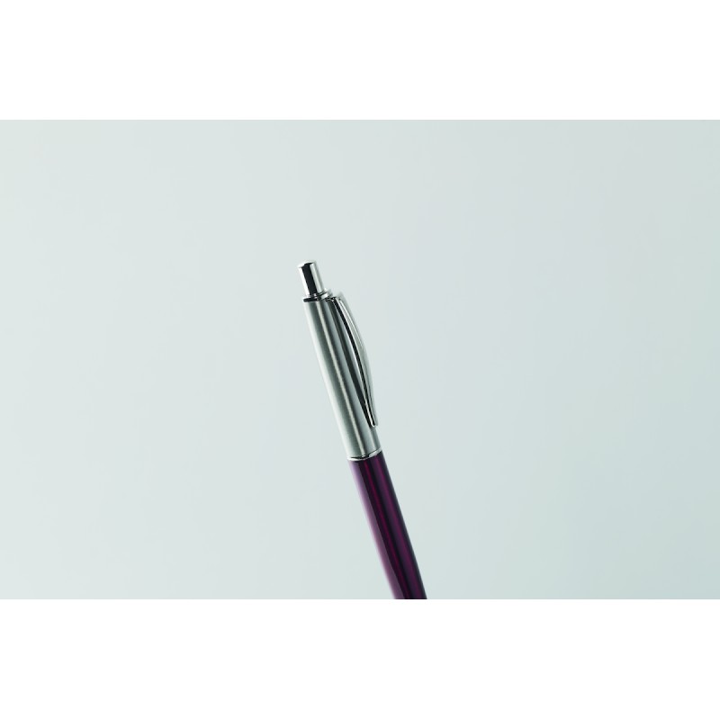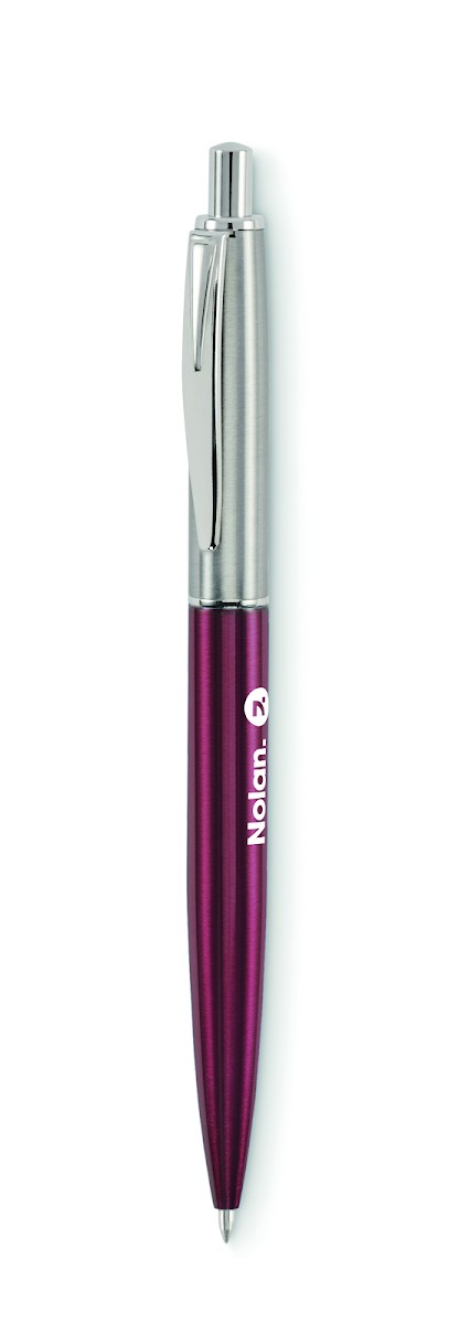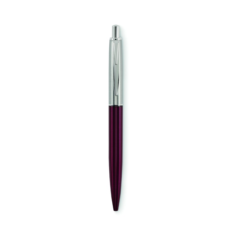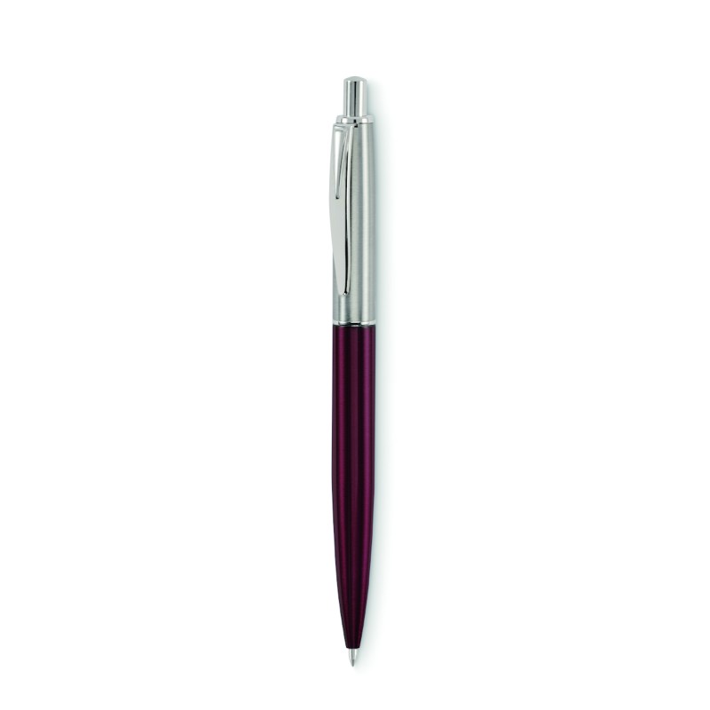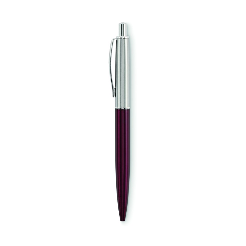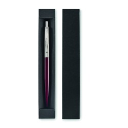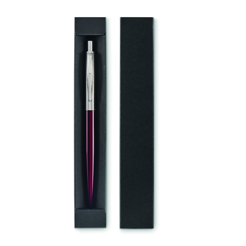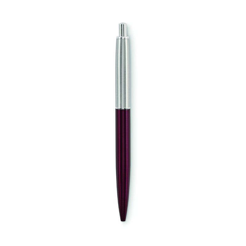 Stylo à bille à bouton poussoir dans un corps en acier inoxydable recyclé. Encre bleue. Présenté dans une boîte noire.