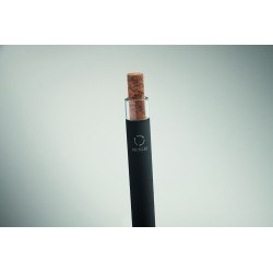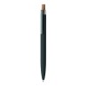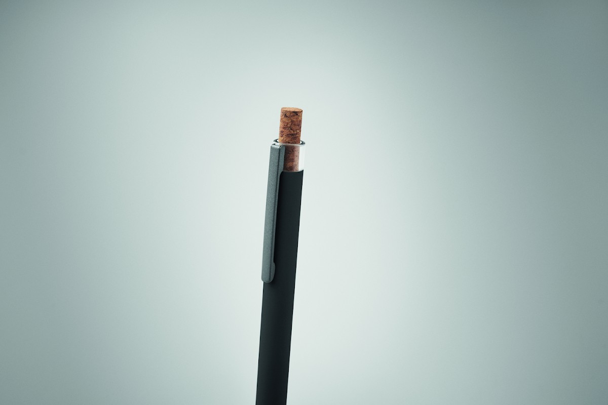 Stylo bille en aluminium recyclé avec bouton poussoir en liège et clip en métal. Encre bleue.