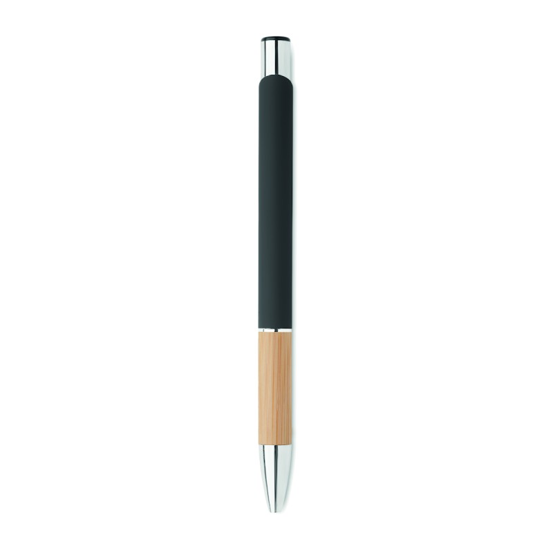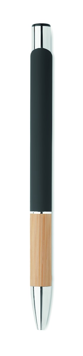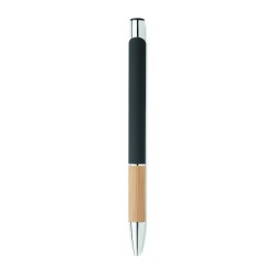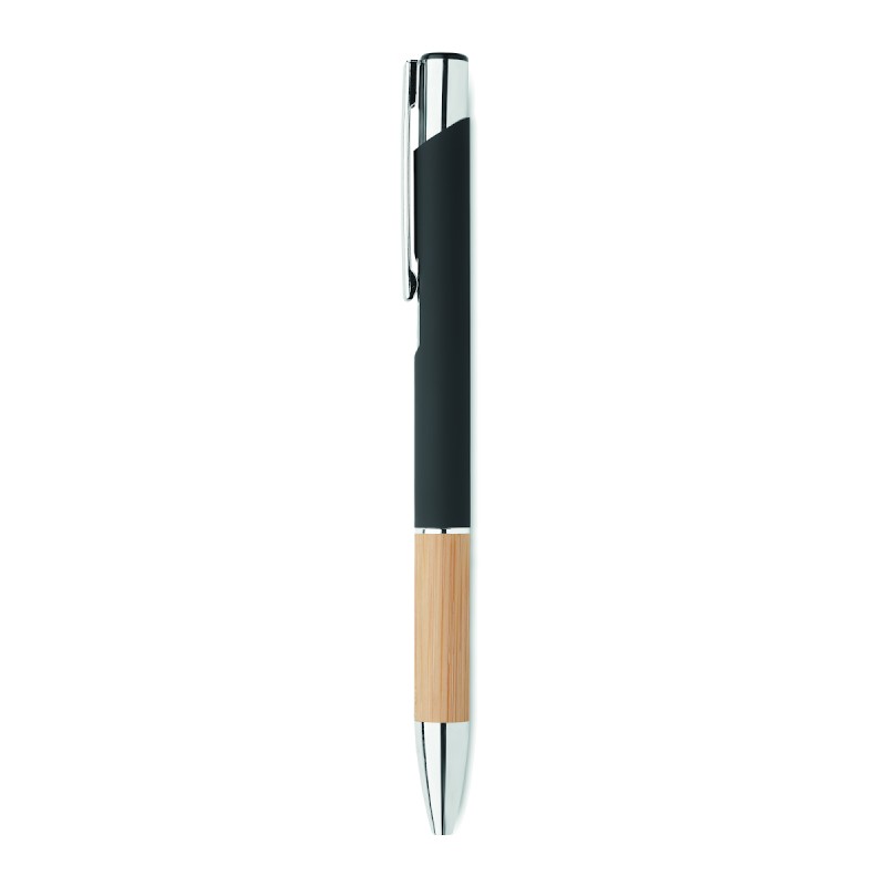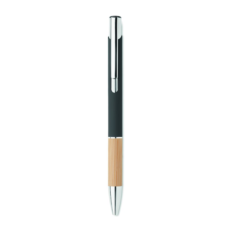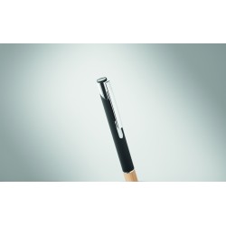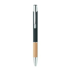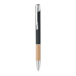 Stylo à bouton poussoir en aluminium avec prise en bambou. Encre bleue.
