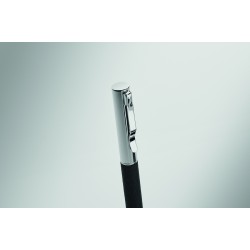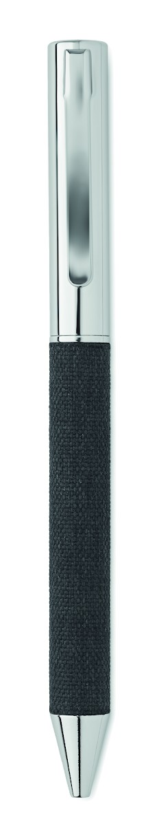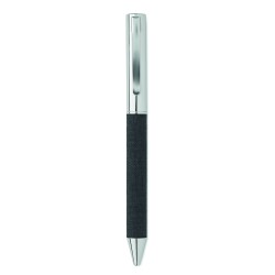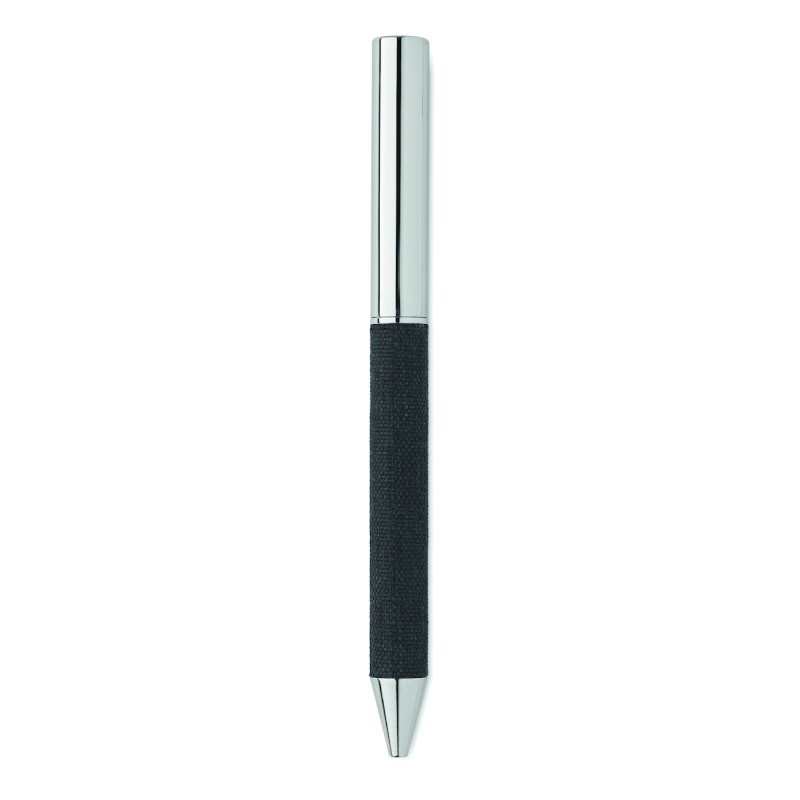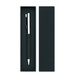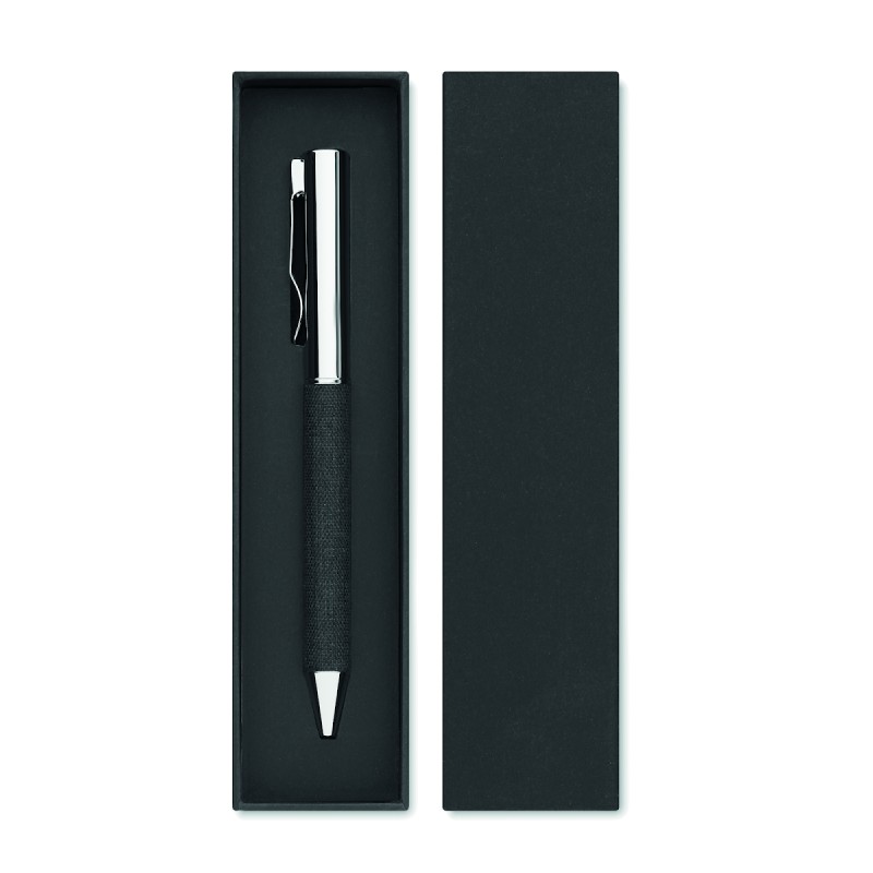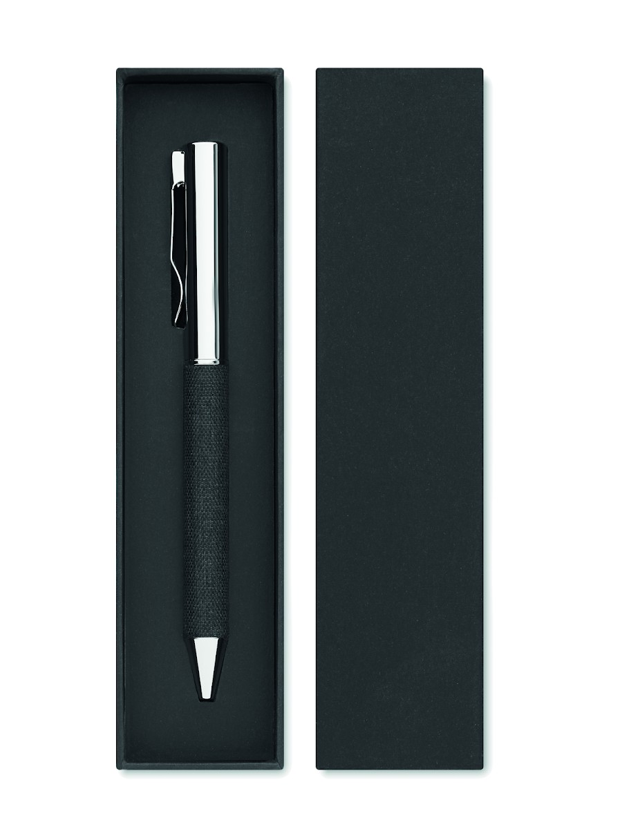 Stylo bille twist en métal avec détails en polyester RPET présenté dans une boîte cadeau. Encre bleue.