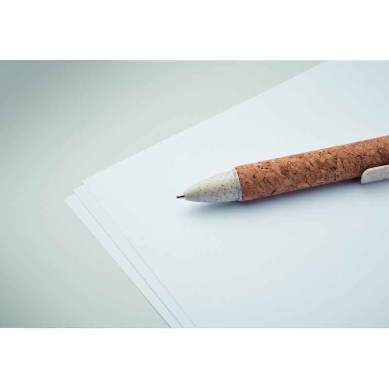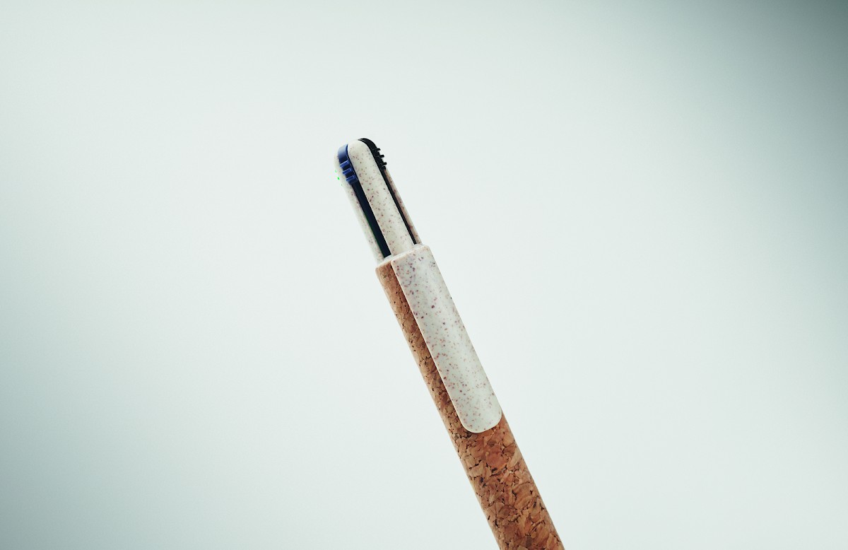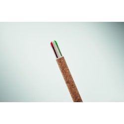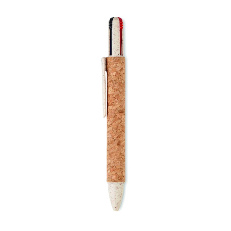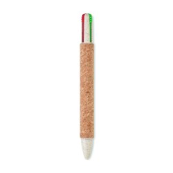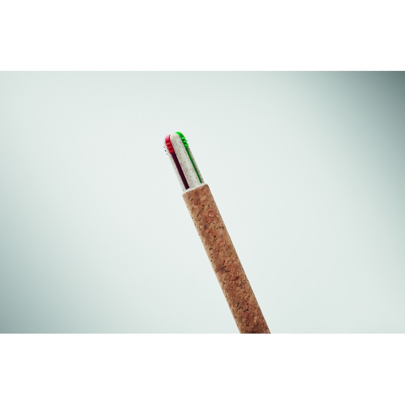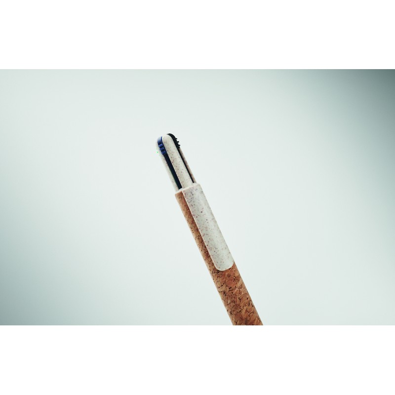 Stylo bille à encre 4 couleurs avec corps en liège et accessoires en paille de blé (50 %) et en plastique ABS (50 %). Encres rouge, verte, bleue et noire.0240541