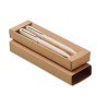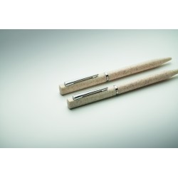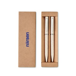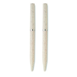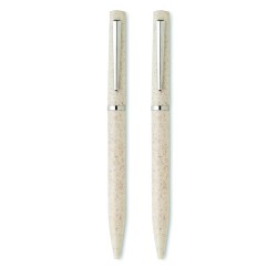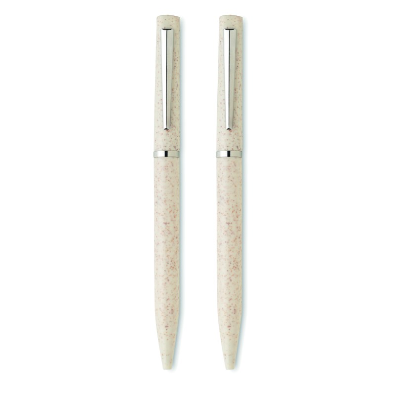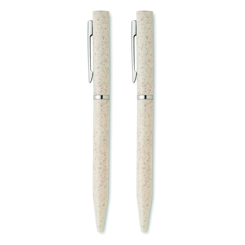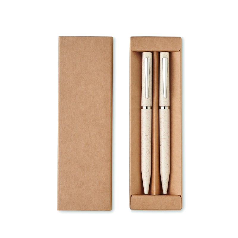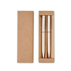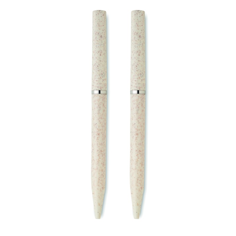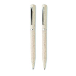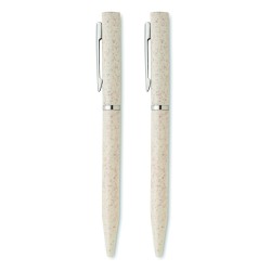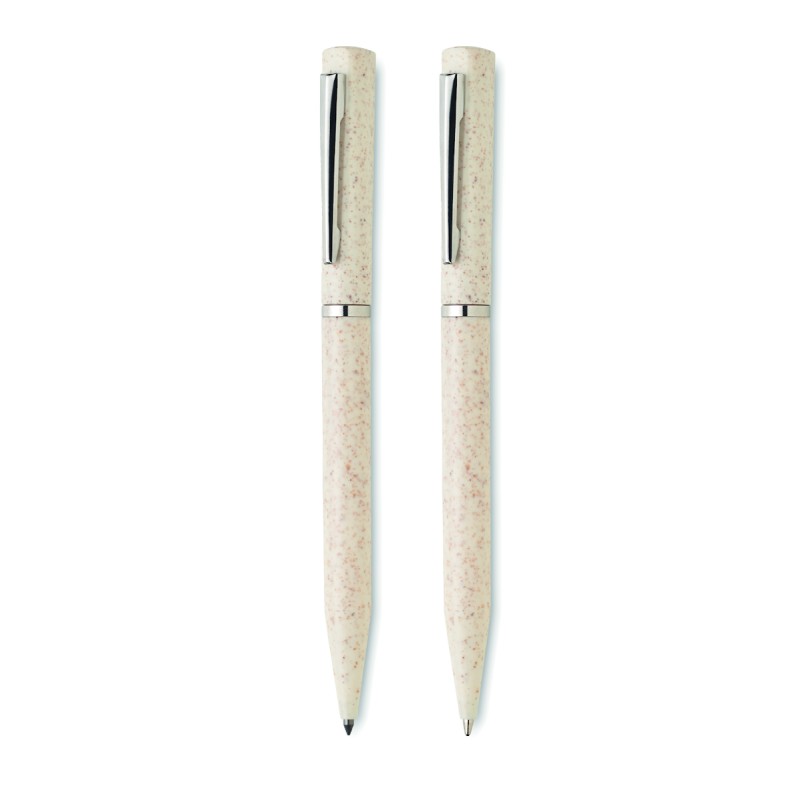 Parure de stylos en paille de blé/ABS comprenant 1 stylo bille twist à encre bleue et 1 stylo bille twist graphite sans encre. Présenté dans une boîte en papier recyclé.