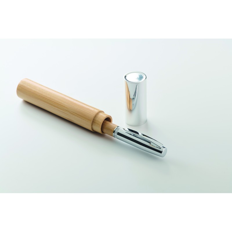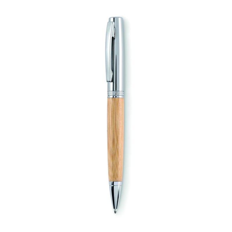 Stylo-bille twist en métal avec corps en finition bambou dans un étui tube avec couvercle en bambou et aluminium. Encre bleue.