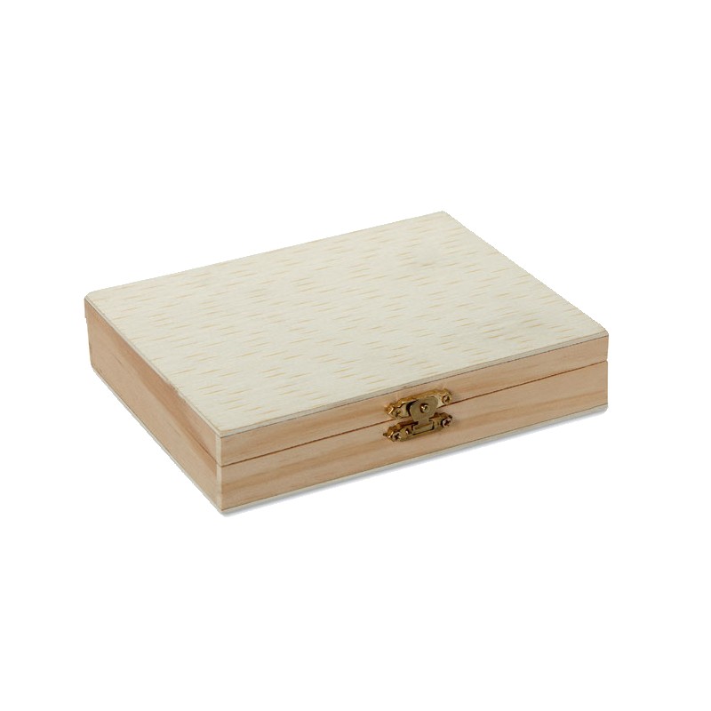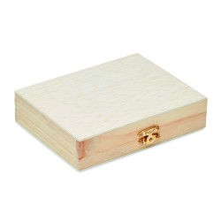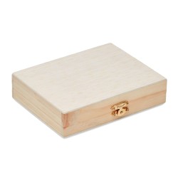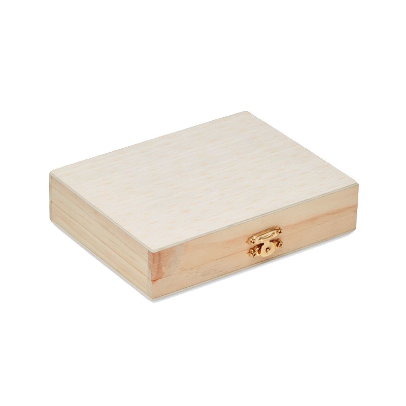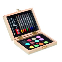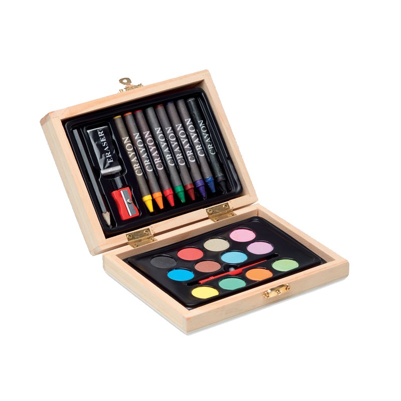 Accessoires de peinture présentés dans une mallette en bois, contenant 8 crayons de couleur, 12 peintures à eau, 1 pinceau, 1 taille-crayon, 1 gomme et 1 crayon.
