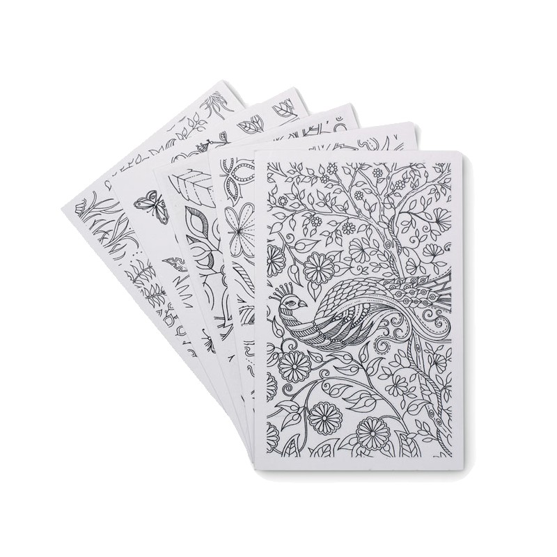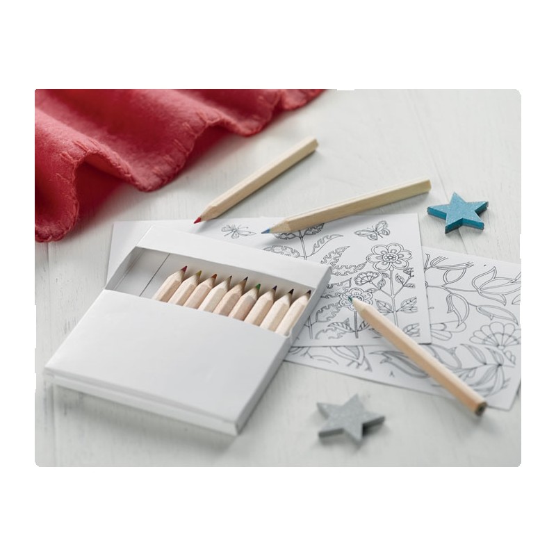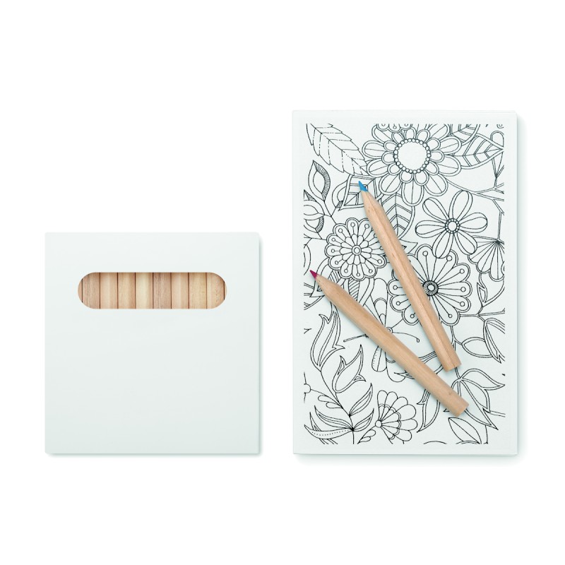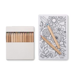 Set de dessin adulte avec 10 cartes et 12 crayons de couleur dans une boîte en papier recyclé.