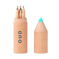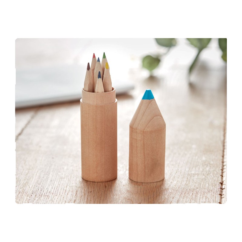 6 crayons en bois dans un étui en bois en forme de crayon.