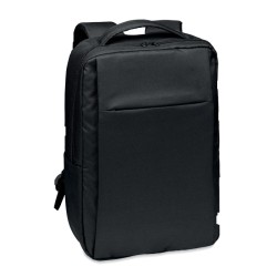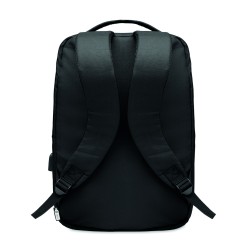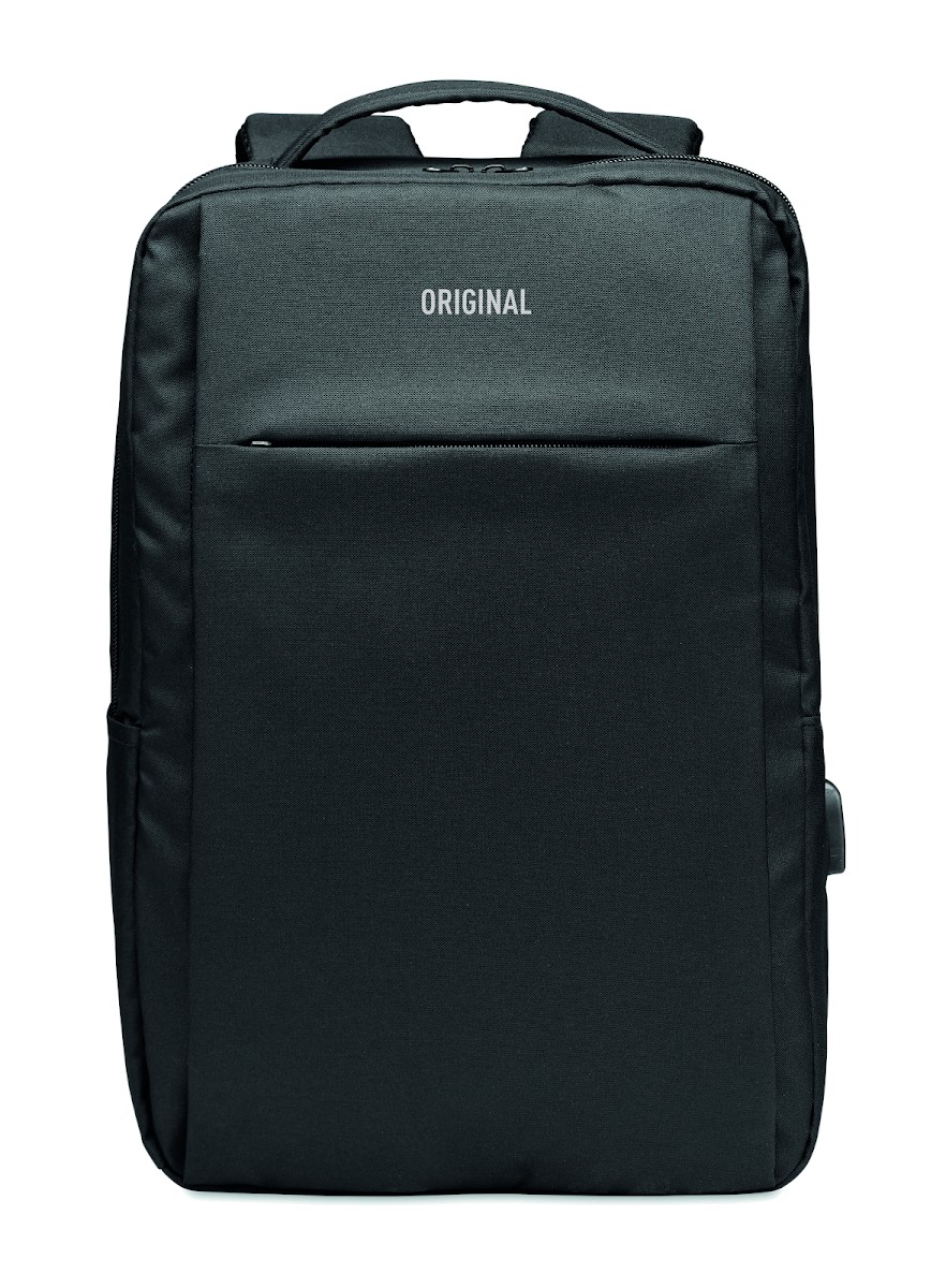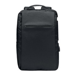 Sac à dos pour ordinateur en polyester RPET 300D avec bandoulière rembourrée comprenant un compartiment interne principal pour un ordinateur portable de 16 pouces et un câble de chargement USB.