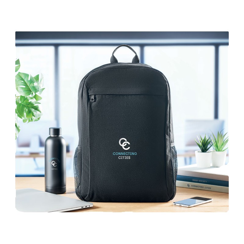 Sac à dos pour ordinateur 15 pouces en toile lavée 340 gr/m². Dos et bretelles rembourrés. Sangle arrière pour trolley.