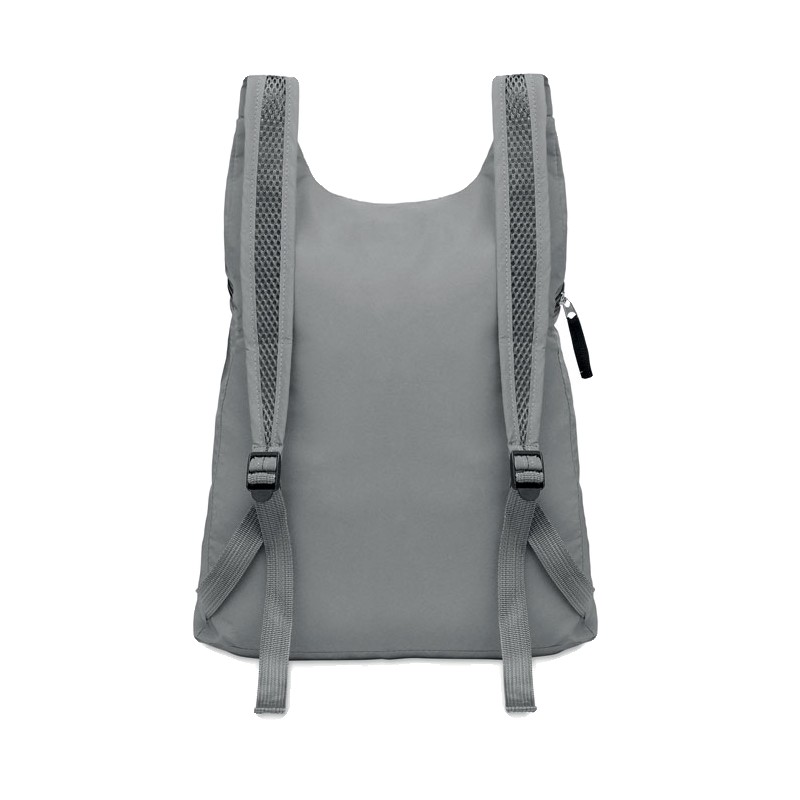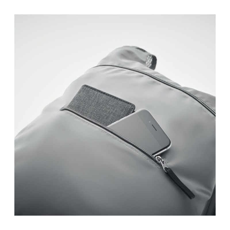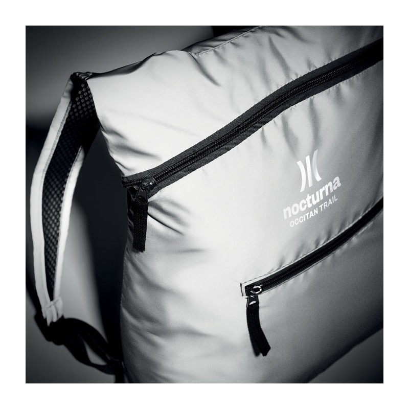 Sac à dos de sport pliable en polyester 190T réfléchissant avec poche frontale zippée. Bretelles réglables.