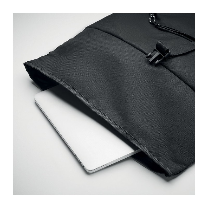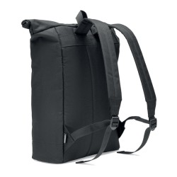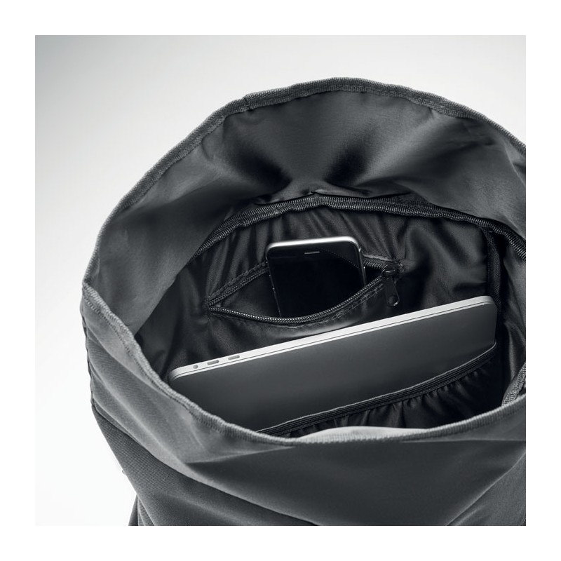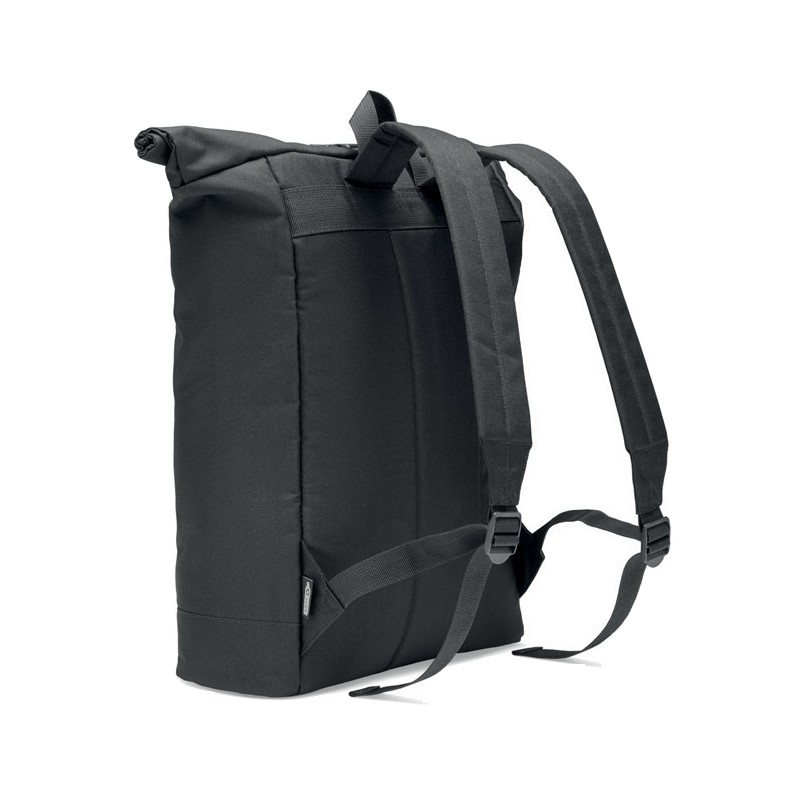 Sac à dos enroulable en polyester 600D RPET avec dos et fond rembourrés. Poche frontale zippée. La doublure est en RPET 210D.