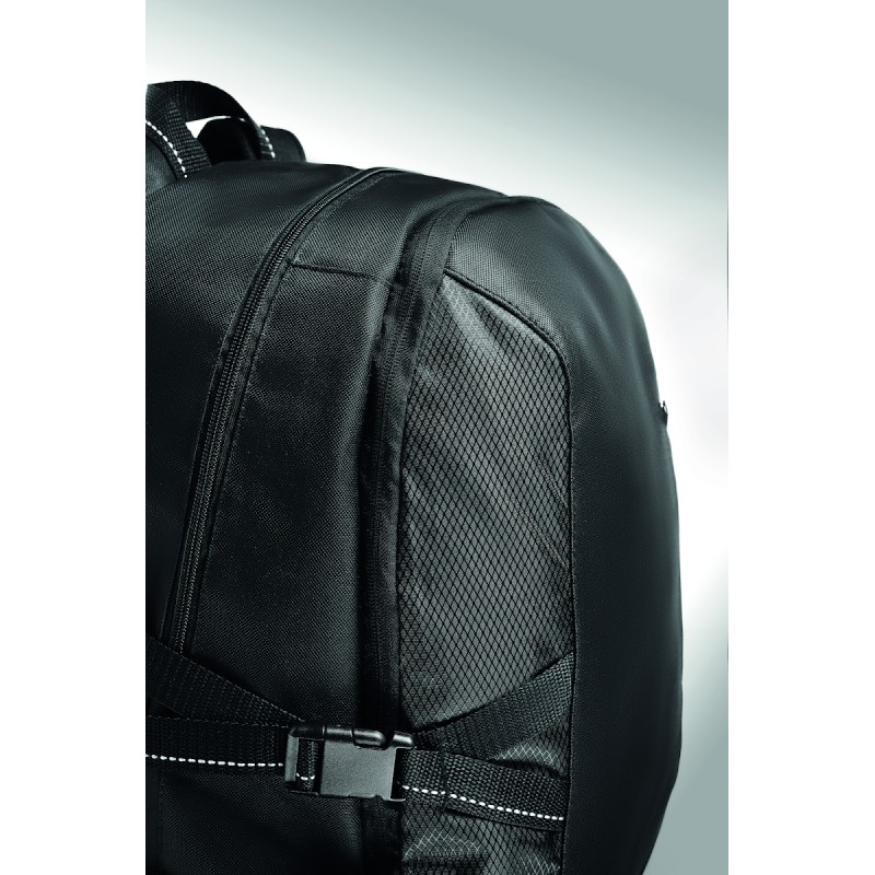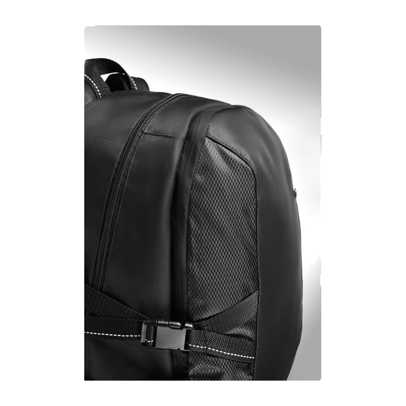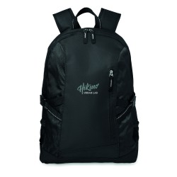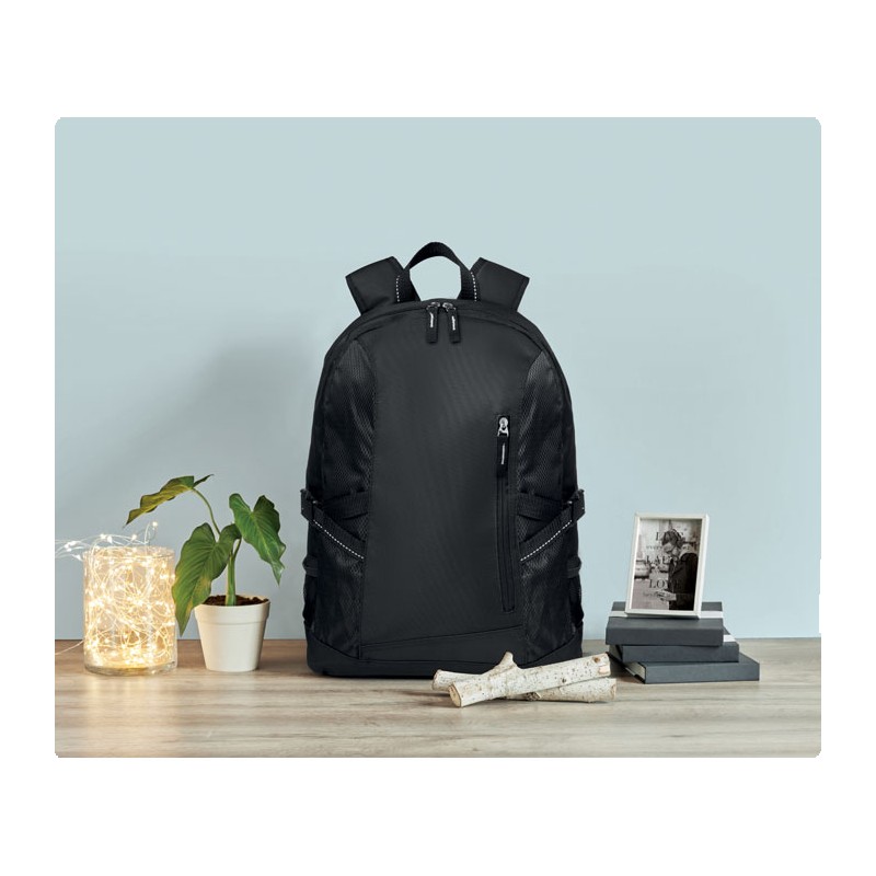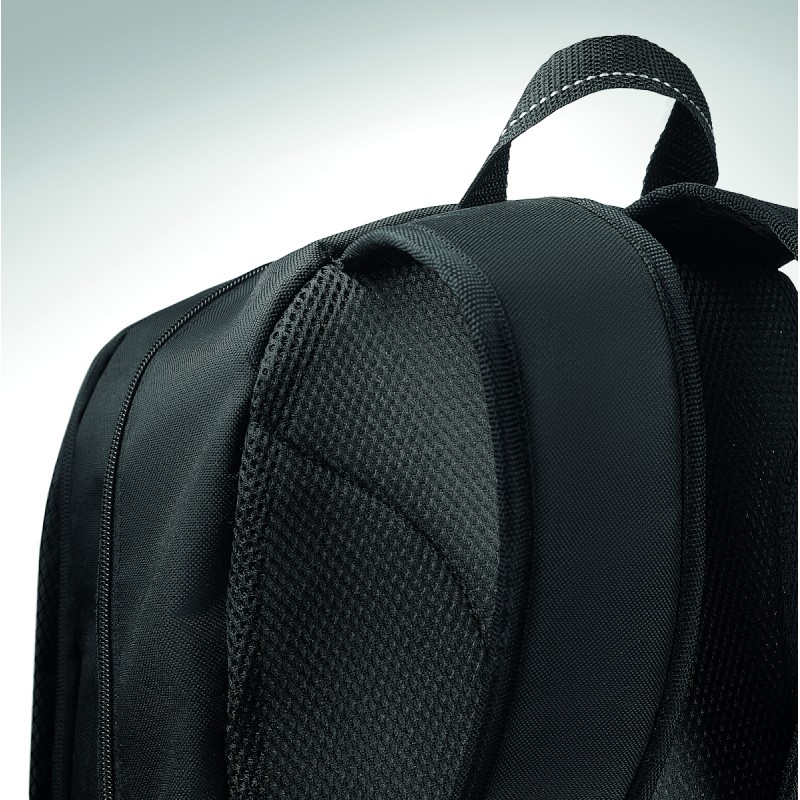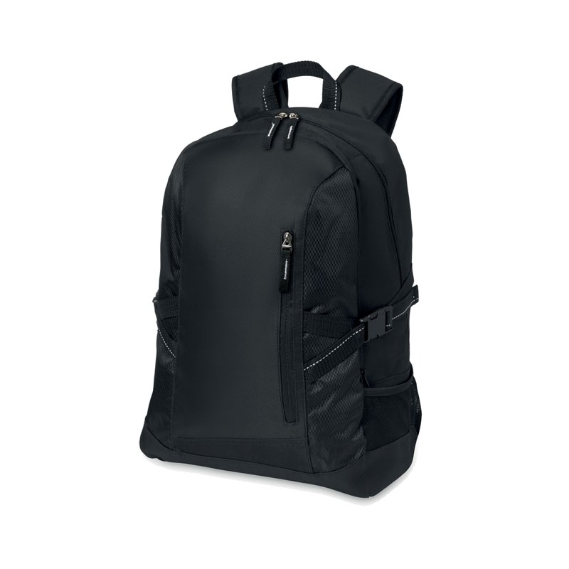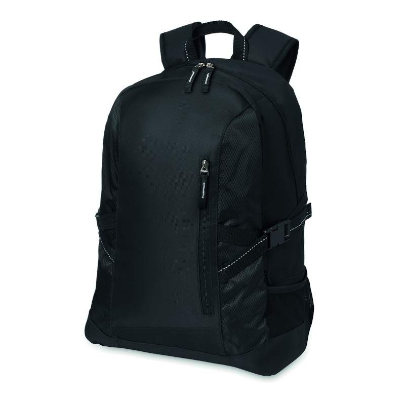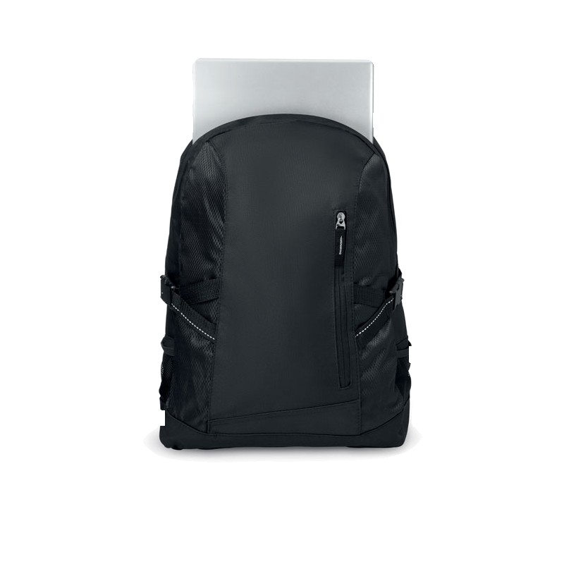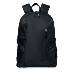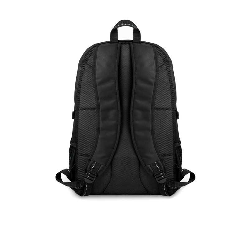 Sac à dos pour ordinateur 15 pouces en polyester 600D. Comprend une poche avant zippée et 2 compartiments latéraux. Bandoulière réglable.