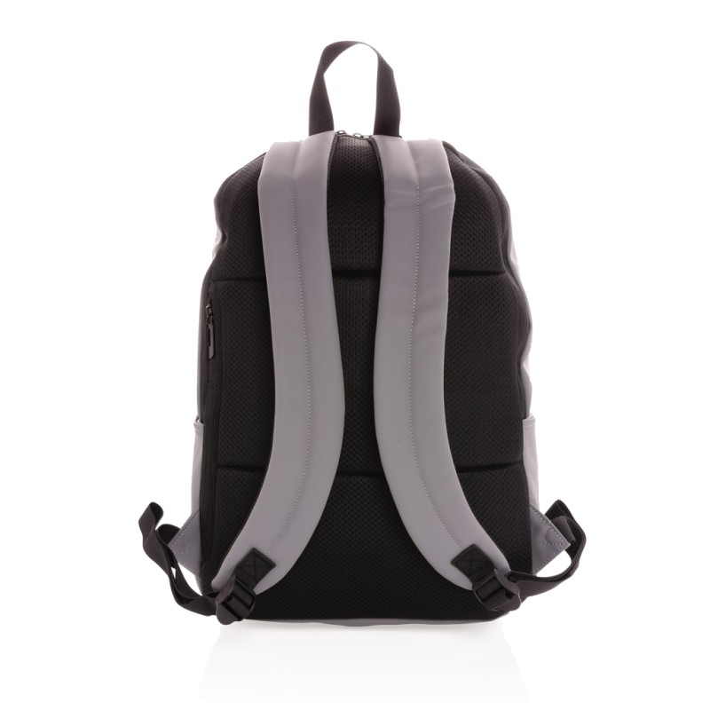 Ce sac à dos minimaliste et moderne en PU lisse. Entièrement doublé, compartiment pour ordinateur portable 15,6 pouces, grand compartiment principal, 2 poches intérieures et 2 passants stylos. Dos rembourré en mesh et bretelles ajustables. Extérieur 100% PU. Intérieur 100% polyester 210D. Sans PVC.