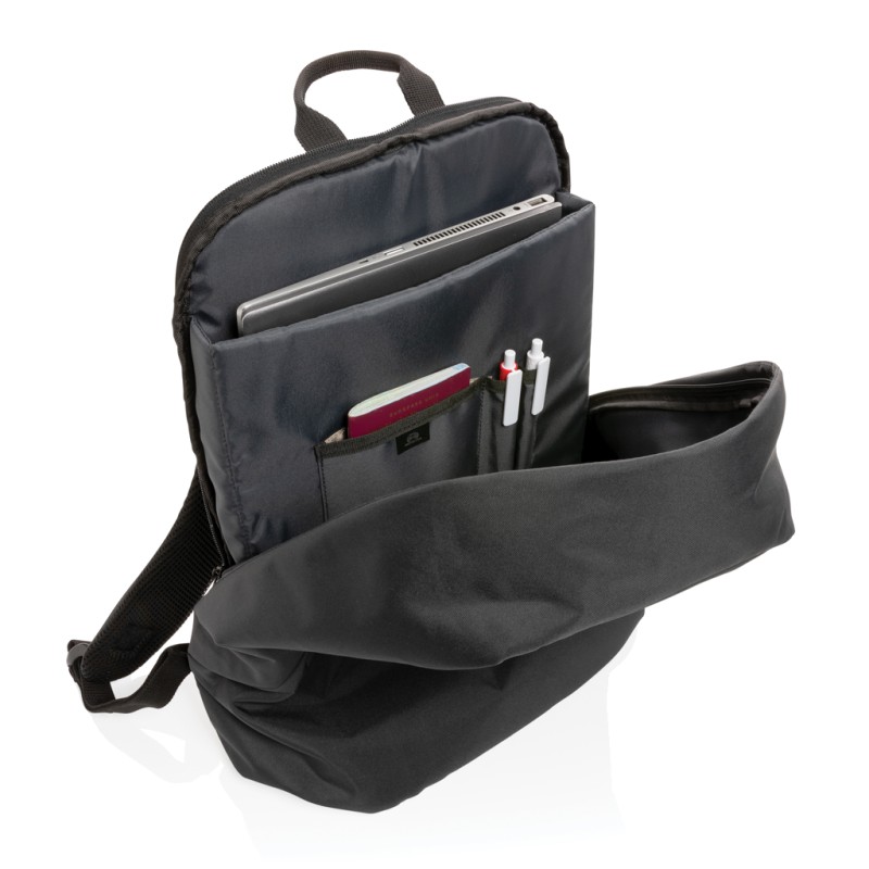 Sac à dos antivol avec une pochette rembourée pour ordinateur portable de 15,6”. Ce sac à dos léger et durable est dôté d'une fabrication compacte et minimaliste, A l'intérieur, il y a une poche avec protection anti-RFID. Il contient aussi une sangle à bagages à l'arrière. L'extérieur est en polyester recyclé 300D, la doublure est en polyester recyclé 150D. Avec traceur AWARE™ qui prouve l'utilisation réelles des matériaux recyclés. Chaque sac a réutilisé 19,9 bouteilles en PET 0,5L. 2% de chaque produit IMPACT vendu sera reversé à Water.org.