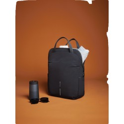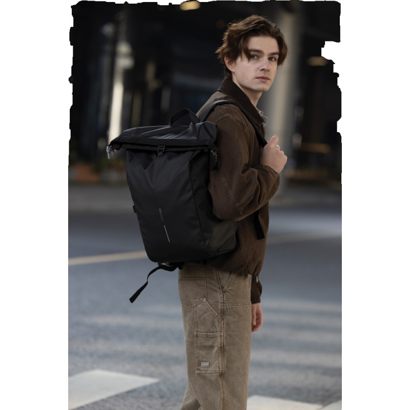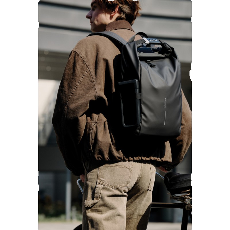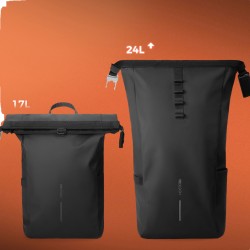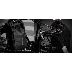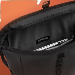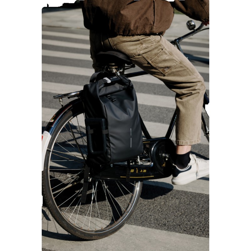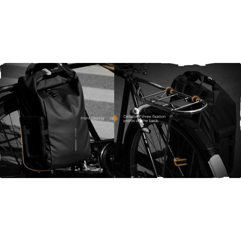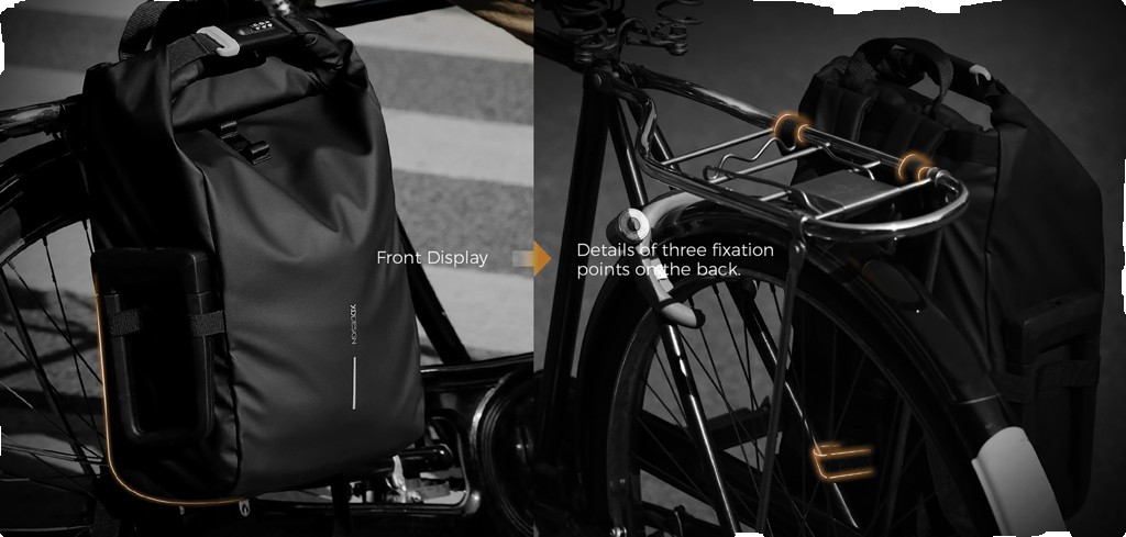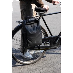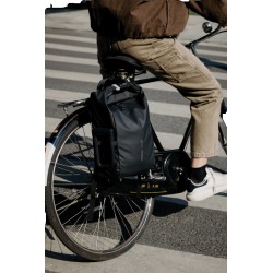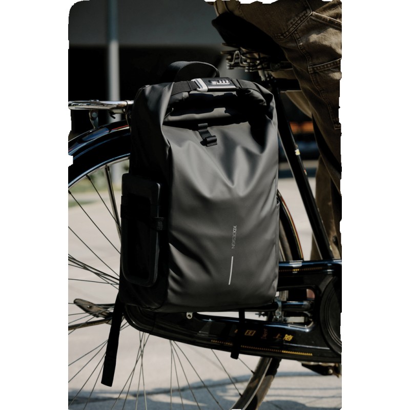 Sac à dos pour vélo résistant à l'eau Urban est le compagnon de voyage idéal, garantissant sécurité et commodité. En enroulant le compartiment principal et en le fixant à l'aide de la serrure à combinaison renforcée, le sac à dos offre une fermeture complète, qui peut également être utilisée pour verrouiller le sac autour d'un objet fixe. Le sac à dos se fixe facilement au cadre de votre vélo. À l'intérieur, des compartiments rembourrés peuvent accueillir un ordinateur portable de 16 pouces, tandis que des poches en filet permettent d'organiser les objets essentiels. L'extérieur minimaliste est fabriqué à partir d'un matériau PU de haute qualité, résistant à l'eau et durable, tandis que la doublure est fabriquée avec AWARE™, l'utilisation d'un véritable tissu recyclé est garantie. Contenu recyclé à hauteur de 32%. Modèle déposé®.