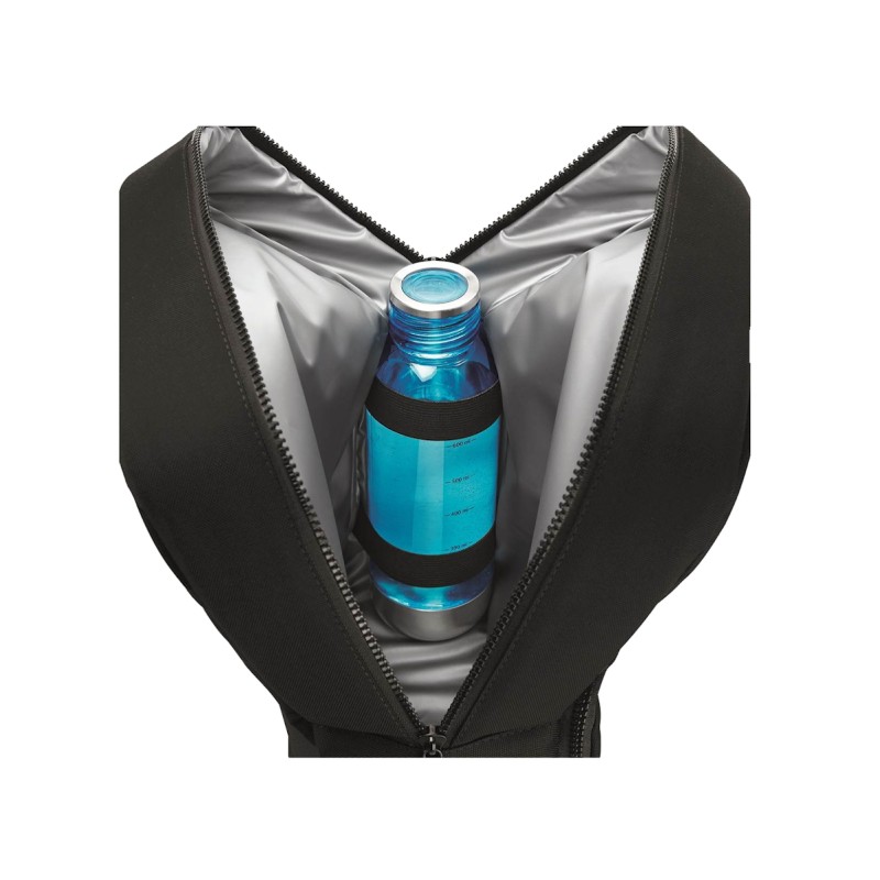 Compartiment de rangement zippé. Compartiment principal isolant. Tirettes avec détails réfléchissants. Bandoulières matelassées ajustables. Poche avant zippée. Poignée matelassée.