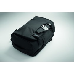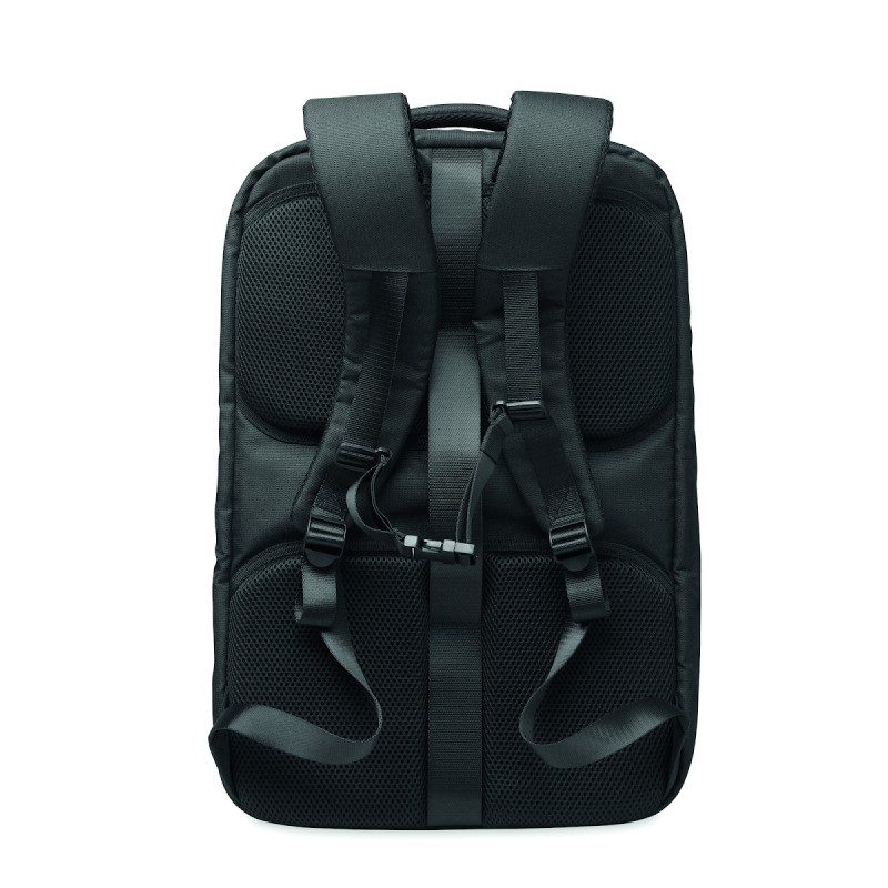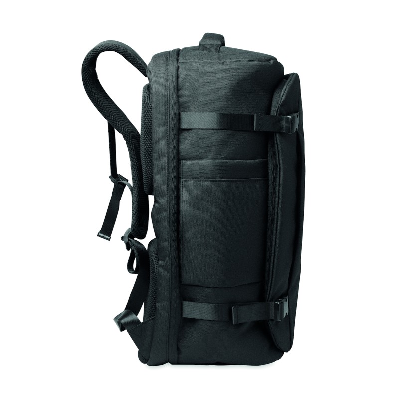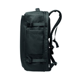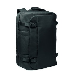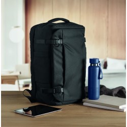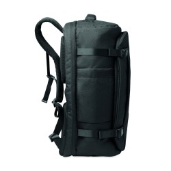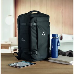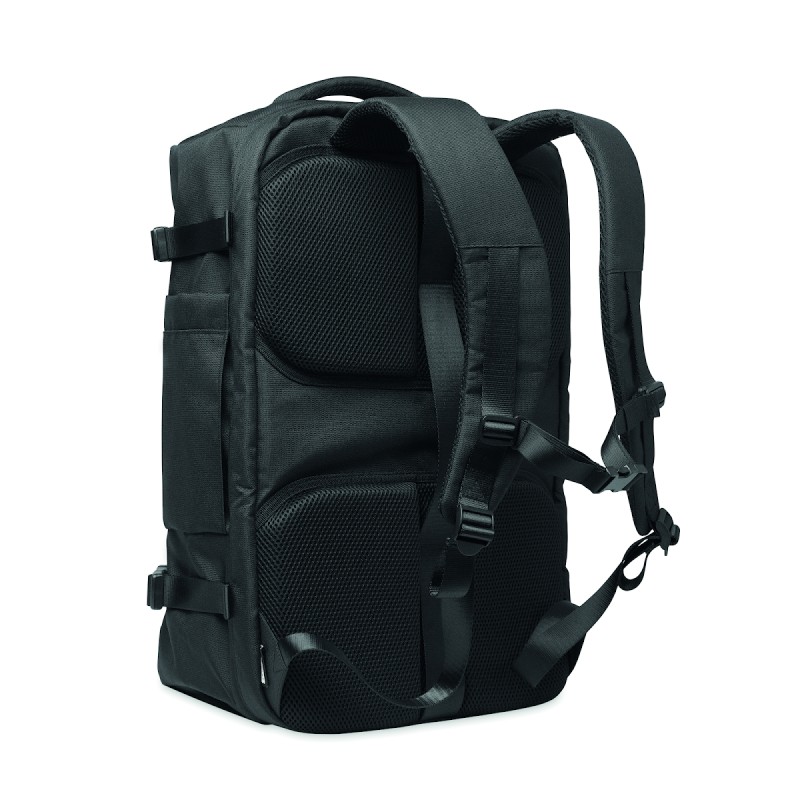 Grand sac à dos de voyage pour ordinateur portable 17 '' en polyester 600D RPET. Plusieurs compartiments : compartiment principal pour les vêtements, 2 compartiments matelassés pour l'ordinateur portable et tablette. Panneau arrière renforcé, bandoulière, poignée.