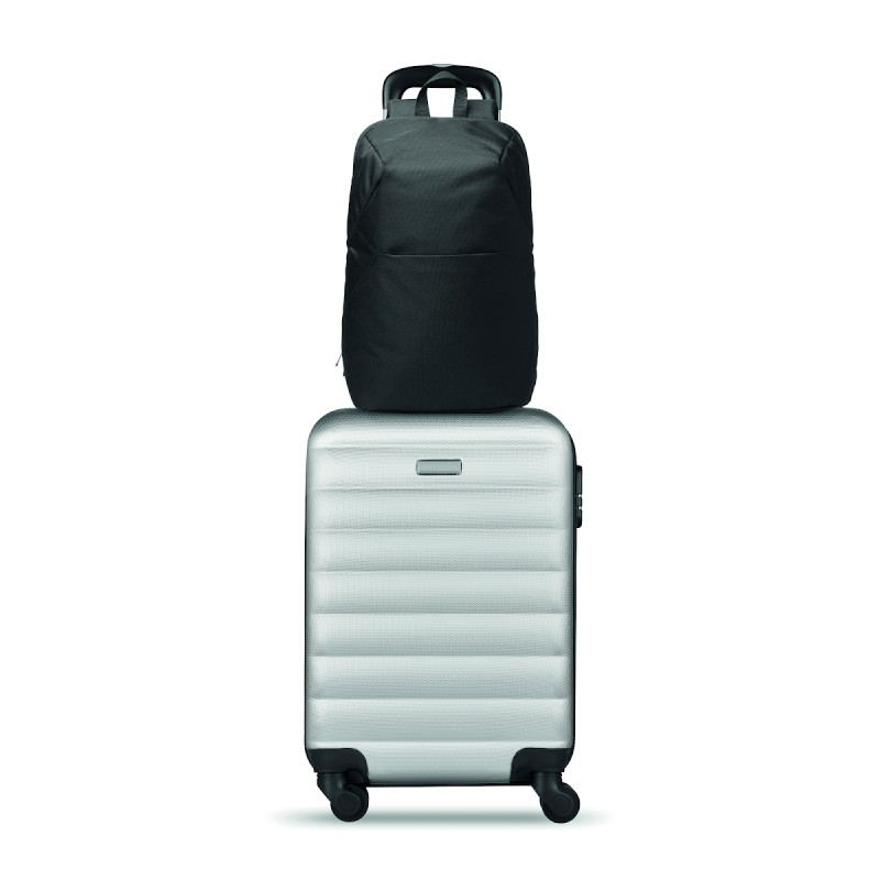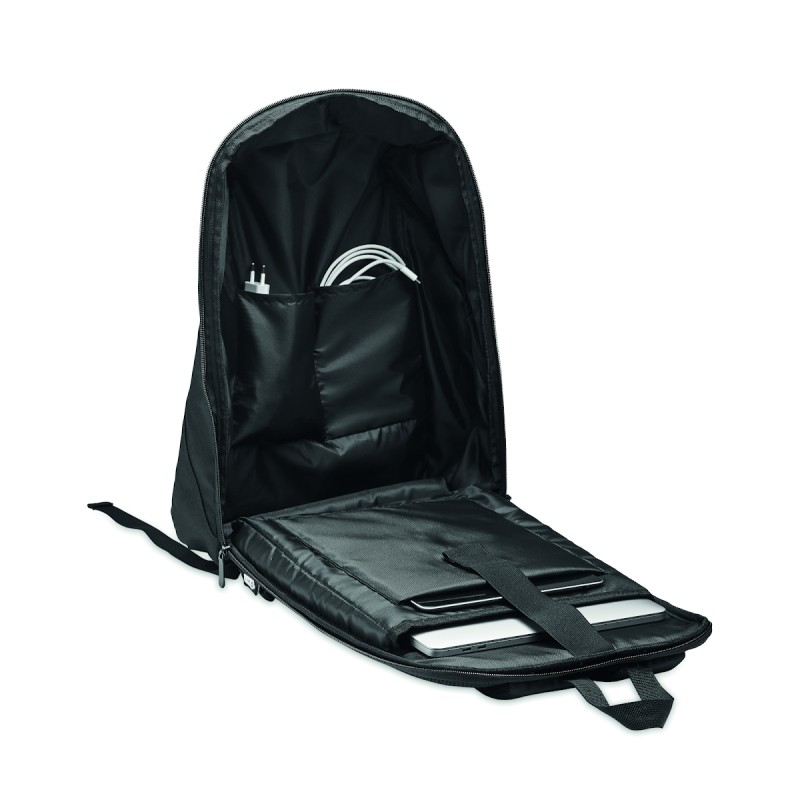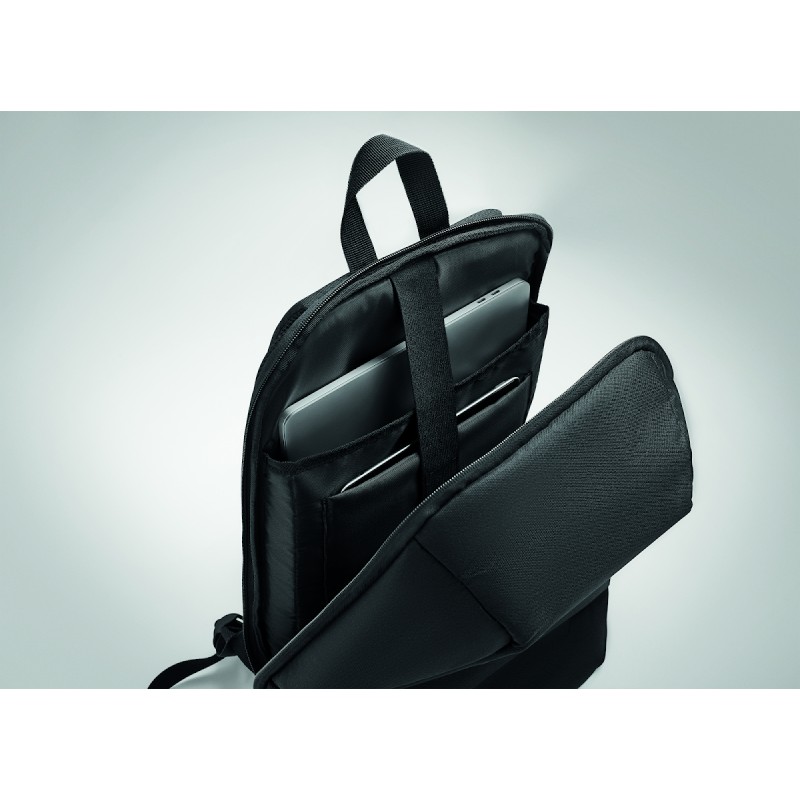 Sac à dos antivol pour ordinateur portable de 15'' en polyester 600D RPET. Plusieurs compartiments dont un supplémentaire renforcé pour tablette et autres. Bretelles renforcées et compartiment principal au dos.