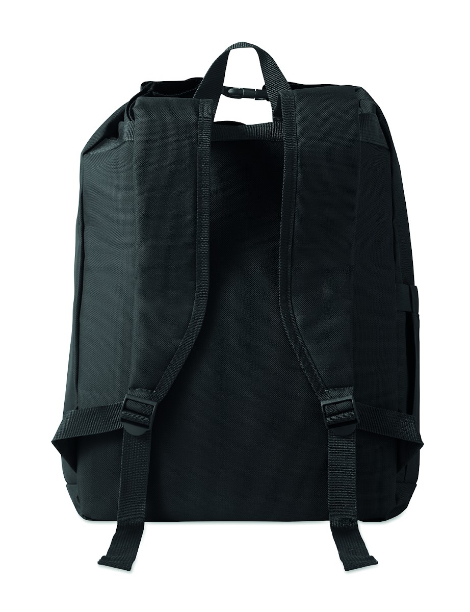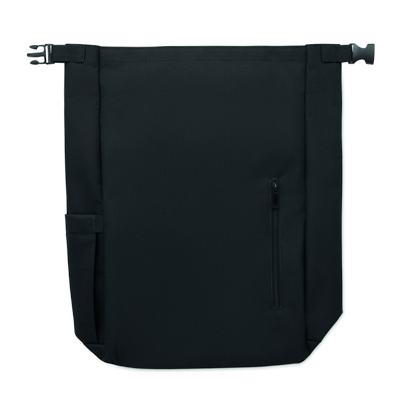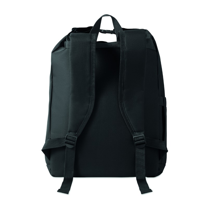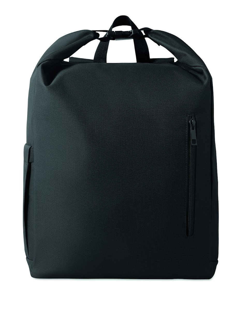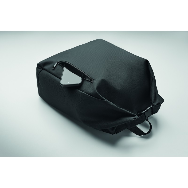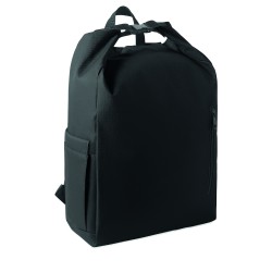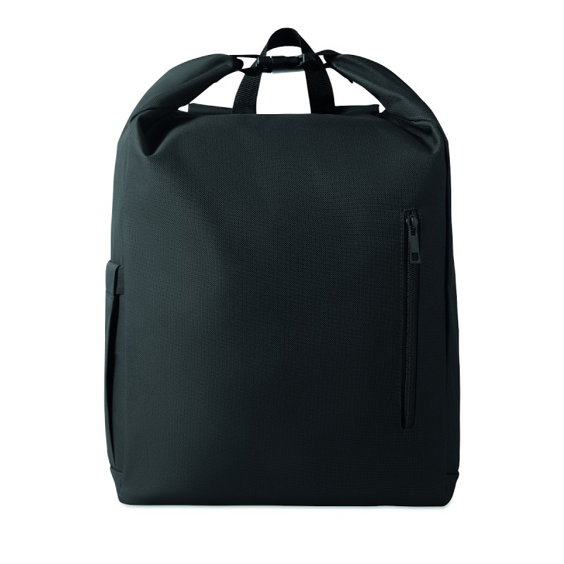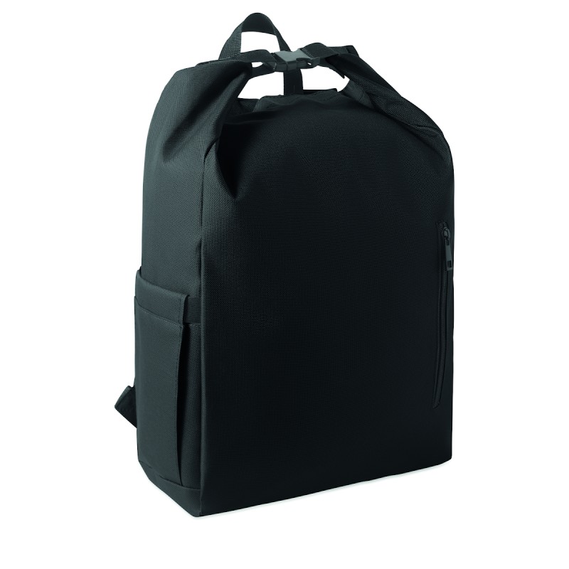 Sac à dos pour ordinateur portable de 15 pouces en polyester 600D RPET avec doublure matelassée en 210D RPET. Comprend une poche frontale zippée, une poche latérale élastique et des bretelles réglables.