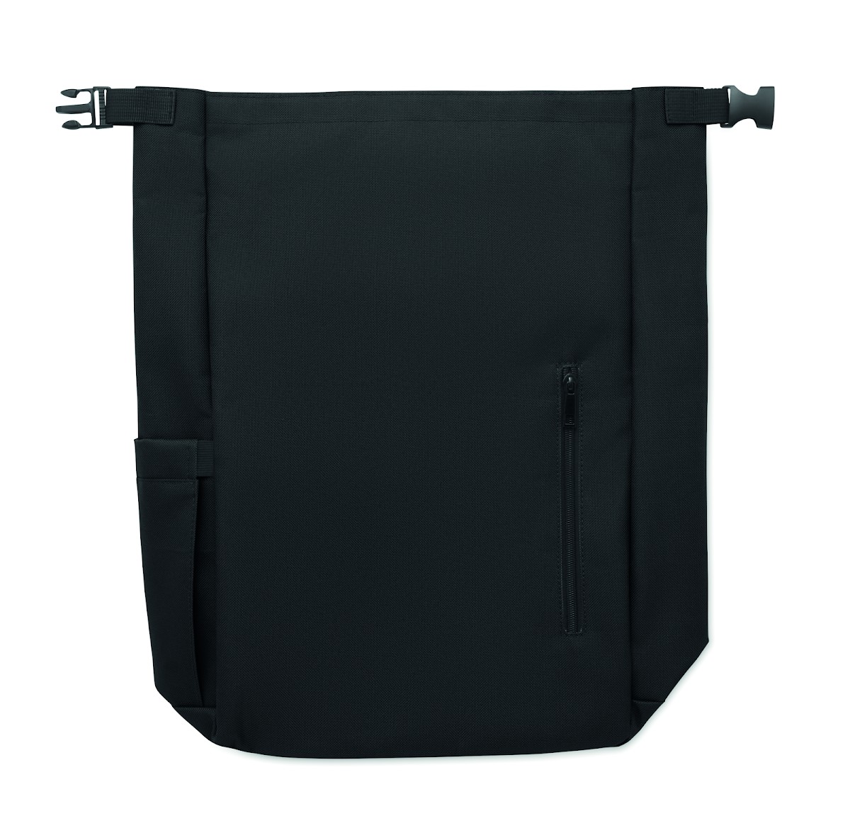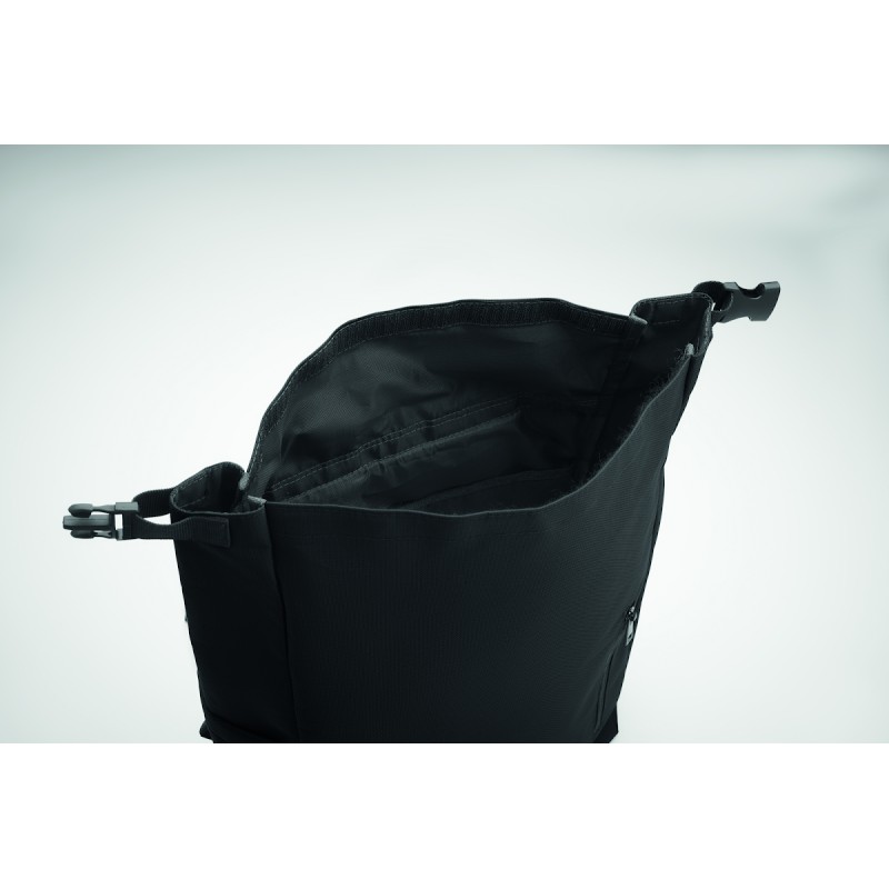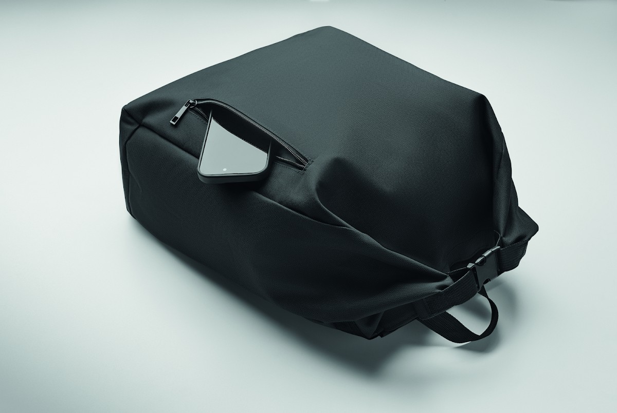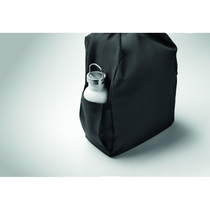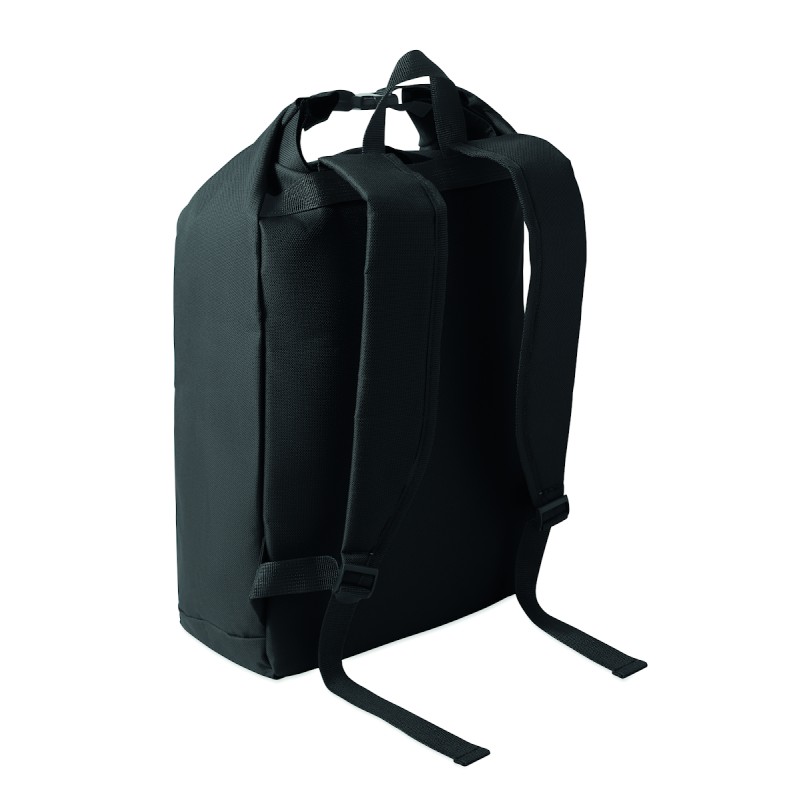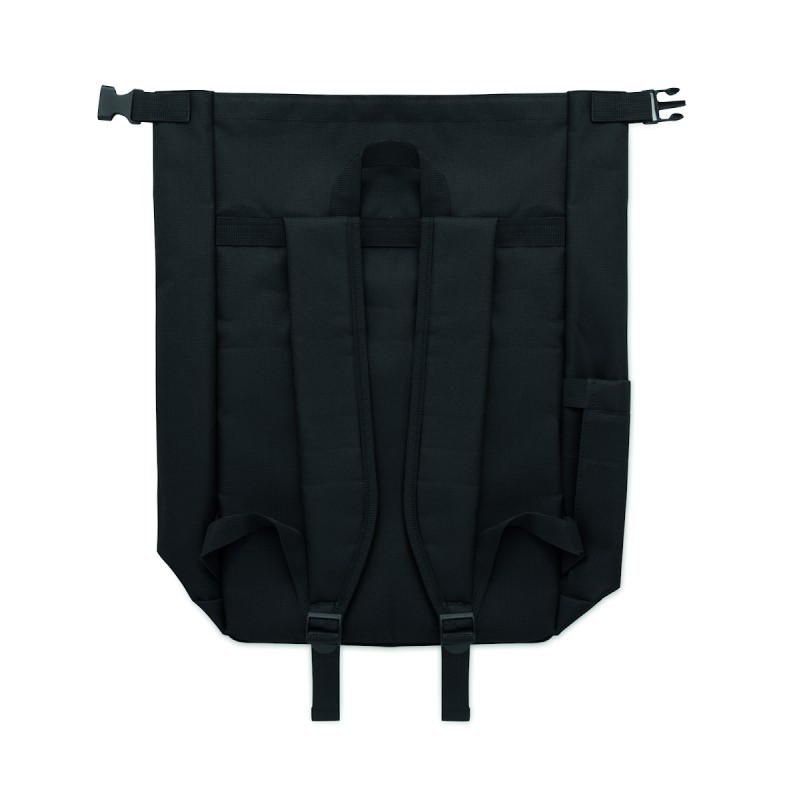 Sac à dos pour ordinateur portable de 15 pouces en polyester 600D RPET avec doublure matelassée en 210D RPET. Comprend une poche frontale zippée, une poche latérale élastique et des bretelles réglables.