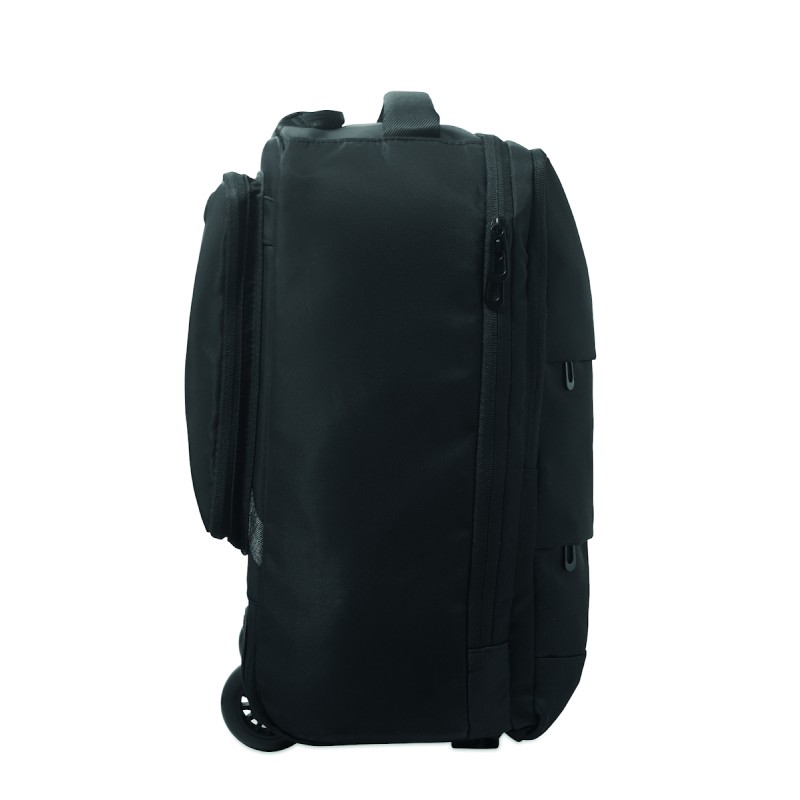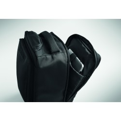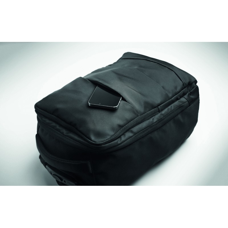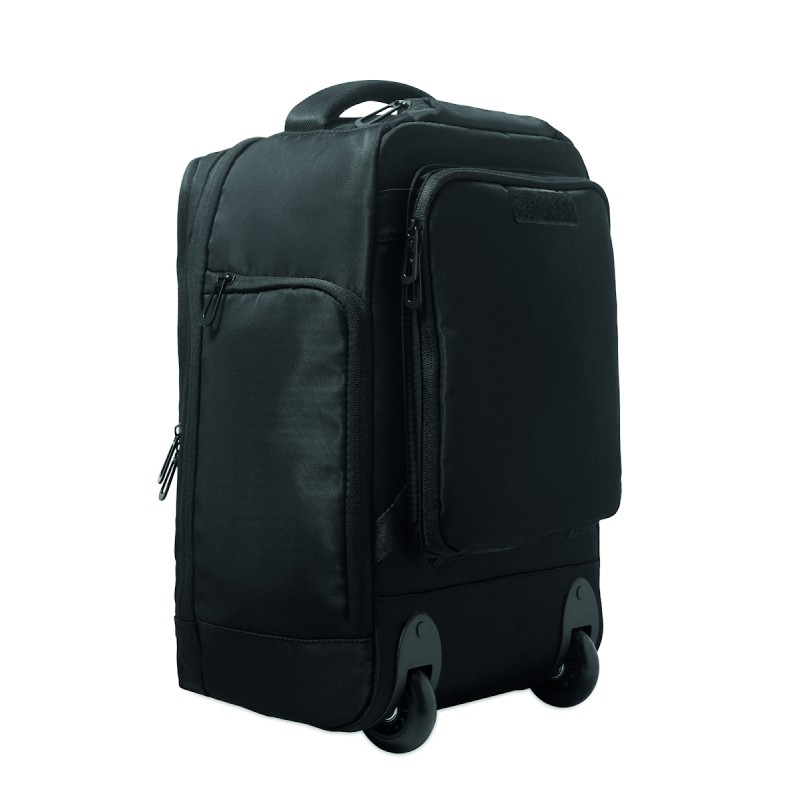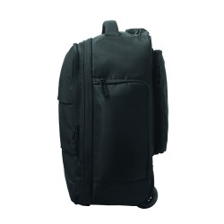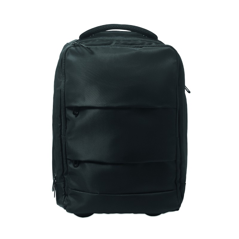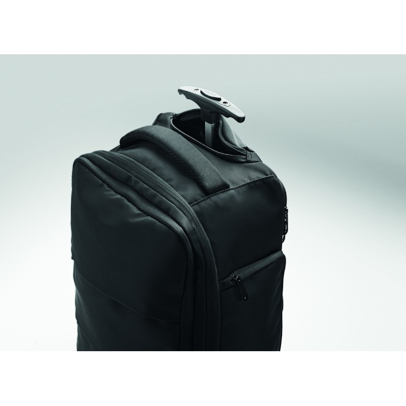 Sac à dos trolley en polyester RPET 290T, 3 poches avant zippées, compartiment rembourré pour ordinateur 15'', et section isotherme zippée. Dos et bretelles rembourrés et un compartiment arrière zippé.