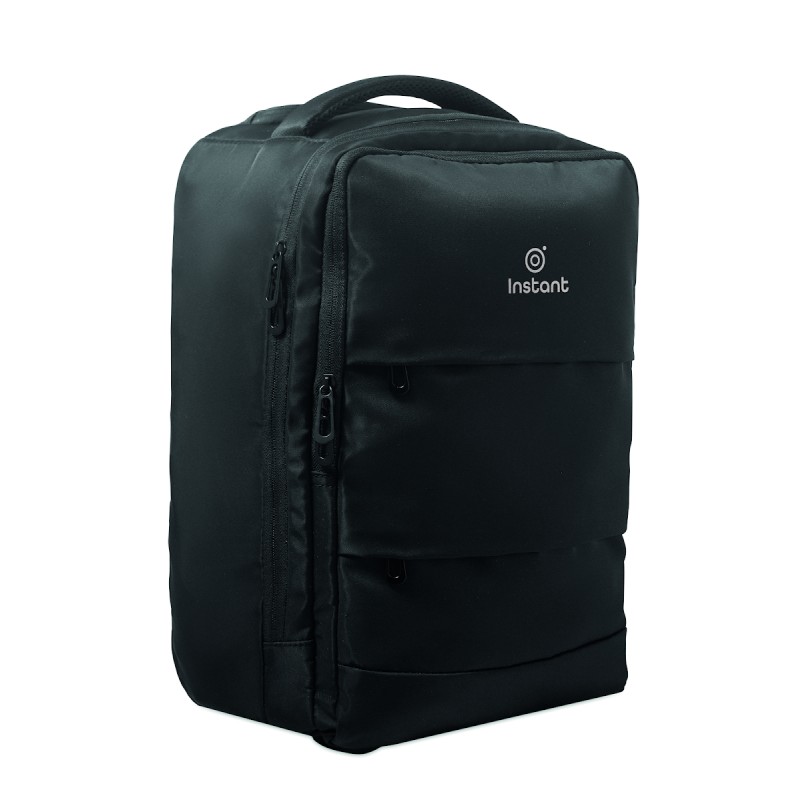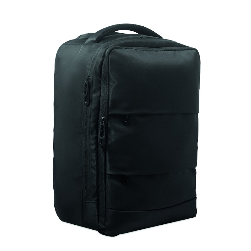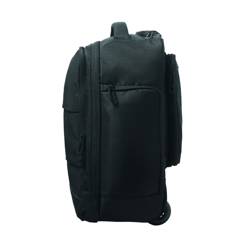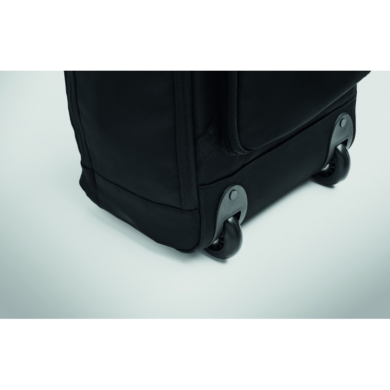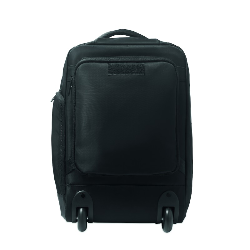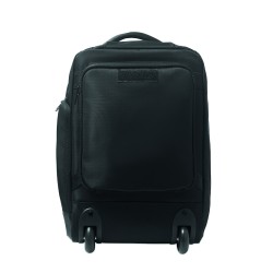 Sac à dos trolley en polyester RPET 290T, 3 poches avant zippées, compartiment rembourré pour ordinateur 15'', et section isotherme zippée. Dos et bretelles rembourrés et un compartiment arrière zippé.