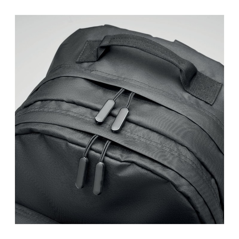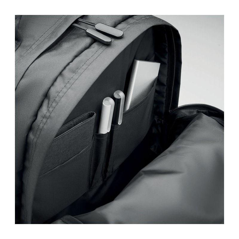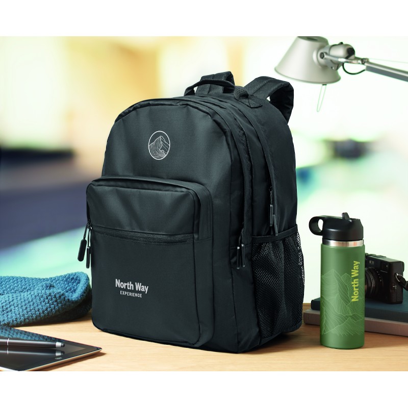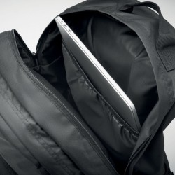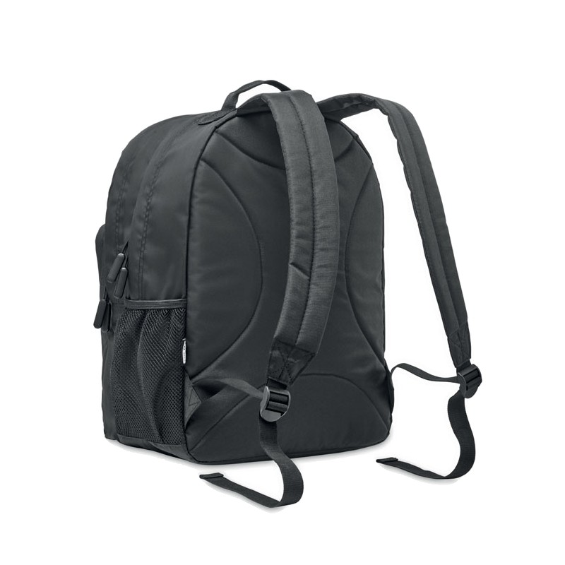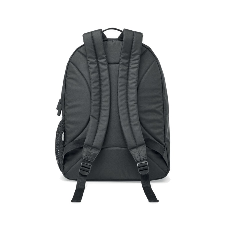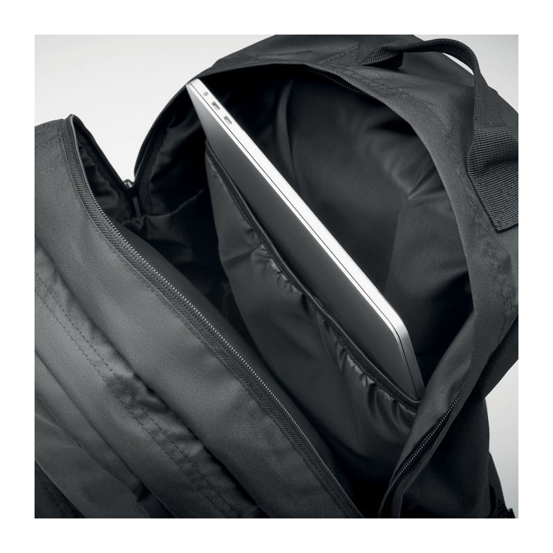 Sac à dos pour ordinateur portable 15'' en polyester 300D RPET. Comporte deux grands compartiments zippés, deux poches frontales zippées et une poche latérale en filet. Dos et bretelles rembourrés.