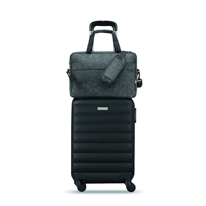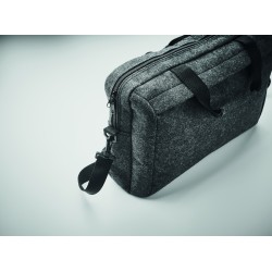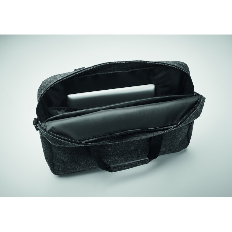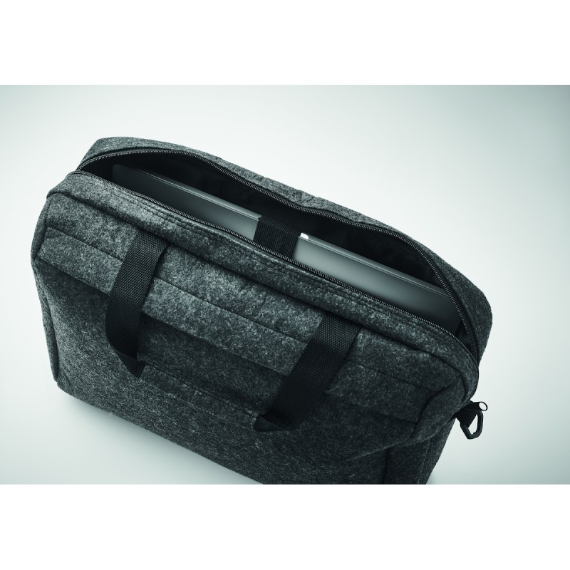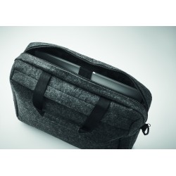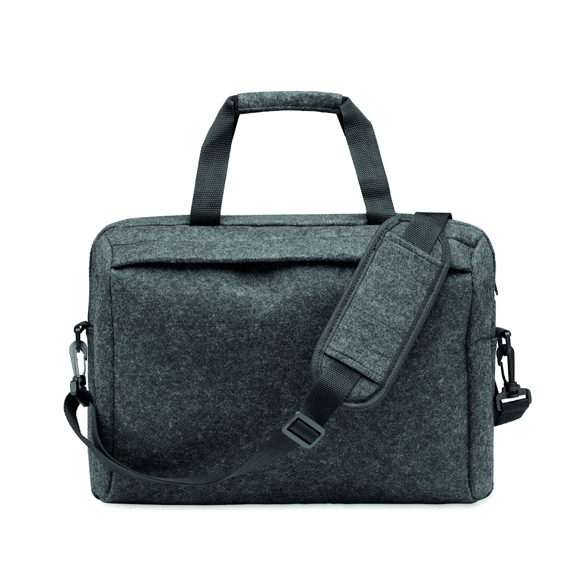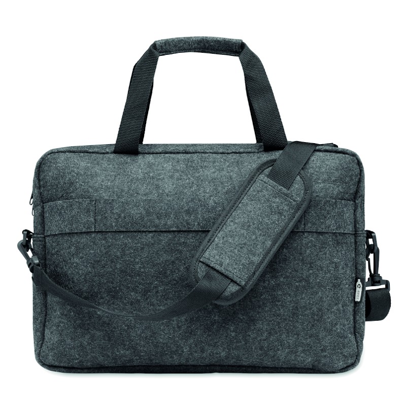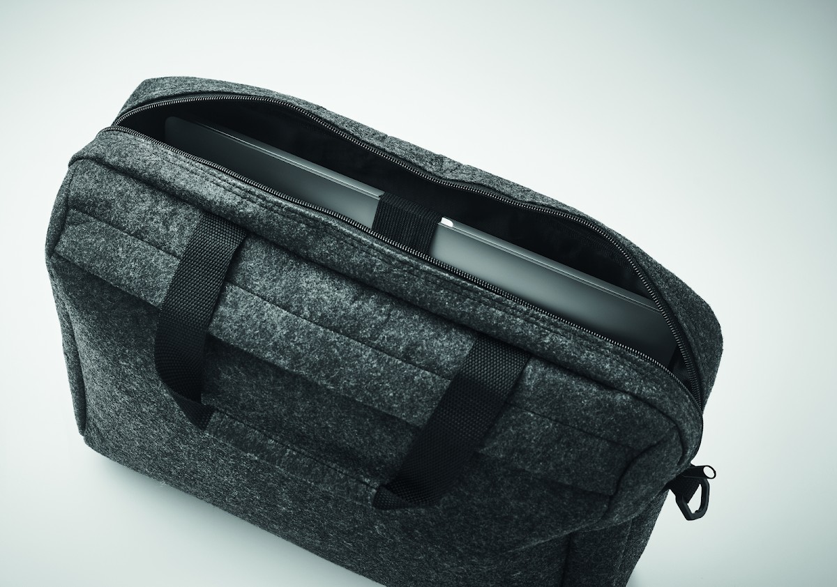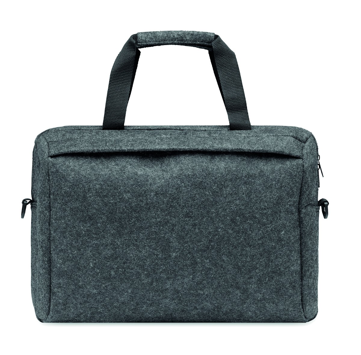 Sac à dos pour ordinateur portable de 15 pouces en feutre RPET comprenant un compartiment interne principal et une poche frontale zippée. Bandoulière détachable et réglable. Passant pour trolley au verso.