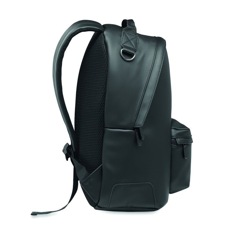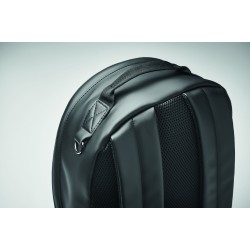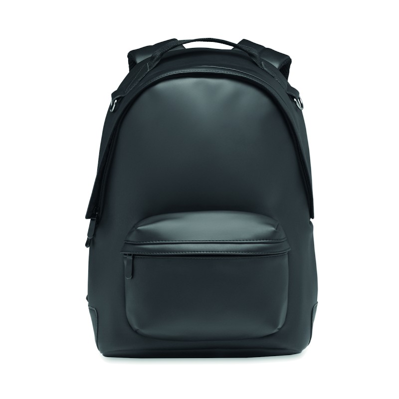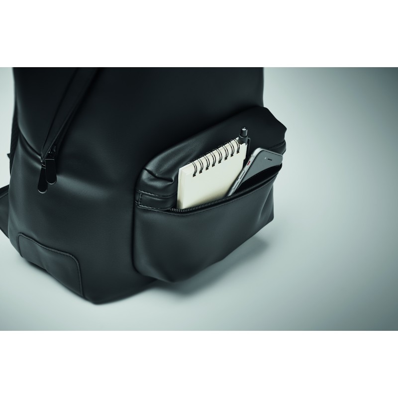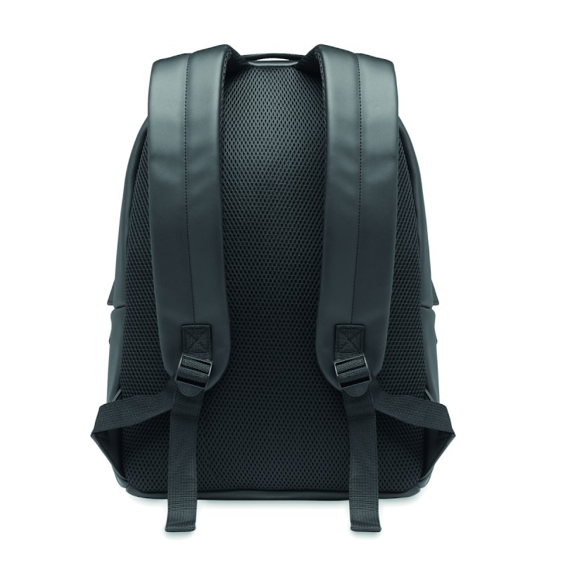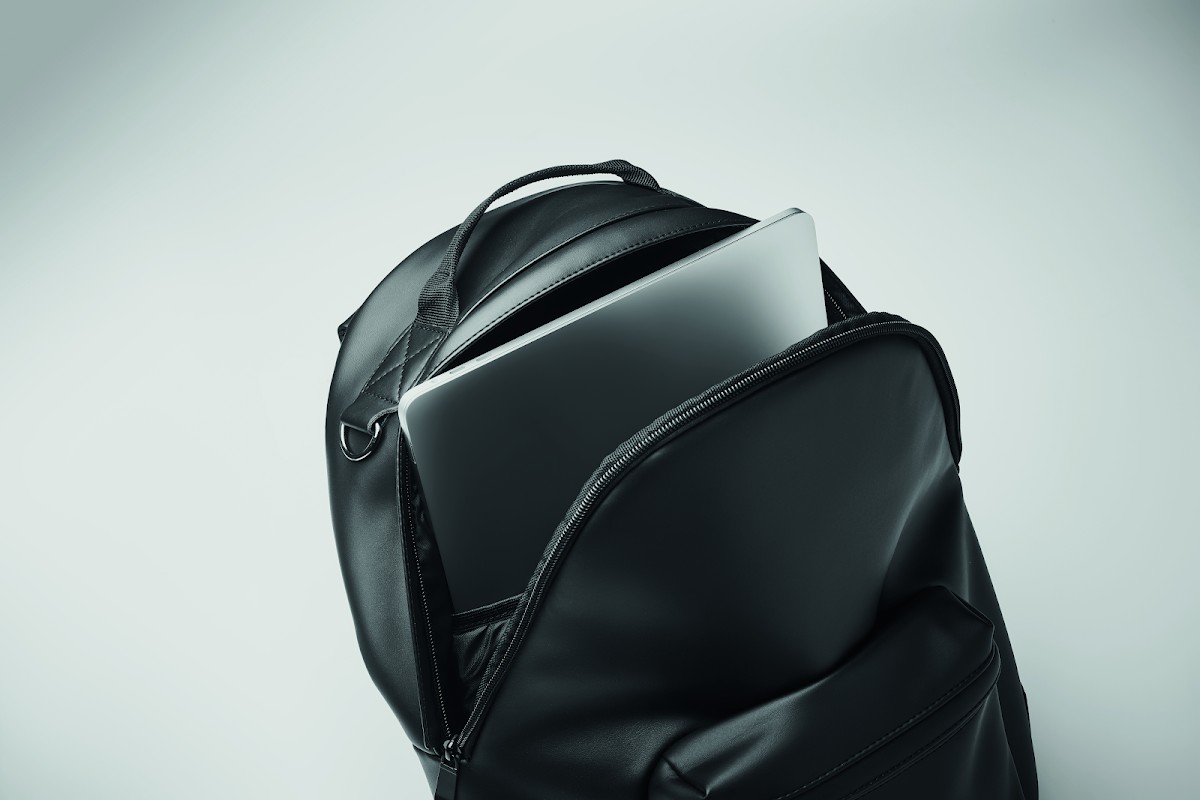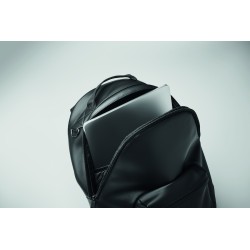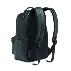 Sac à dos pour ordinateur portable 15 pouces en PU souple avec dos rembourré et base renforcée. Poche frontale zippée. La doublure est en 210D RPET.