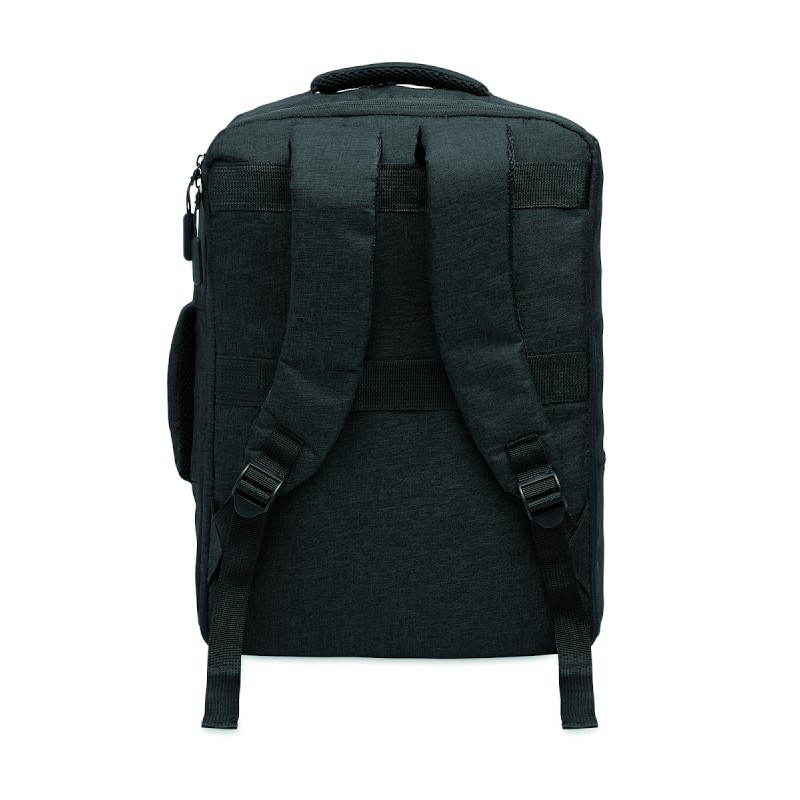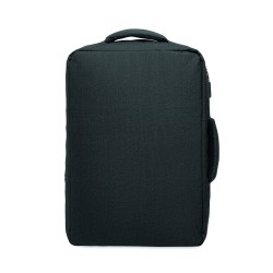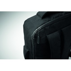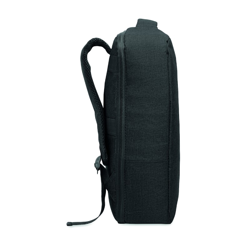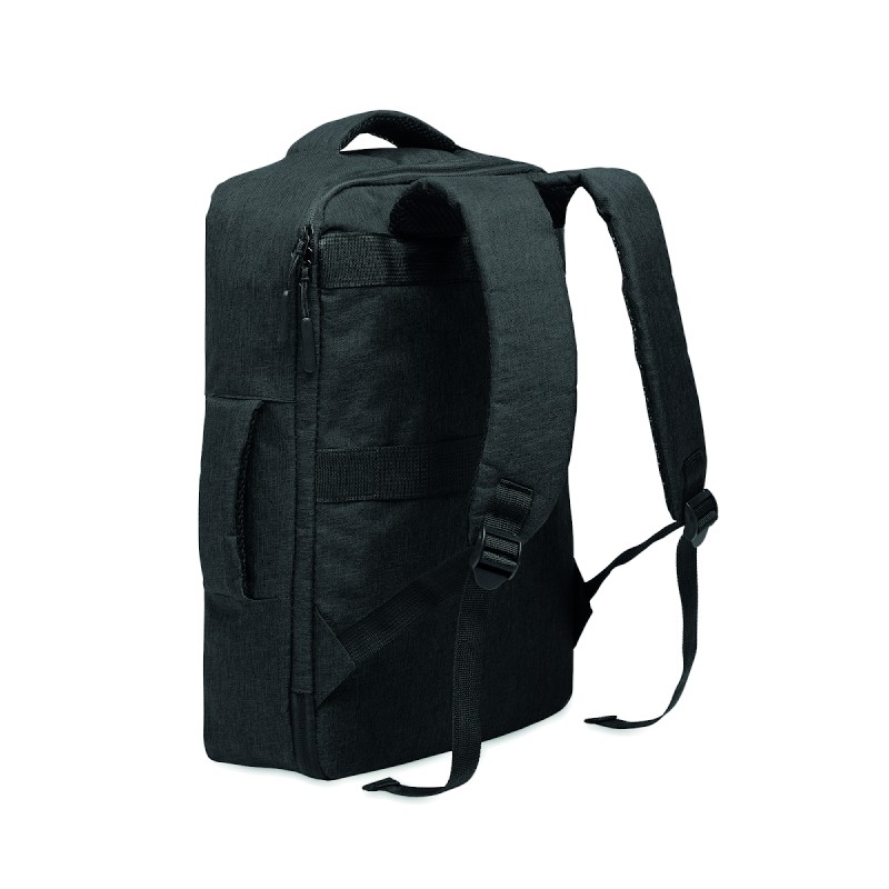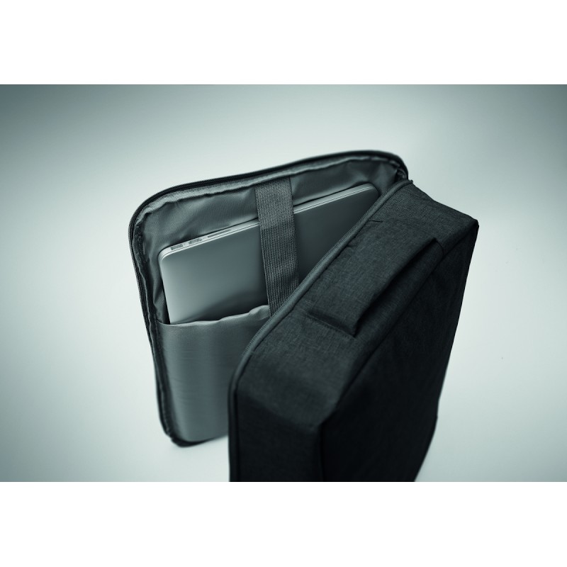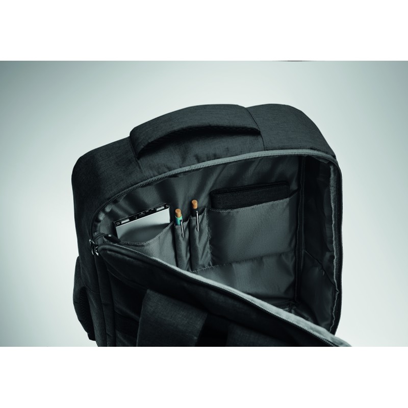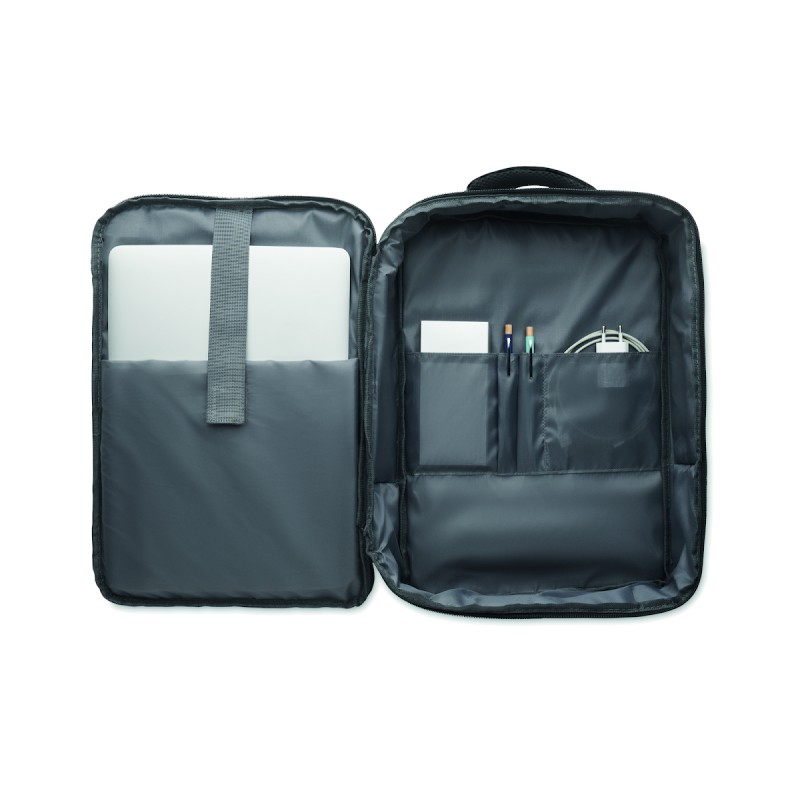 Sac à dos pour ordinateur de 15 '' en RPET 300D et doublure en RPET 210D. Comprend un compartiment pour ordinateur, 2 poches intérieures, 2 poches intérieures pour stylos et 2 poignées de transport rembourrées. Dos et bretelles rembourrés. Passant pour trolley au dos.