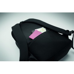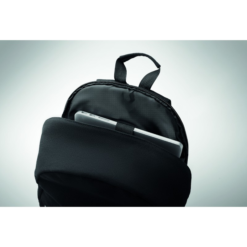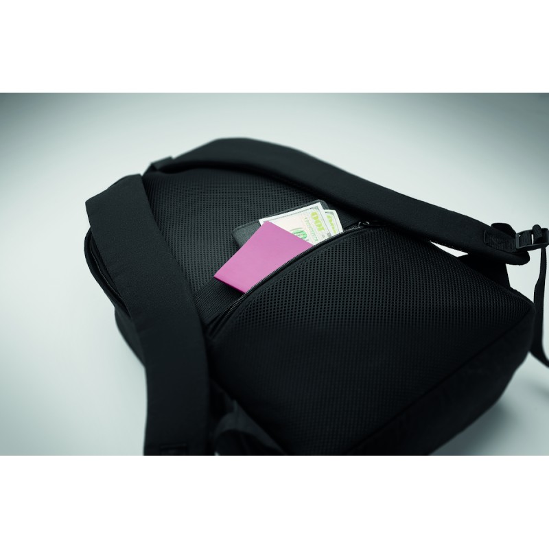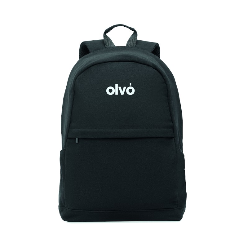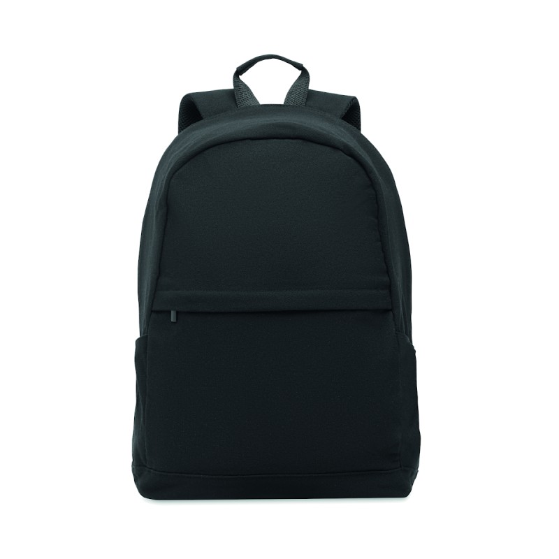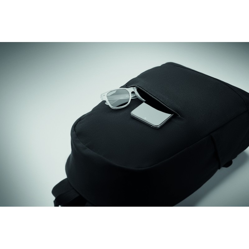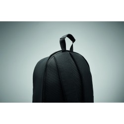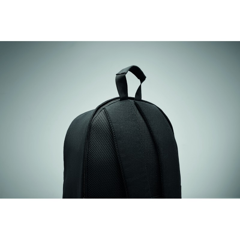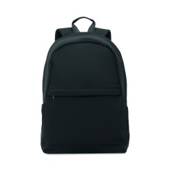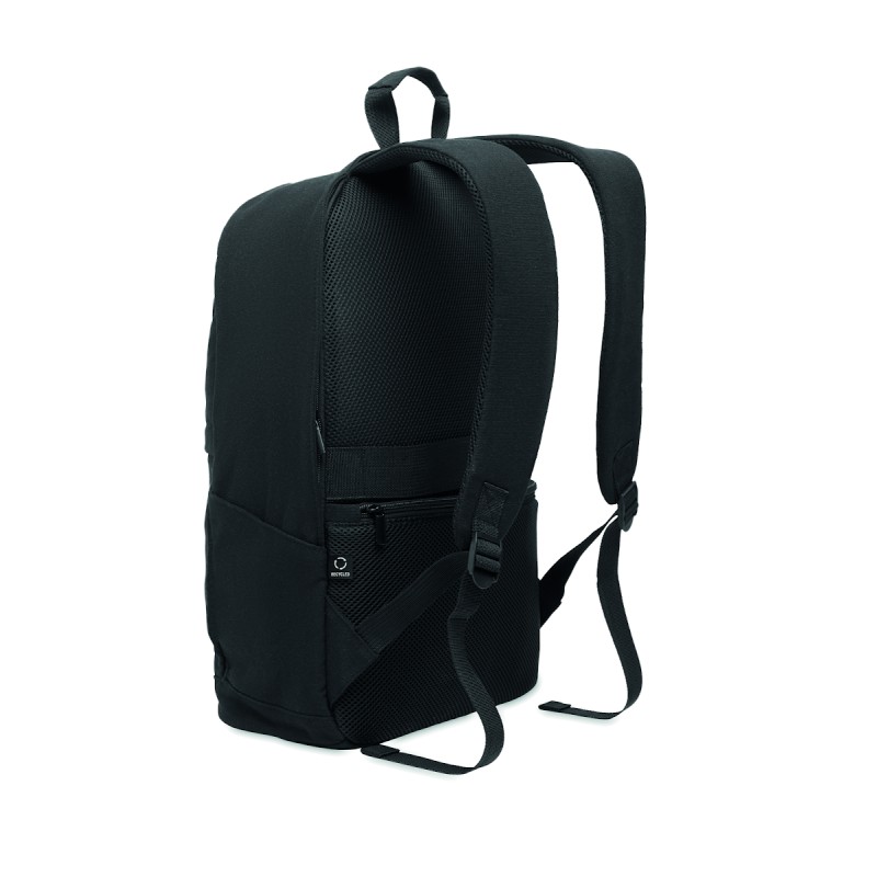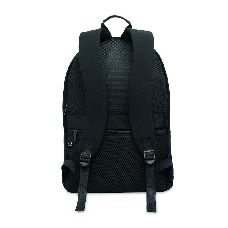 Sac à dos pour ordinateur portable de 15 pouces en coton recyclé de préconsommation et en polyester recyclé (70 %/30 %). Il est doté d'une poche frontale zippée et d'une poche arrière zippée. Dos et bretelles rembourrés. Porte-trolley au verso.