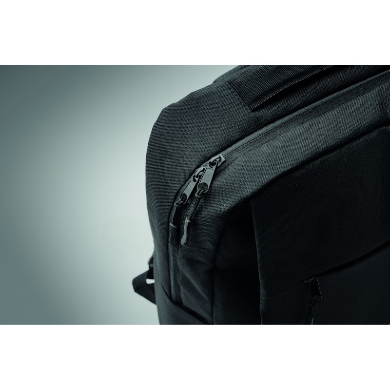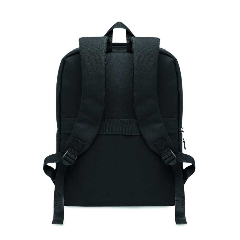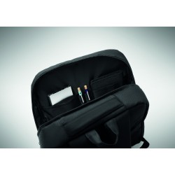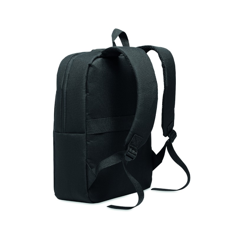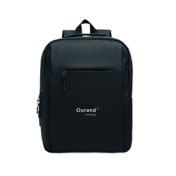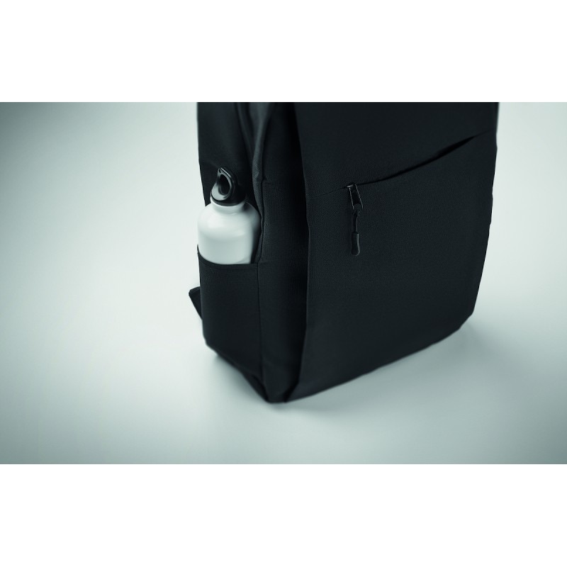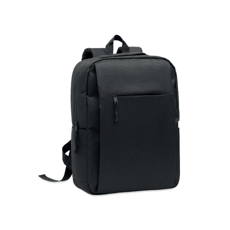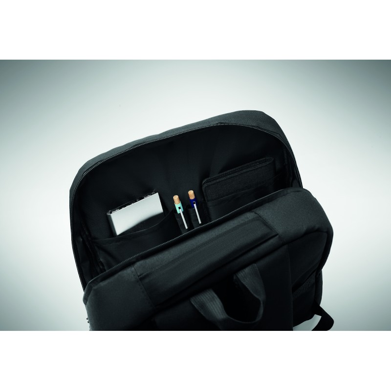 Sac à dos en polyester 600D RPET et doublure 210D. Avec un compartiment pour ordinateur de 15'', une poche extérieure zippée pour tablette 10'', 2 poches internes, 2 poches internes pour stylos, une poche frontale zippée. 2 poches latérales. Dos et bretelles rembourrés.