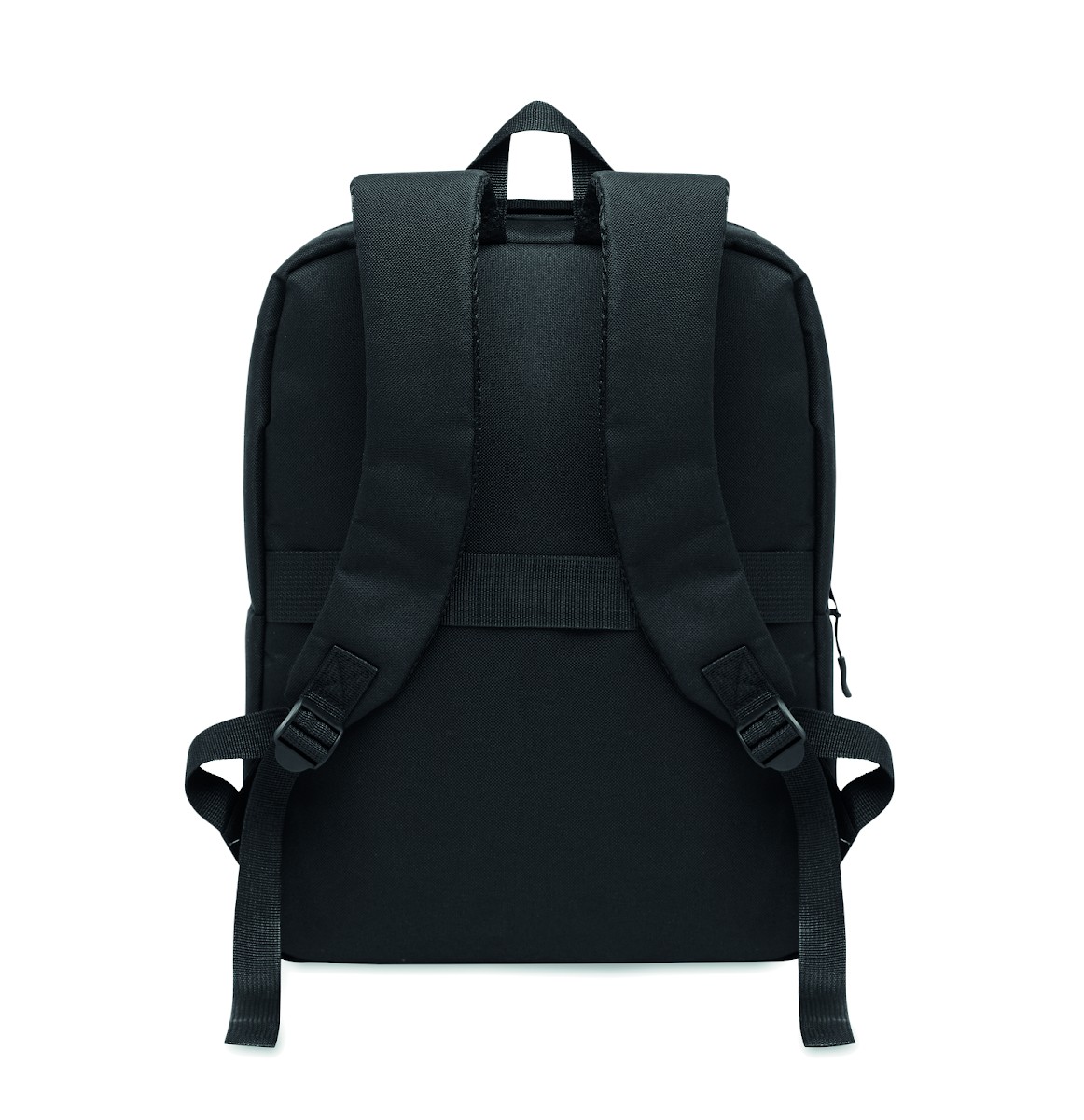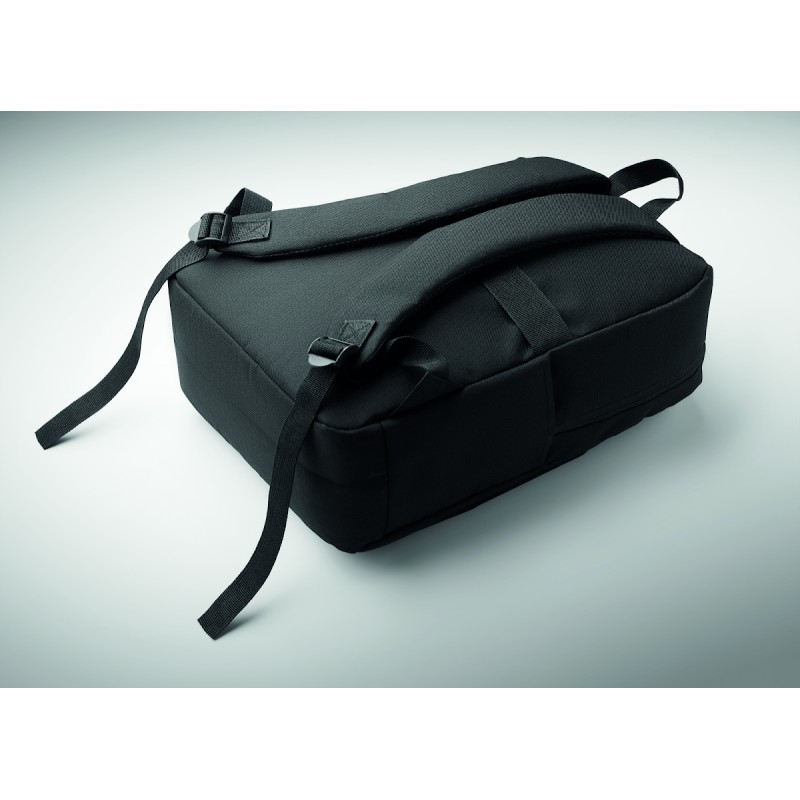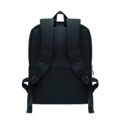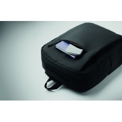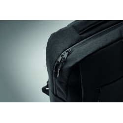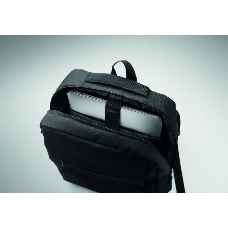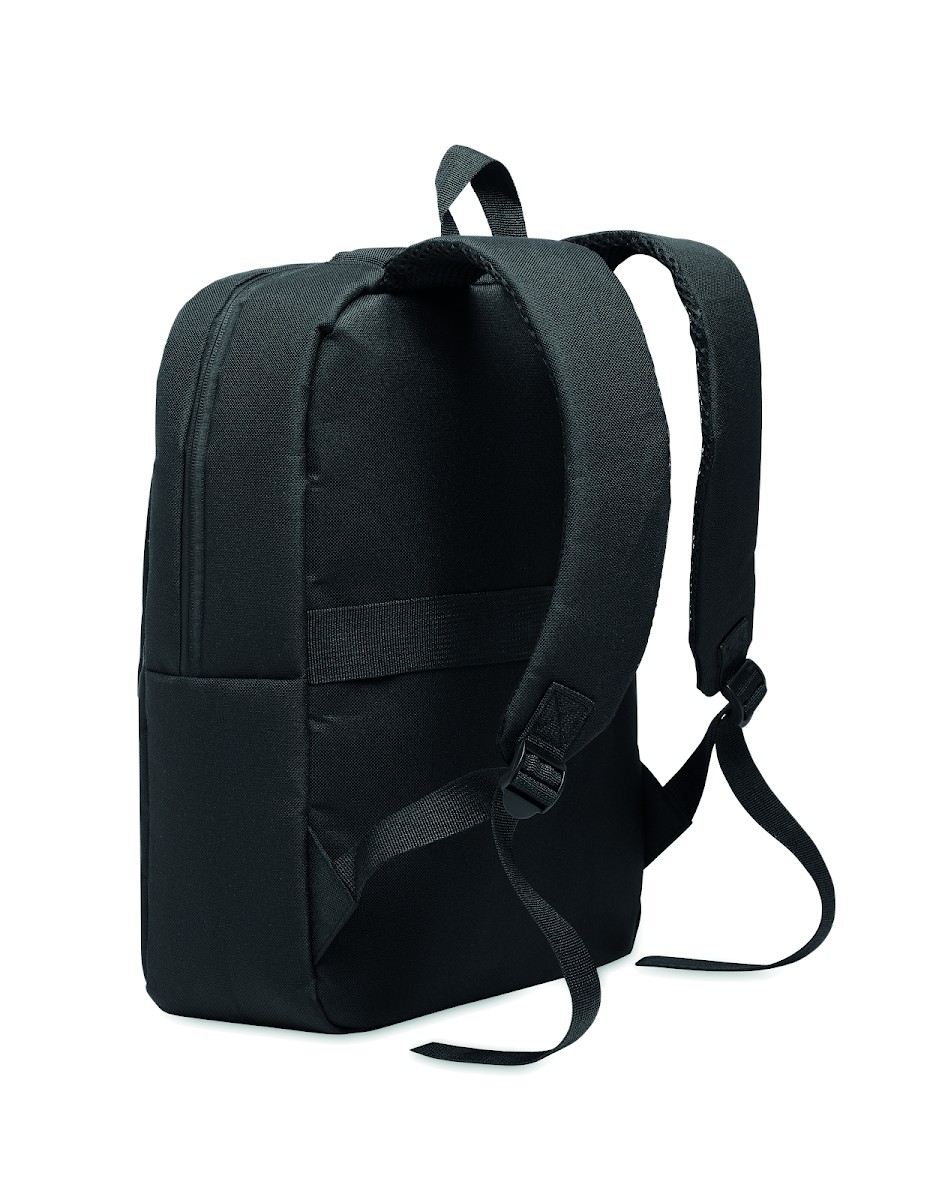 Sac à dos en polyester 600D RPET et doublure 210D. Avec un compartiment pour ordinateur de 15'', une poche extérieure zippée pour tablette 10'', 2 poches internes, 2 poches internes pour stylos, une poche frontale zippée. 2 poches latérales. Dos et bretelles rembourrés.