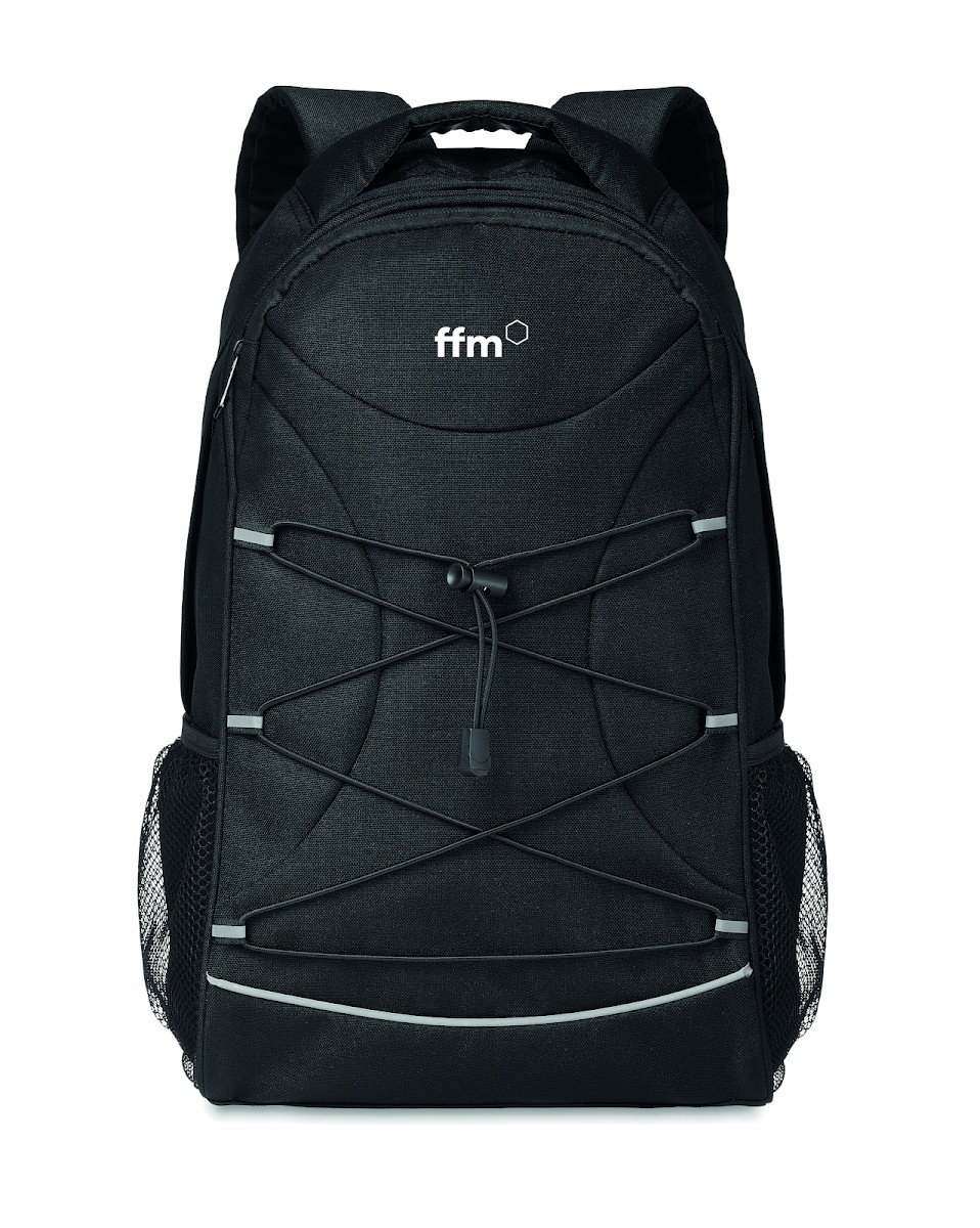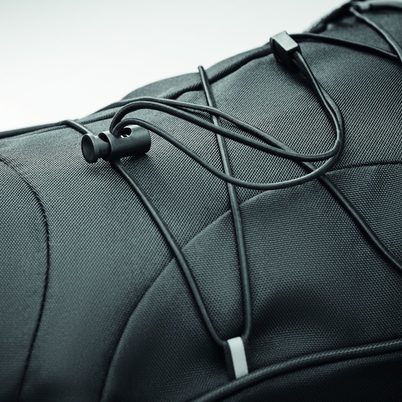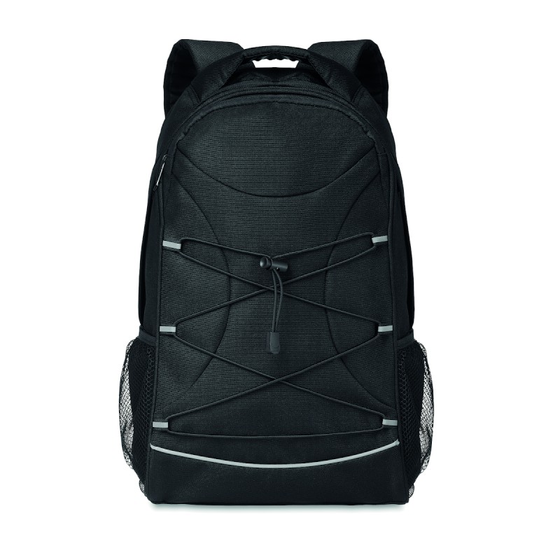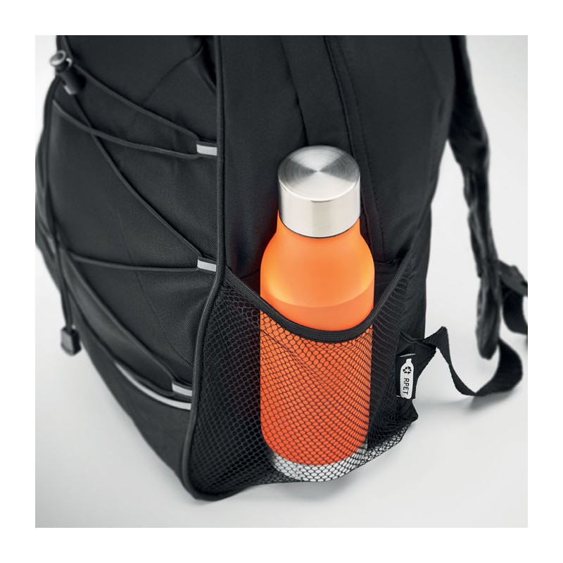 Sac à dos en RPET 600D avec cordons sombres à l'avant et attributs réfléchissants sur le panneau avant. Poches en filet des deux côtés.