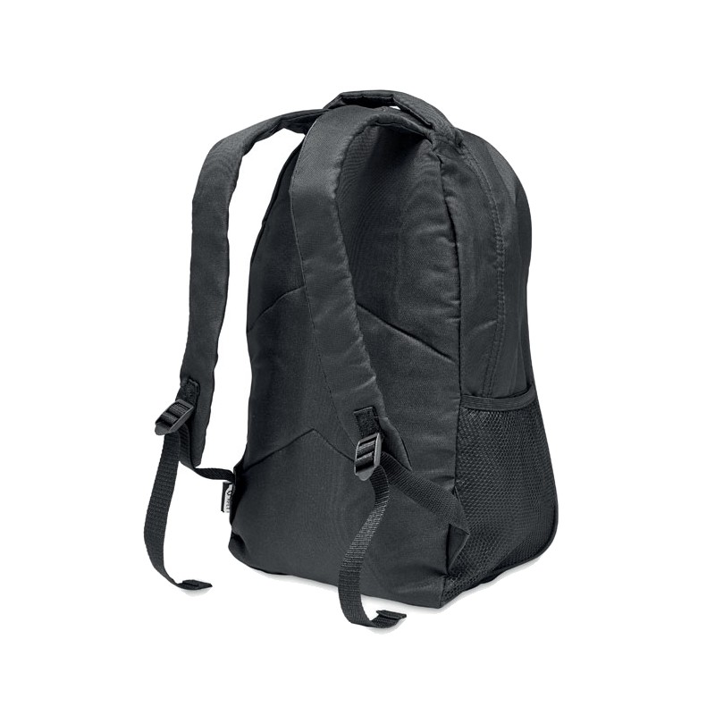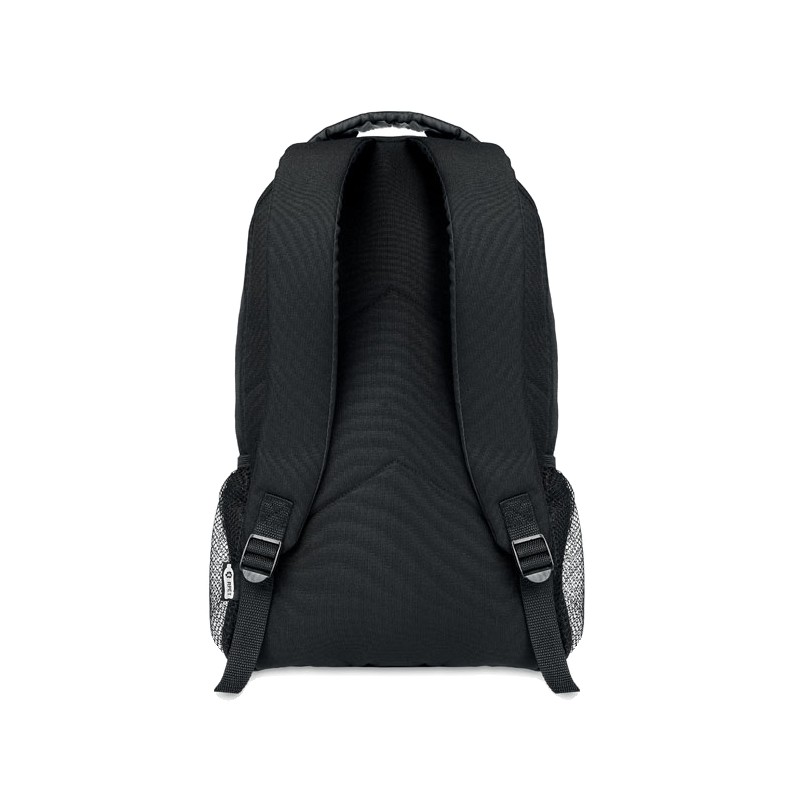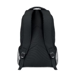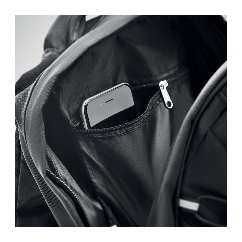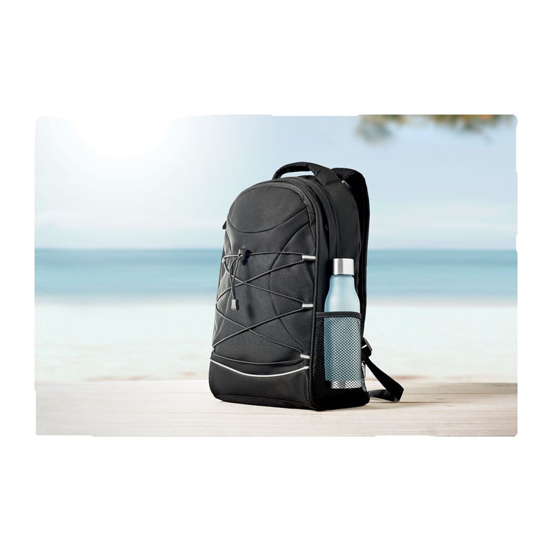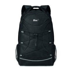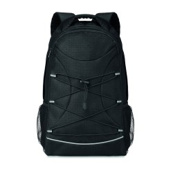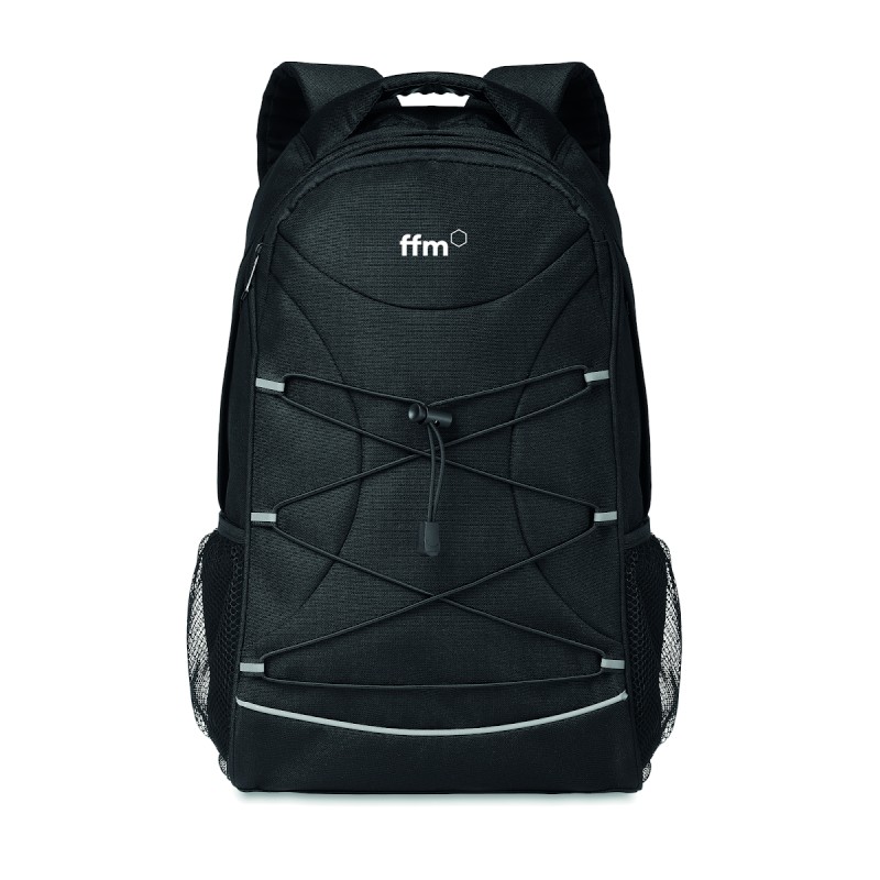 Sac à dos en RPET 600D avec cordons sombres à l'avant et attributs réfléchissants sur le panneau avant. Poches en filet des deux côtés.