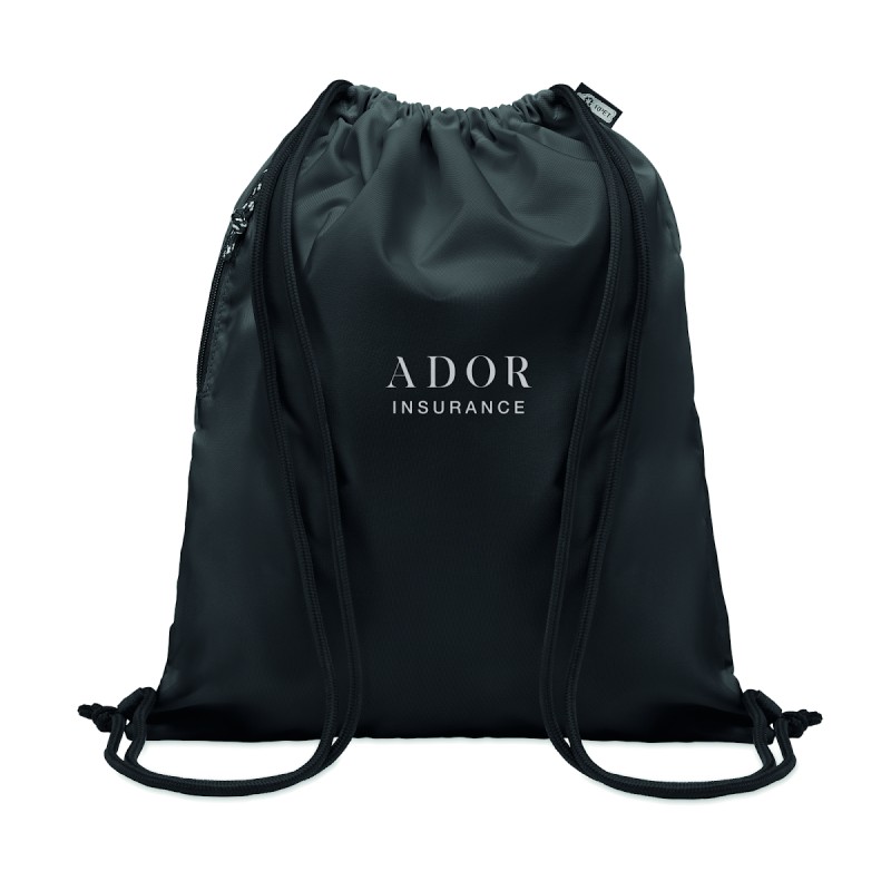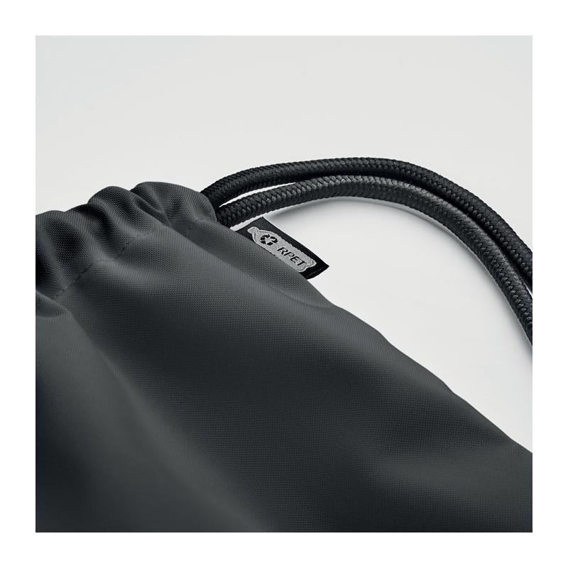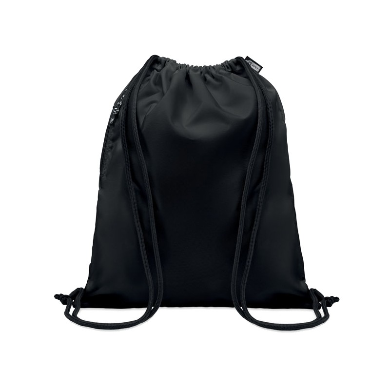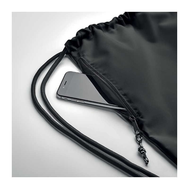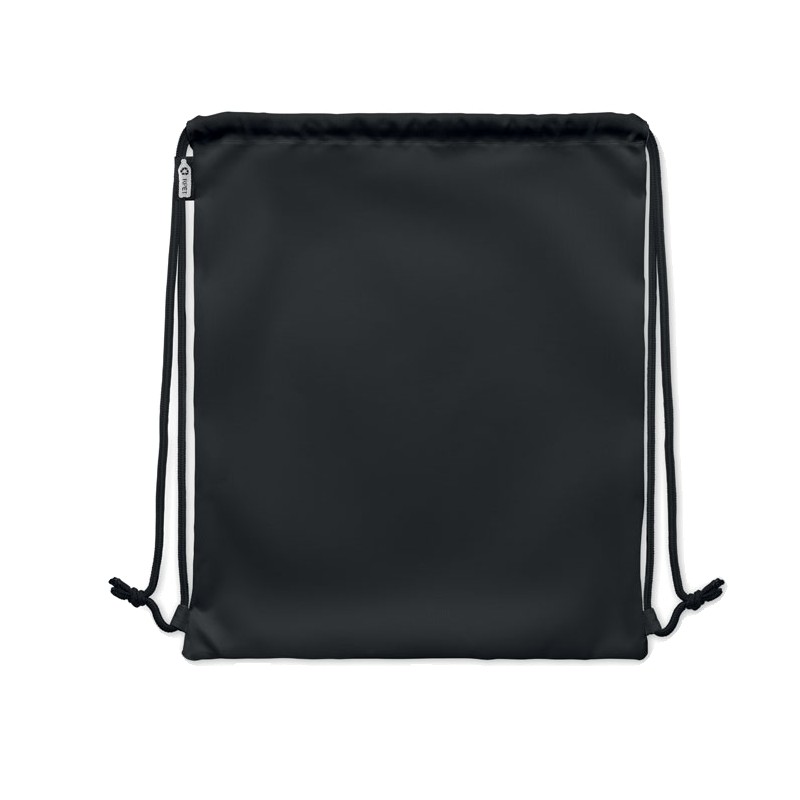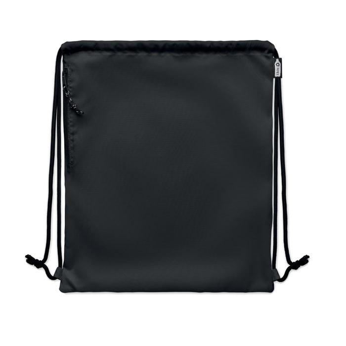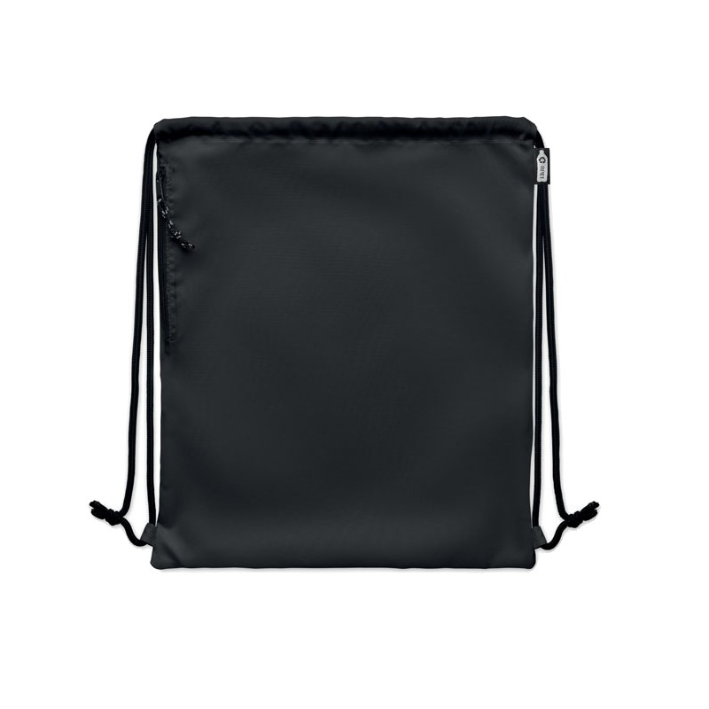 Grand sac cordon en polyester 300D RPET avec poche extérieure latérale zippé. Cordons épais.