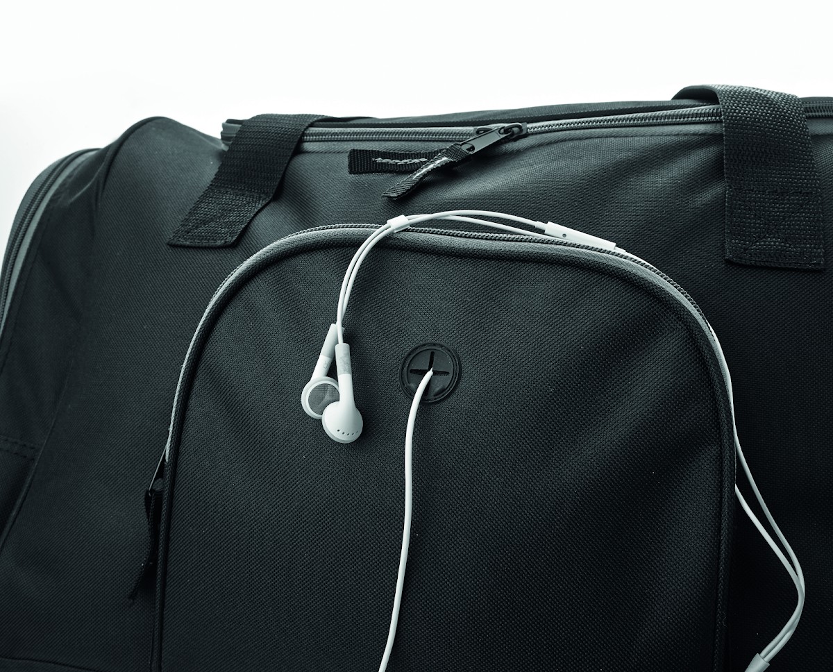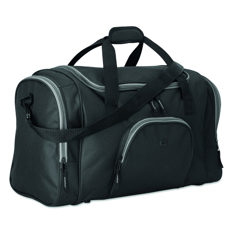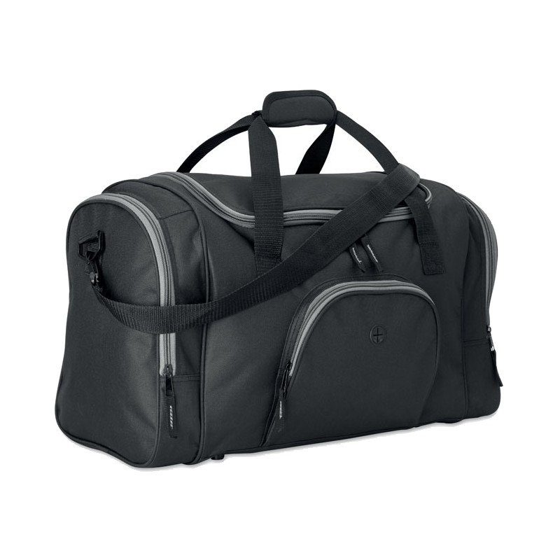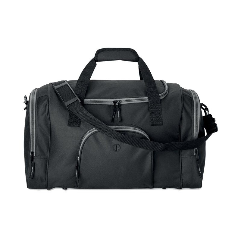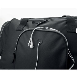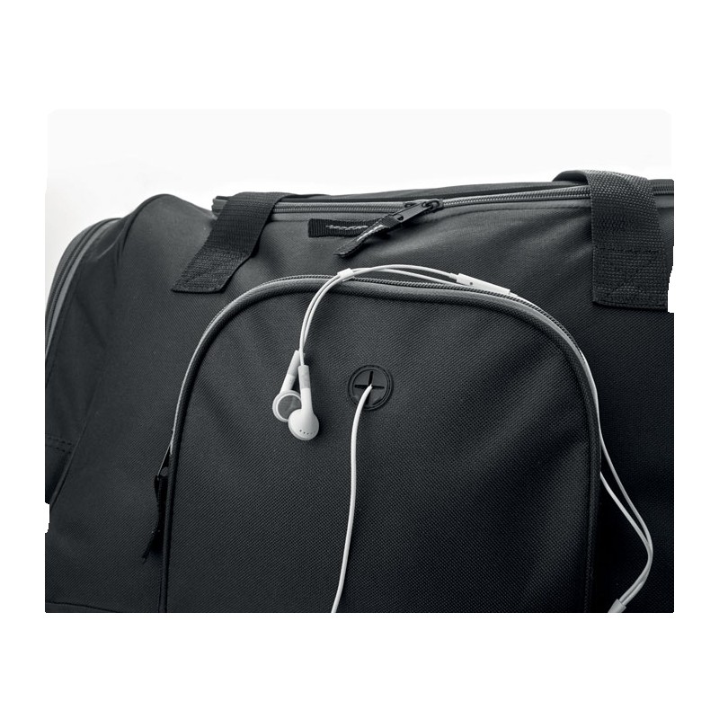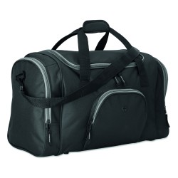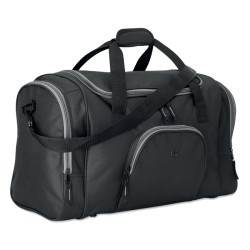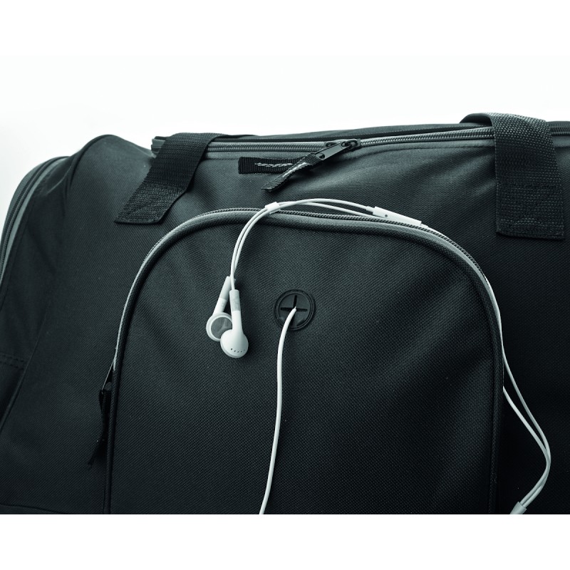Sac de sport en polyester 600D avec 2 compartiments latéraux zippés et un frontal permettant de passage d'oreillettes. Bandoulière amovible et ajustable.