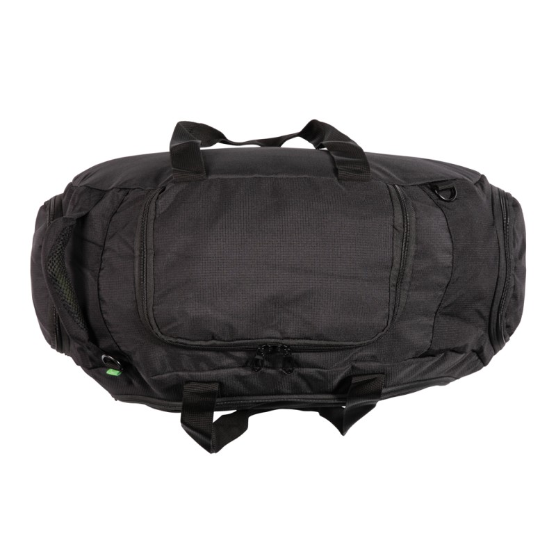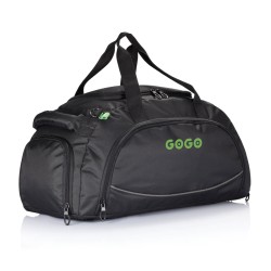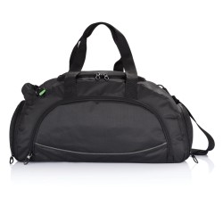 Sac de sport 600D et ripstop, poche zippée sur le dessus et rangements à l’intérieur, pochette sur le côté, poche pour chaussures, poignée et bandoulière, 4 supports en dessous, sans PVC.