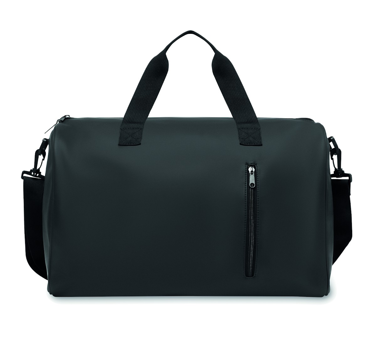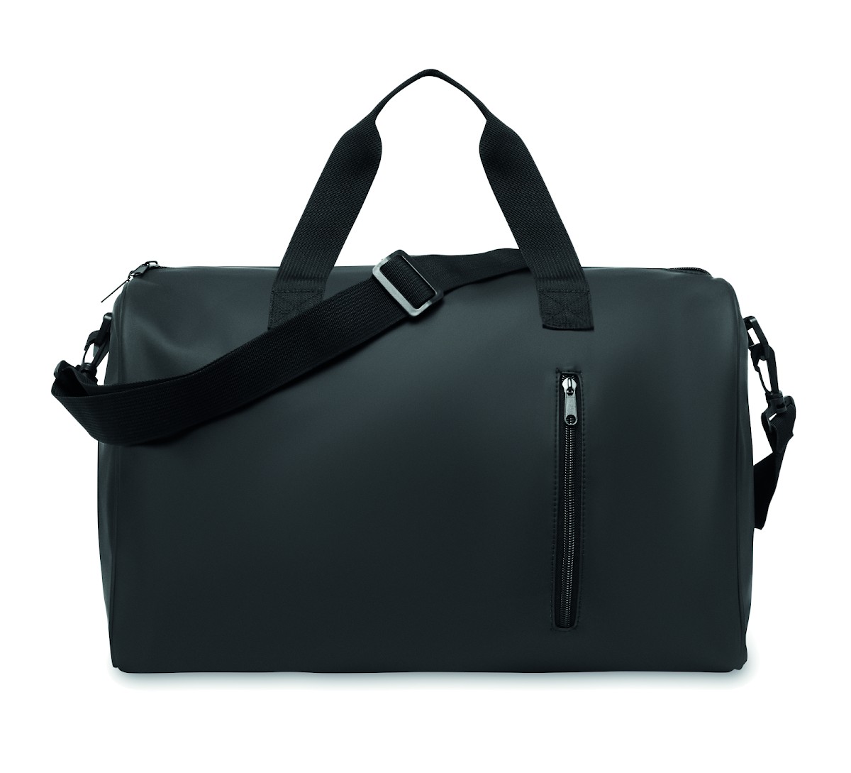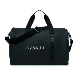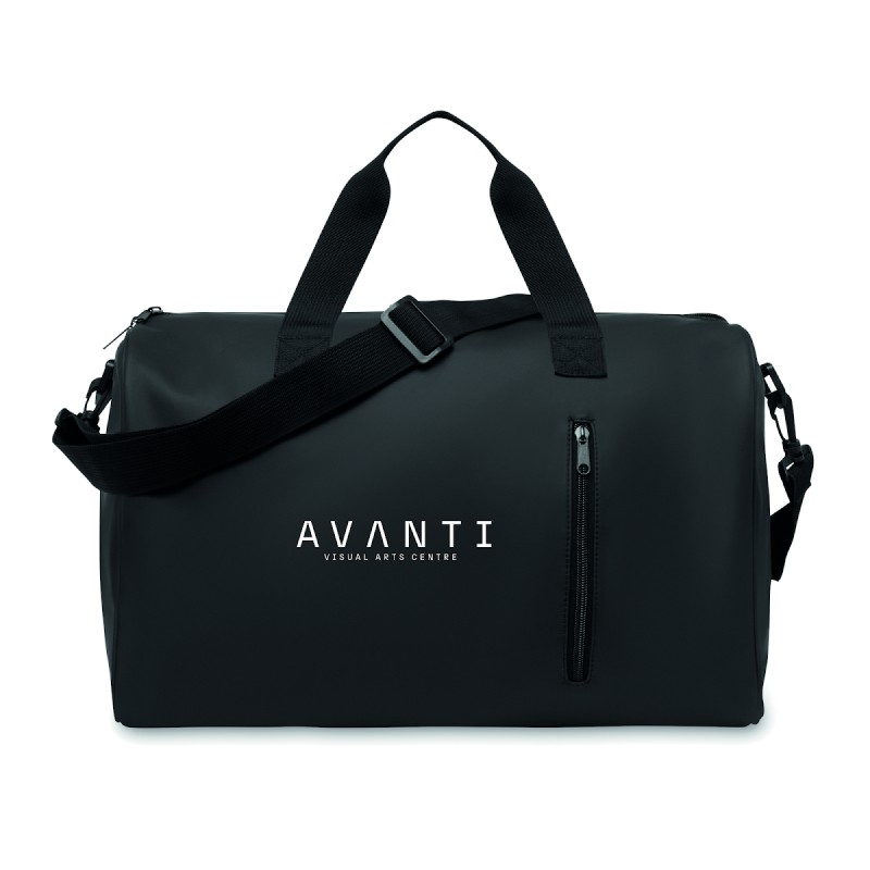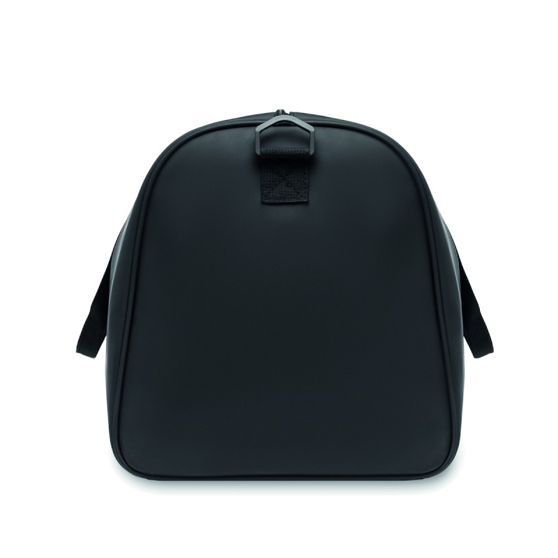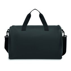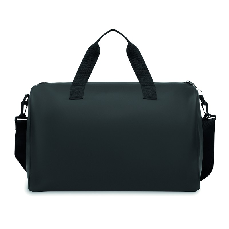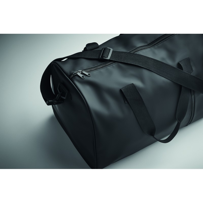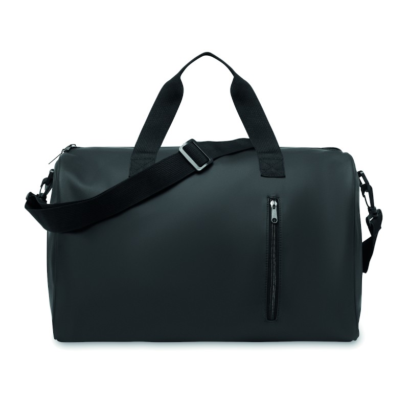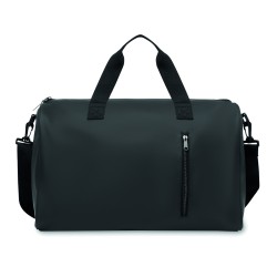 Sac de sport en PU souple avec renfort inférieur en mousse. Un compartiment principal, une poche frontale zippée. doublure en polyester 210D RPET. 2 poignées et une bandoulière réglable et amovible