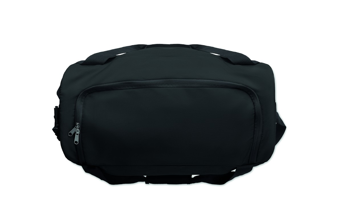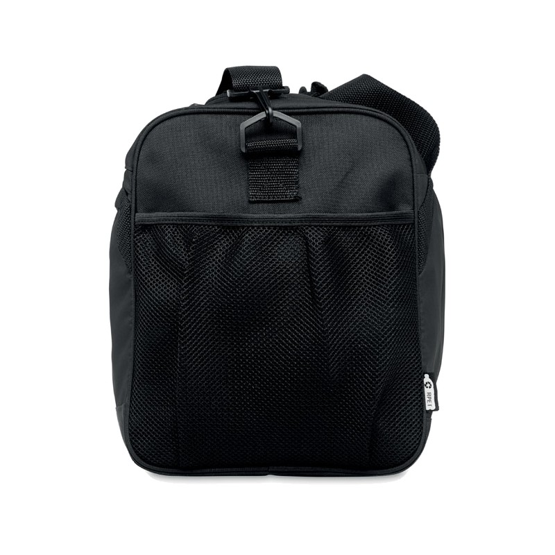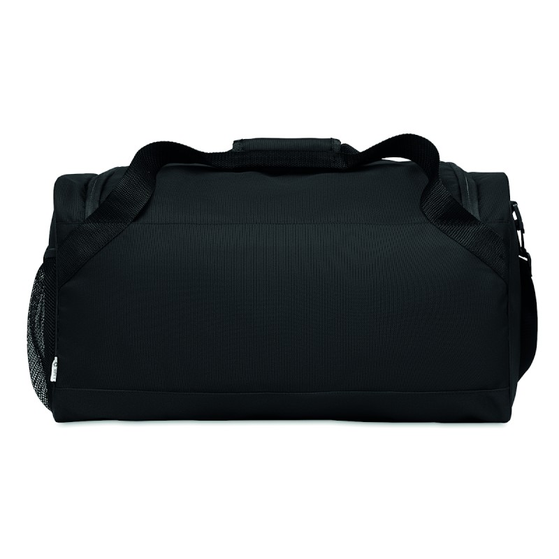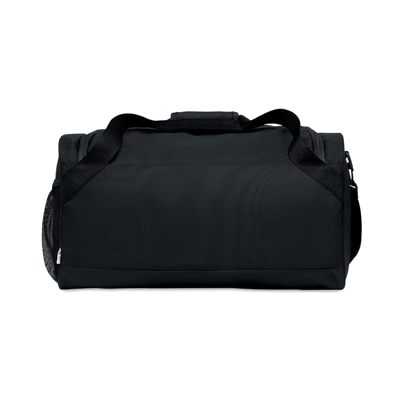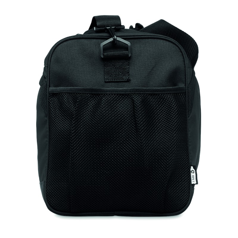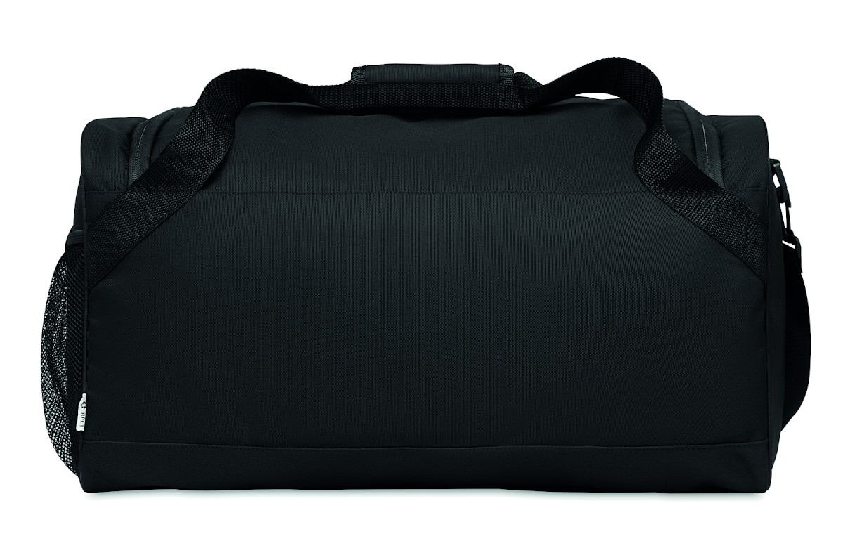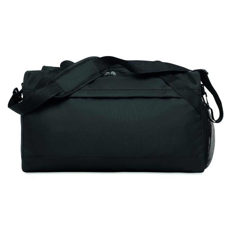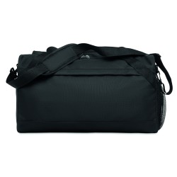 Sac de sport ou de voyage en RPET 600D avec grande poche frontale à fermeture éclair, poche intérieure à fermeture éclair et bandoulière réglable et amovible.