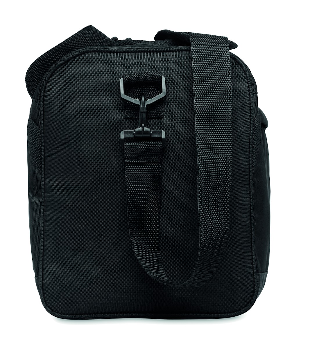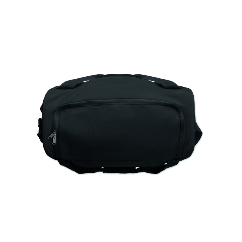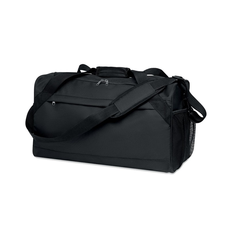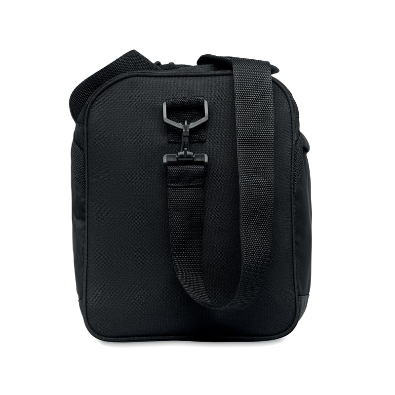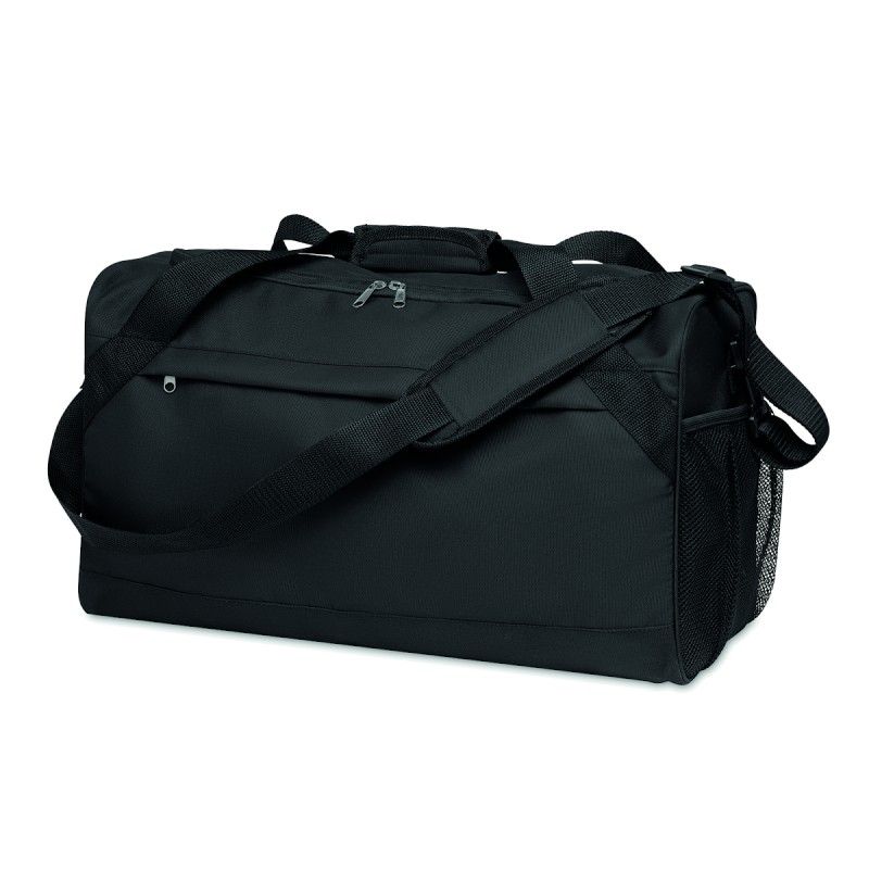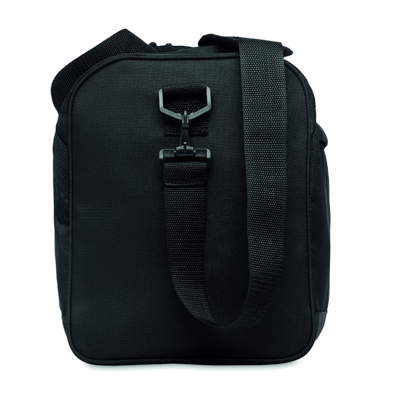 Sac de sport ou de voyage en RPET 600D avec grande poche frontale à fermeture éclair, poche intérieure à fermeture éclair et bandoulière réglable et amovible.