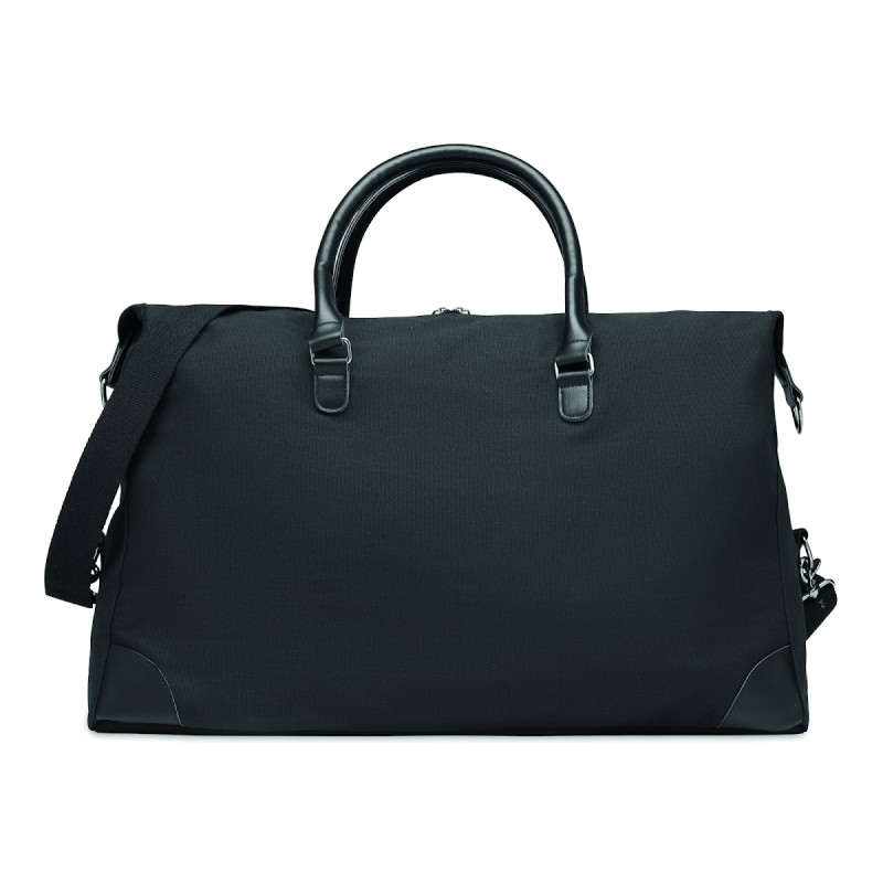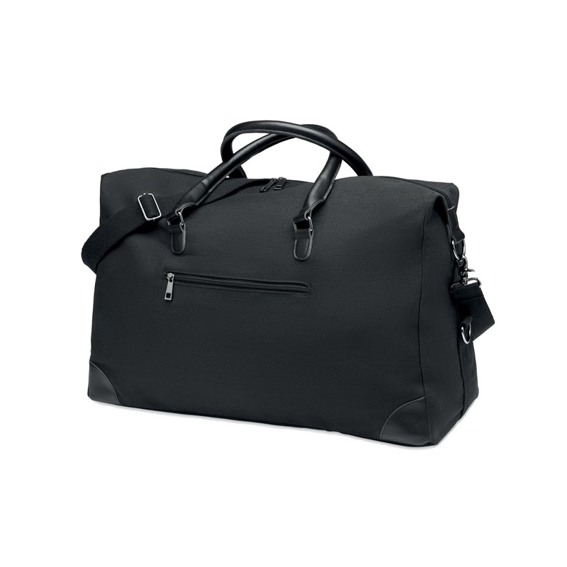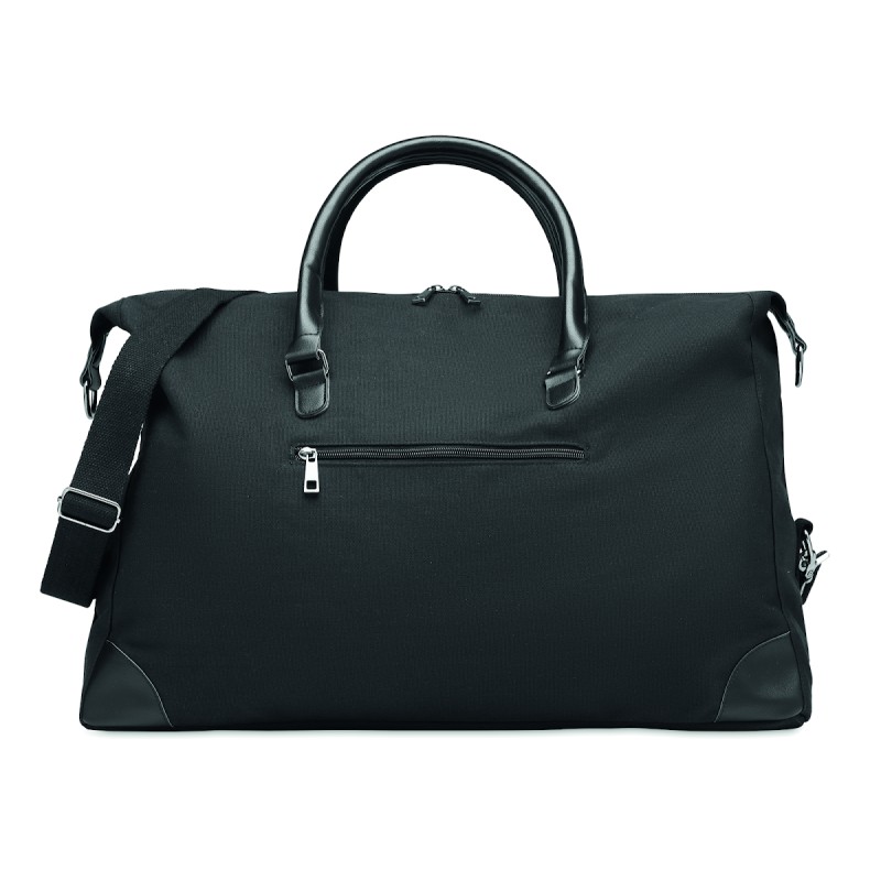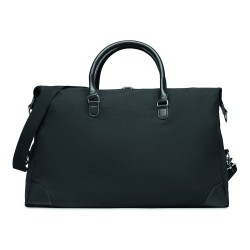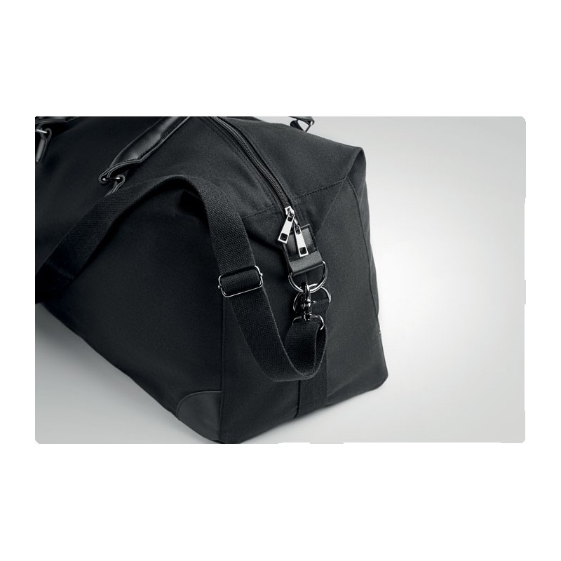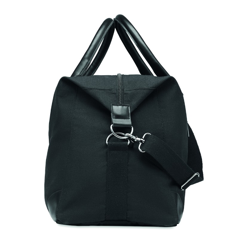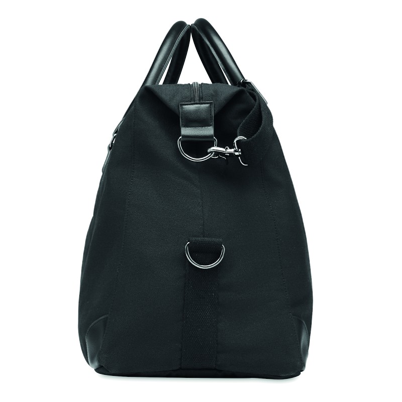 Sac week-end en toile 340 gr/m² avec détails en PU recyclé. La doublure est en RPET 210D. Sangles solides, réglables et détachables incluses. Taille parfaite pour un bagage à main.