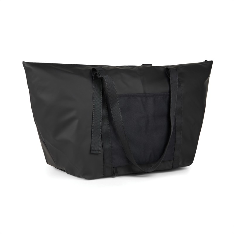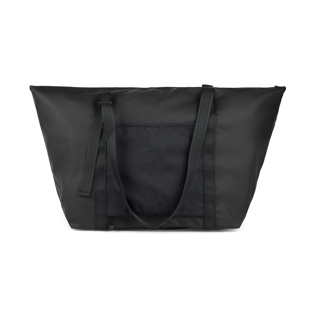 Compagnon de voyage idéal, ce sac de week-end est fabriqué en polyester certifié GRS ultra-léger et recouvert d'un élégant revêtement en PU. Il suffit de le plier et de le fixer à l'aide de la sangle et de la boucle pour le ranger de manière compacte lorsqu'il n'est pas utilisé. Il est doté d'une poche extérieure astucieuse qui se transforme en une pochette trolley sécurisée vous permettant de le glisser sur une valise à roulettes ou un trolley. Bretelles réglables pour un transport à la main ou sur l'épaule. Une poche intérieure plus petite permet de ranger les objets essentiels. Certifié par GRS (Global Recycled Standard), la certification GRS garantit que l'ensemble de la chaîne d'approvisionnement des matériaux recyclés est certifiée. Le contenu recyclé total est basé sur le poids total du produit. Ce produit contient 52 % de polyester recyclé certifié GRS.